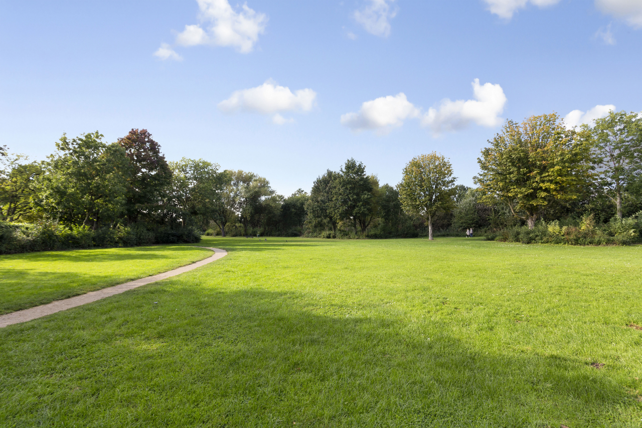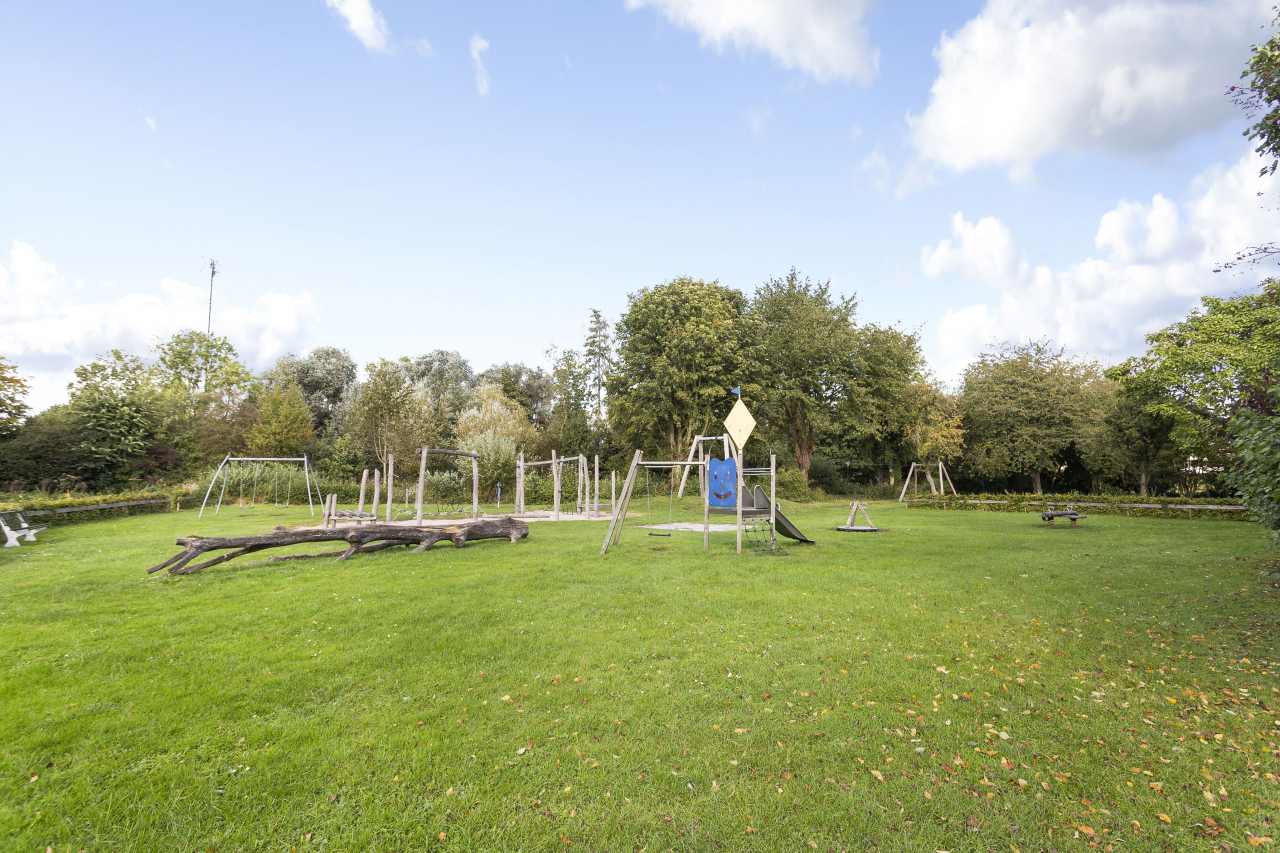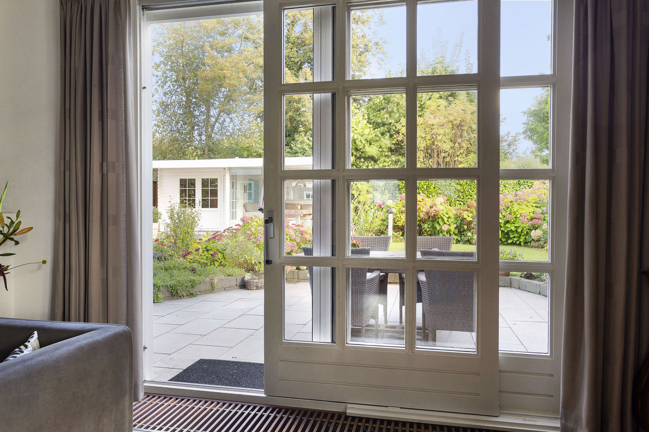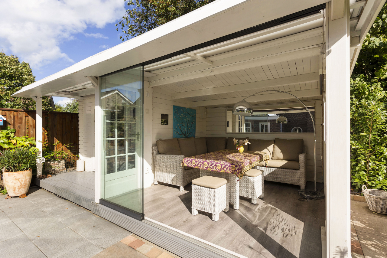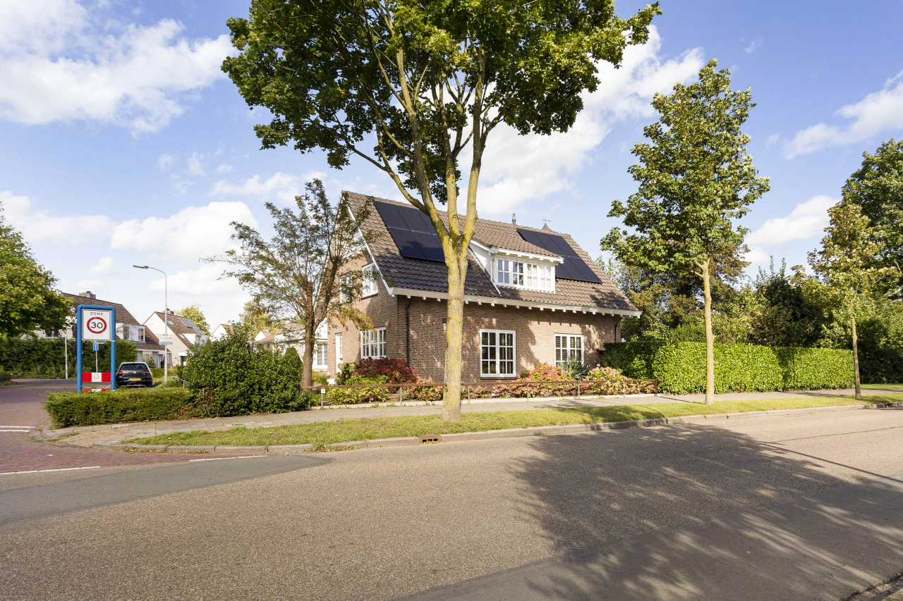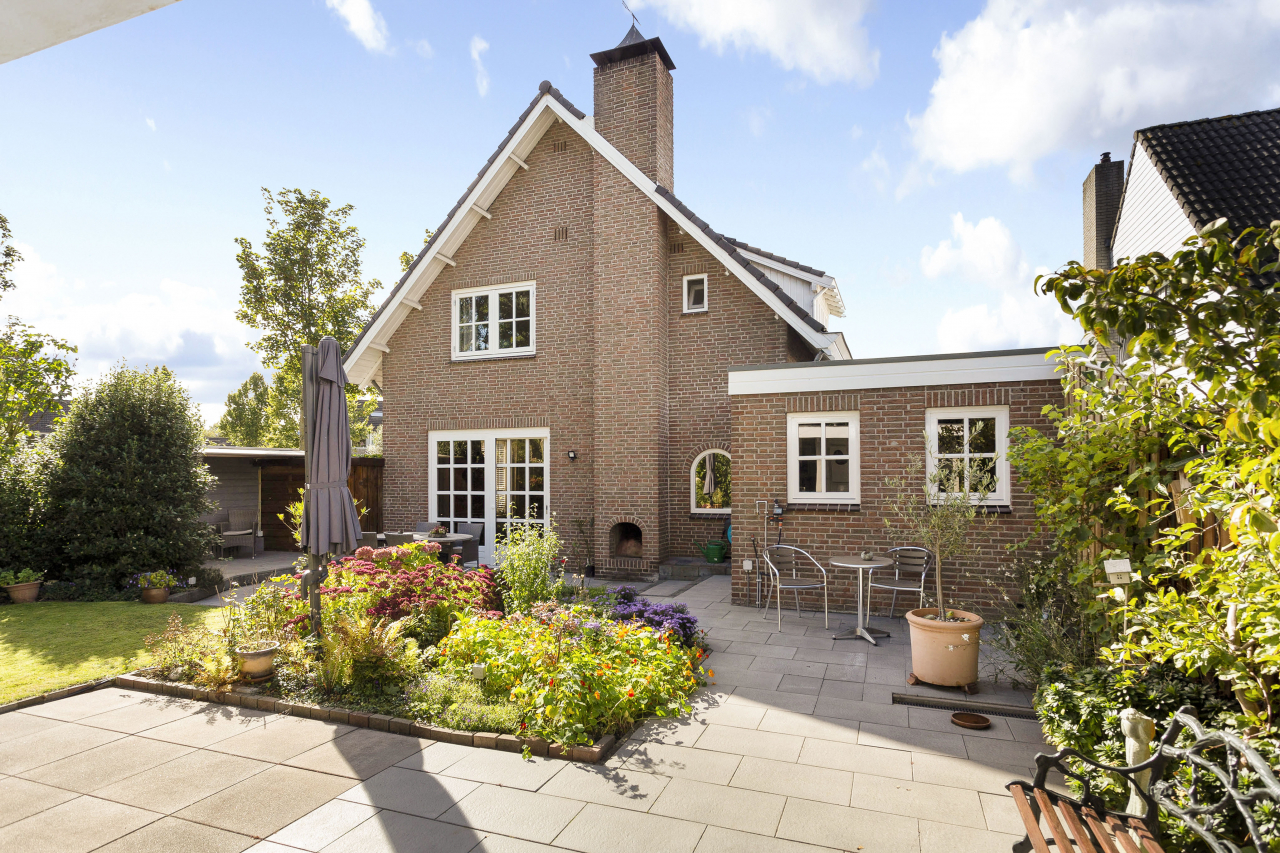Bijna volledig rondom de woning ligt een fraaie tuin met achterom. Met een gazon, sproei installatie, diverse terrassen o.a. direct achter de woning. Verder een buitenhaard, borders, struiken, sierbestrating en achterin de tuin een houten tuinhuis met berging en tuinkamer met glazen schuifpui. Daarnaast nog een extra overkapping/ berging aan de zijkant van de woning bij de achterom. De tuin heeft veel privacy en loopt door tot aan een park achter het perceel van de woning.