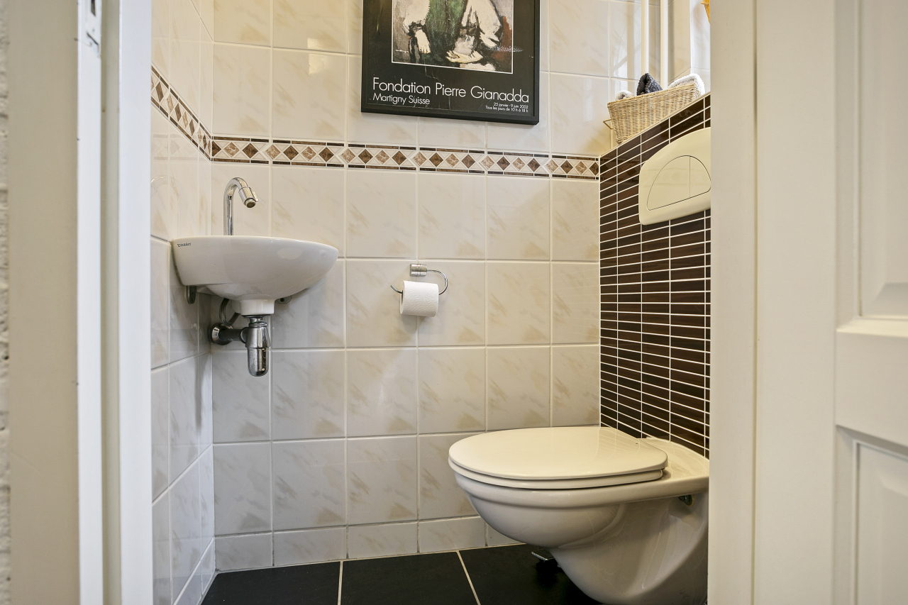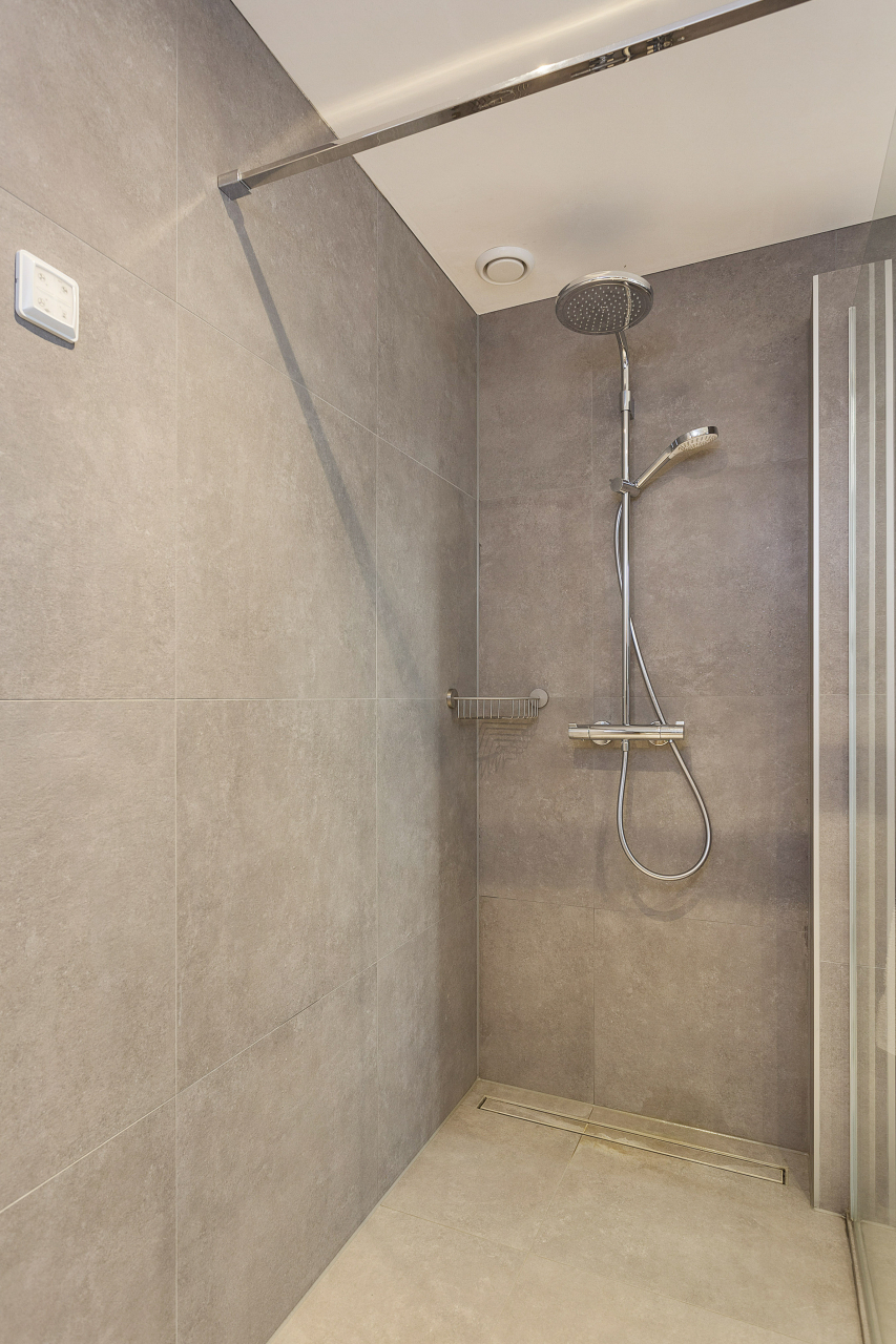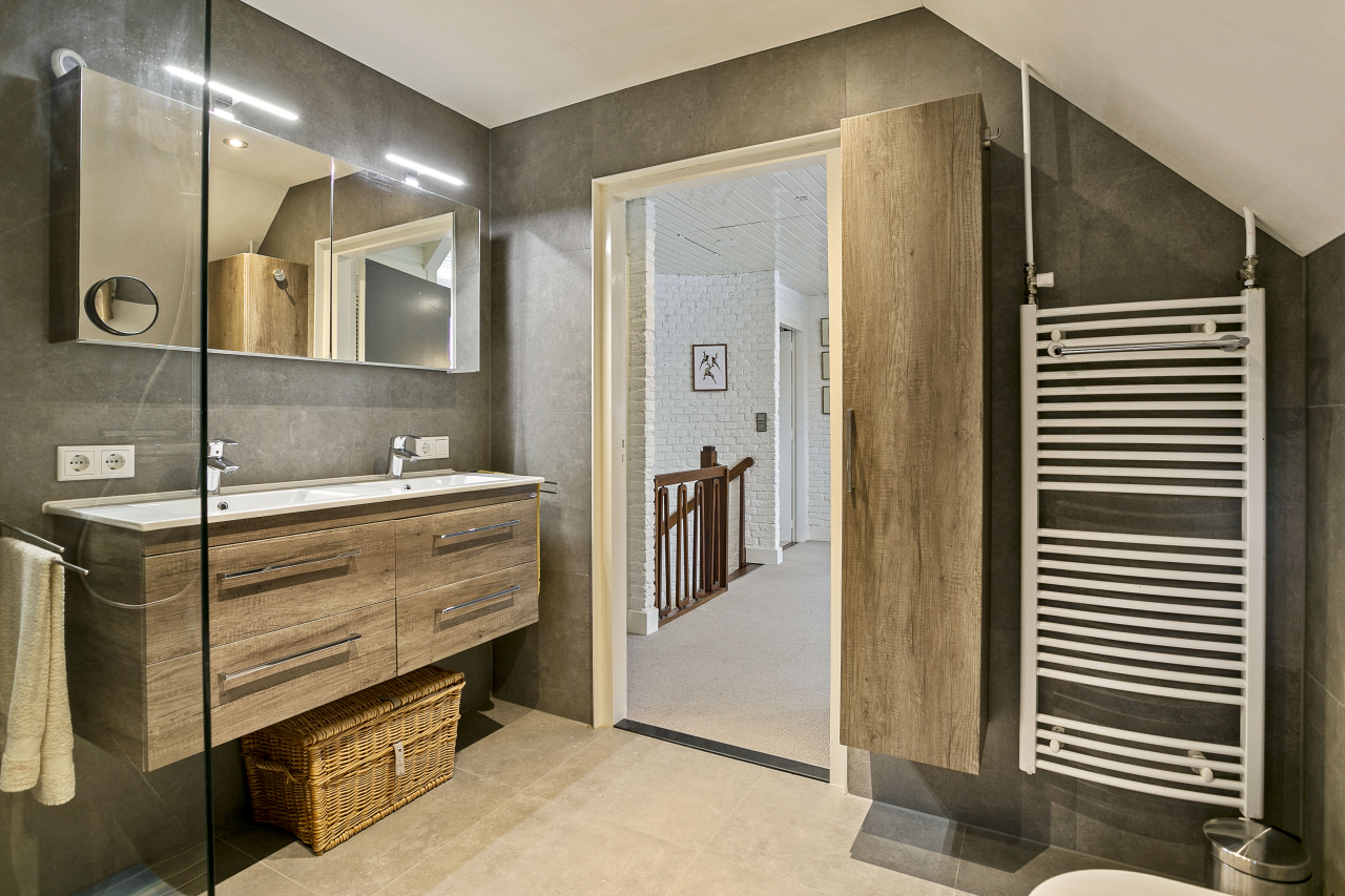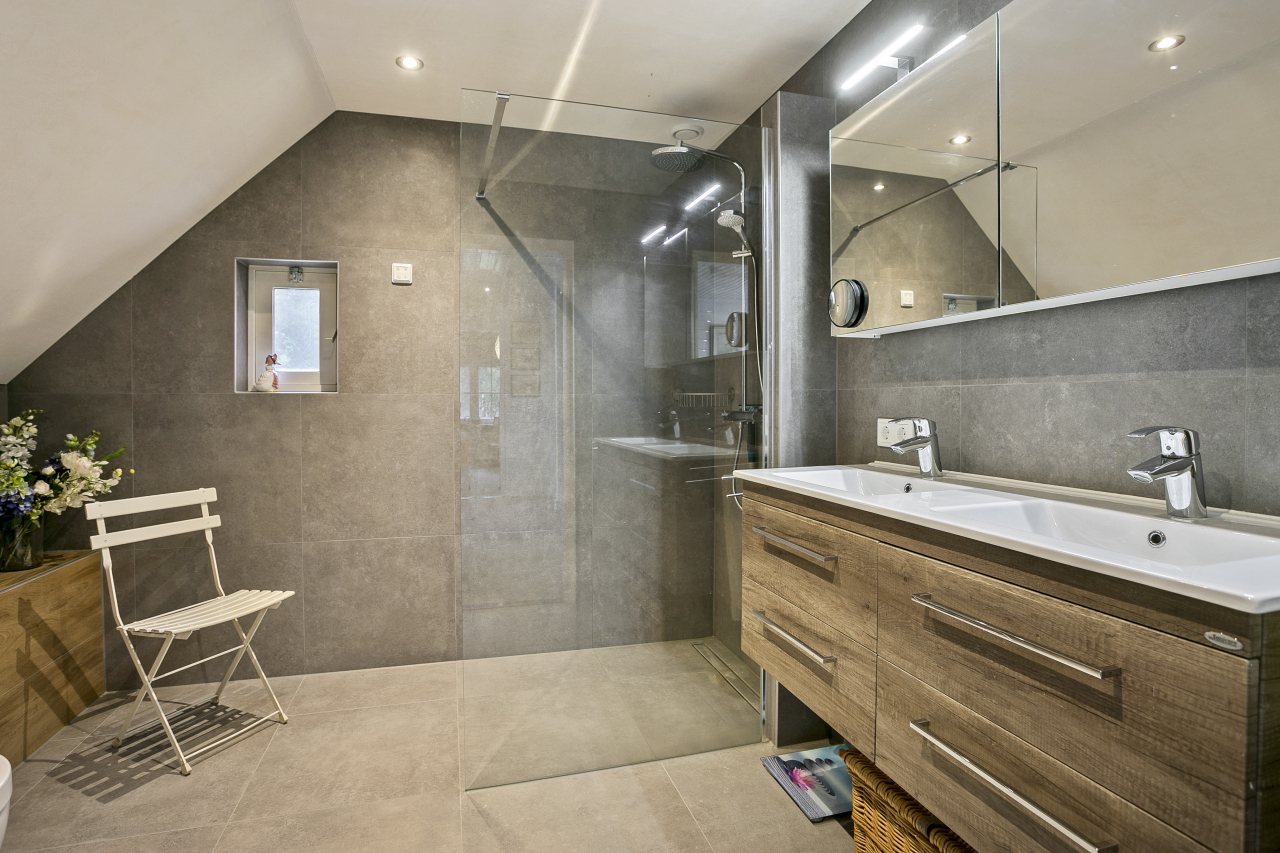 De volledig betegelde badkamer aan de achterzijde is spiksplinternieuw (2020) en met een dubbel wastafelmeubel (met soft close laden), een inloopdouche met regendouche en handdouche, designradiator en 2e (hangend, intelligent ) toilet.