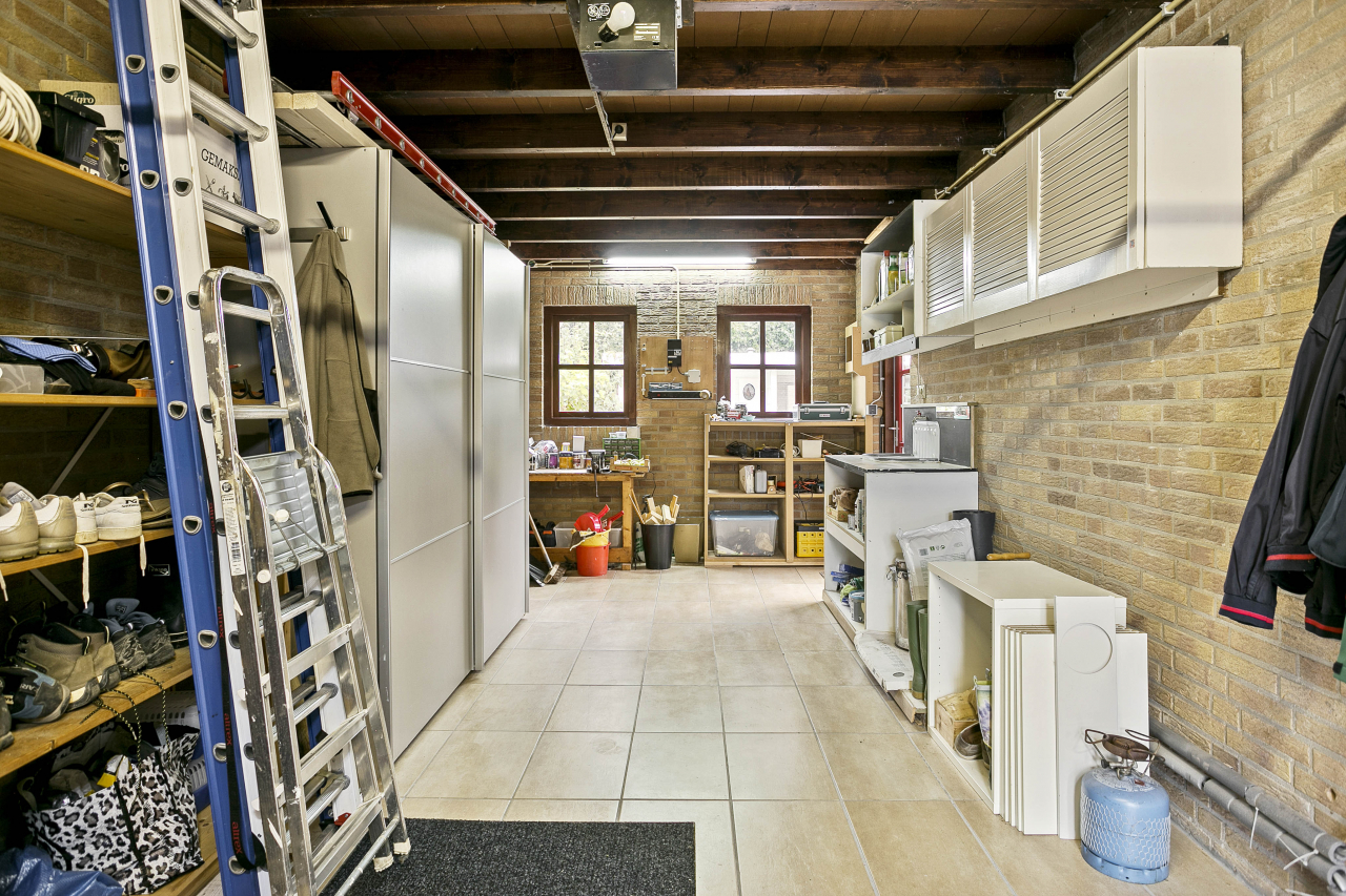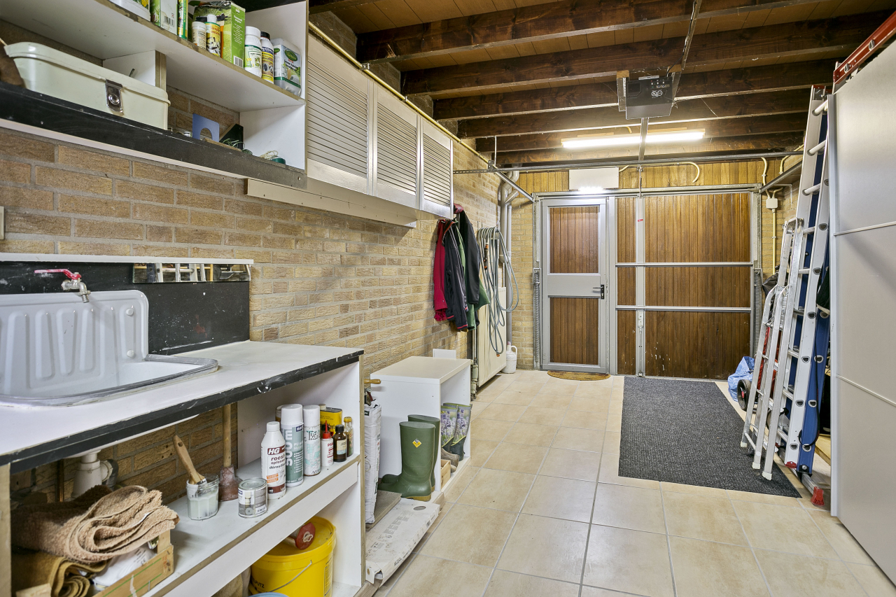 De aangebouwde garage met tegelvloer heeft aan de voorzijde een kanteldeur met loopdeur en aan de achterzijde een loopdeur naar de tuin. Verder is deze voorzien van verwarming, water en elektra. Er is tevens een grote smeerput voor de eventuele klusser.