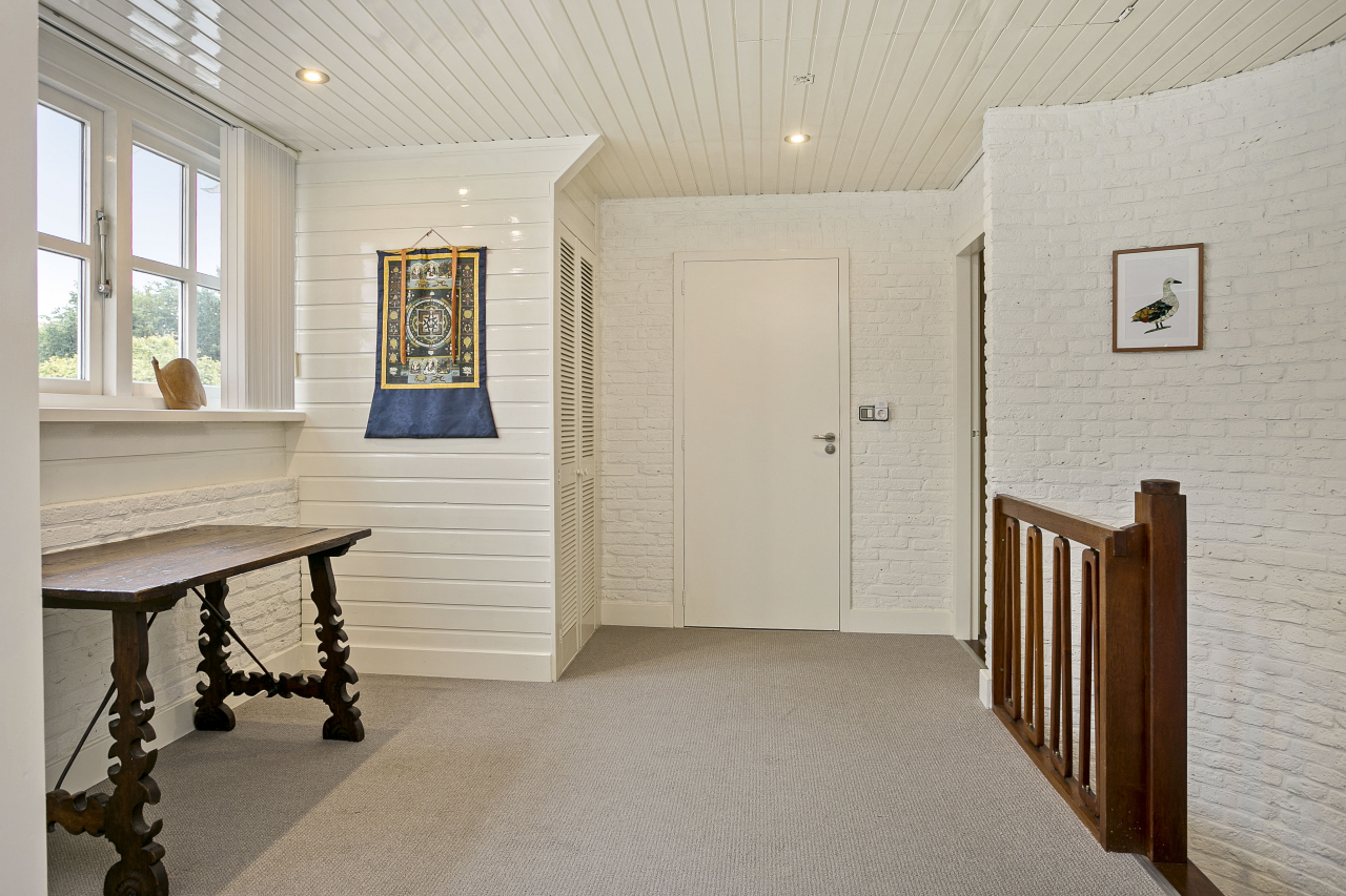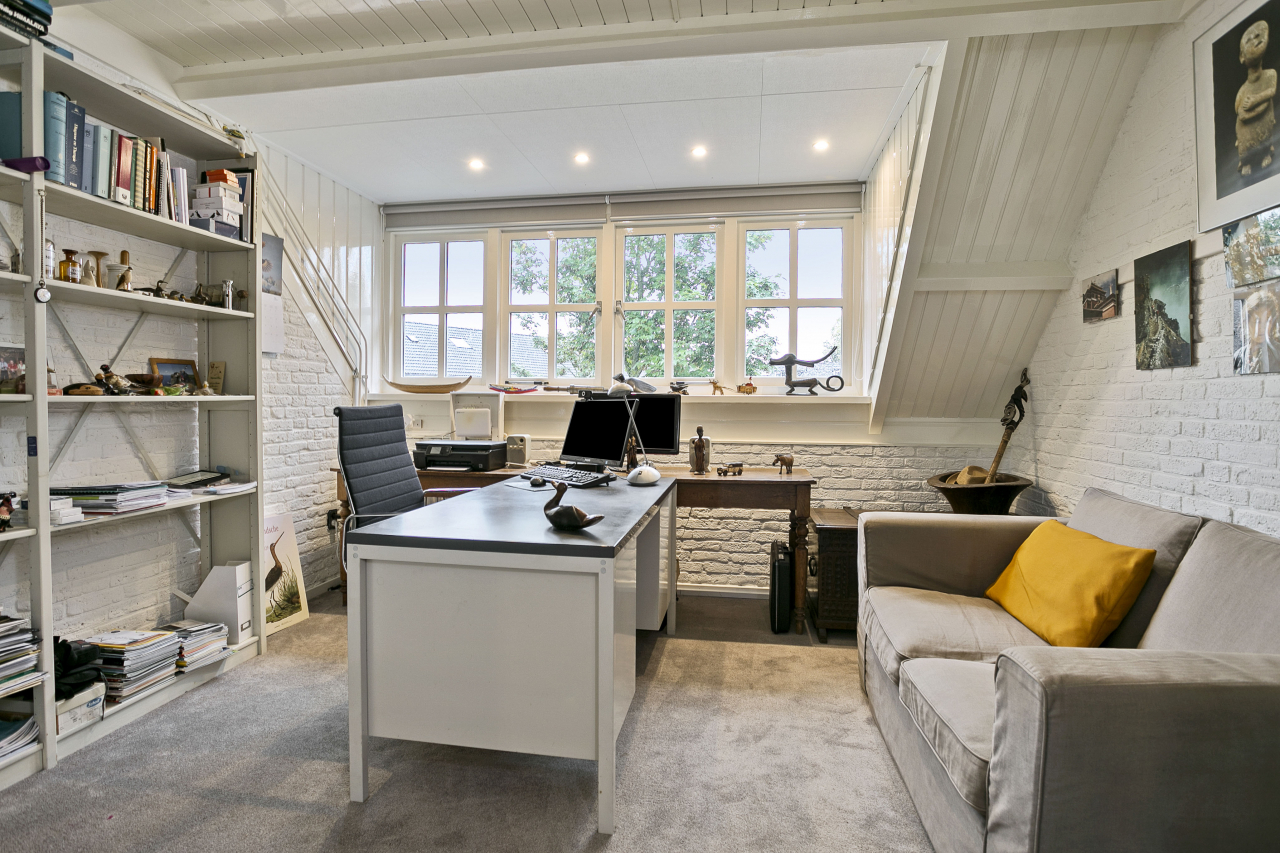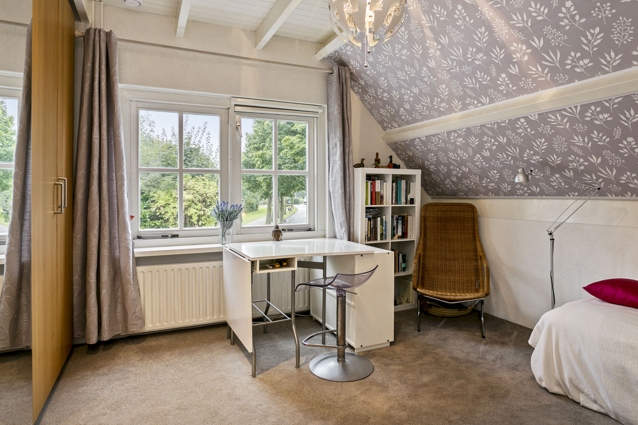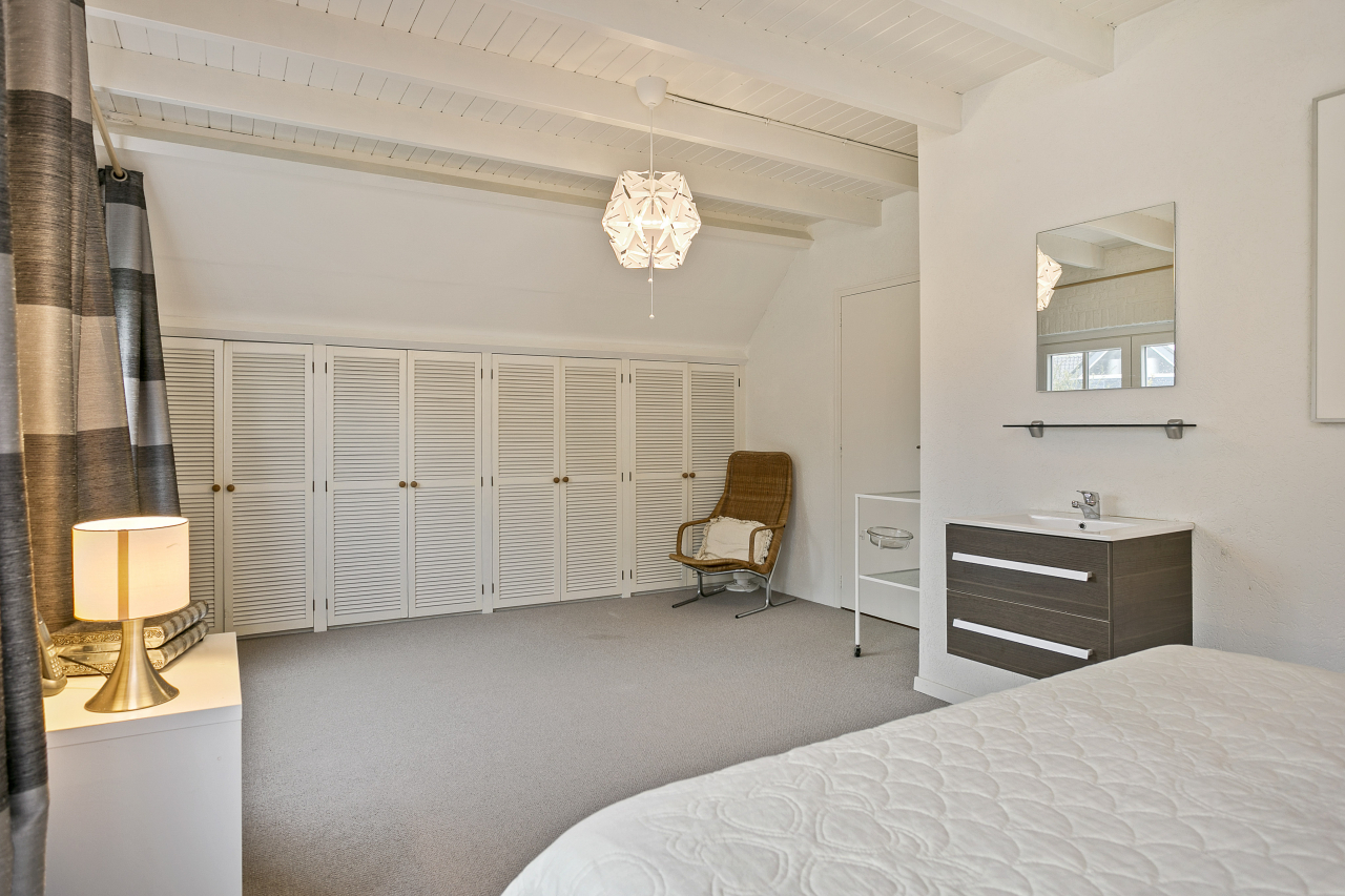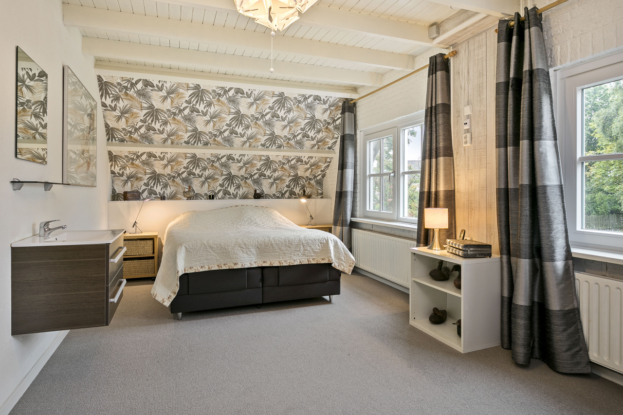 Aan de voorzijde ligt de royale, L-vormige master bedroom met sfeervol balkenplafond, eigen wastafelmeubel en kastenwand met Louvre deurtjes. De ramen op deze slaapkamer en de 1e verdieping zijn voorzien van de kenmerkende roedeverdeling. De 2e slaapkamer heeft een grote dakkapel en is in gebruik als werkkamer.