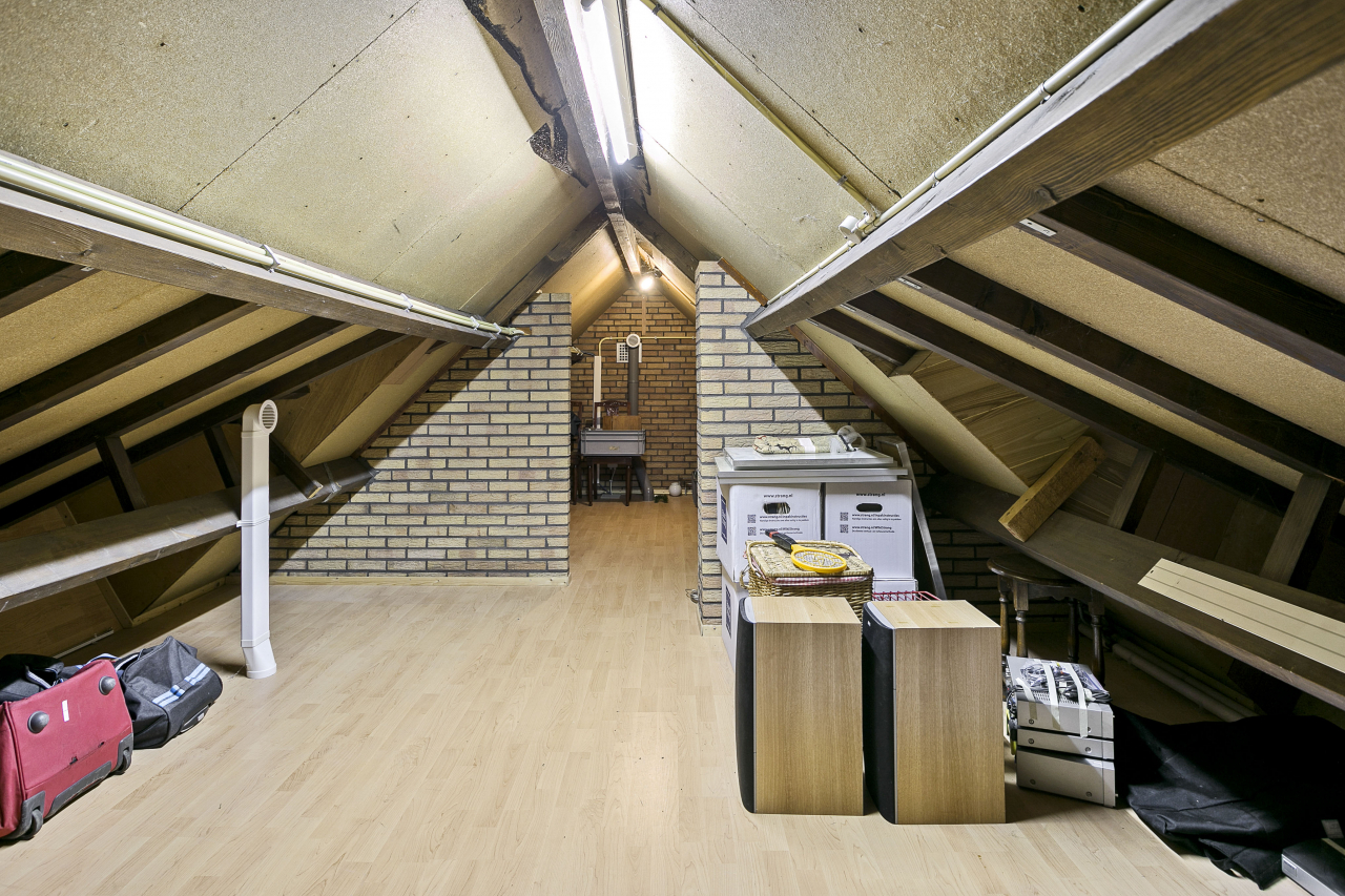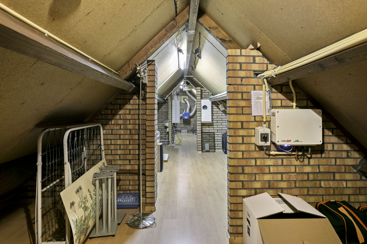 Via een vlizotrap op de overloop is de grote bergzolder te bereiken Deze bergzolder met laminaat is voorzien van de mechanische ventilatie, Intergas CV HR ketel, de omvormer van de nieuwe zonnepanelen (2020) en veel bergruimte.