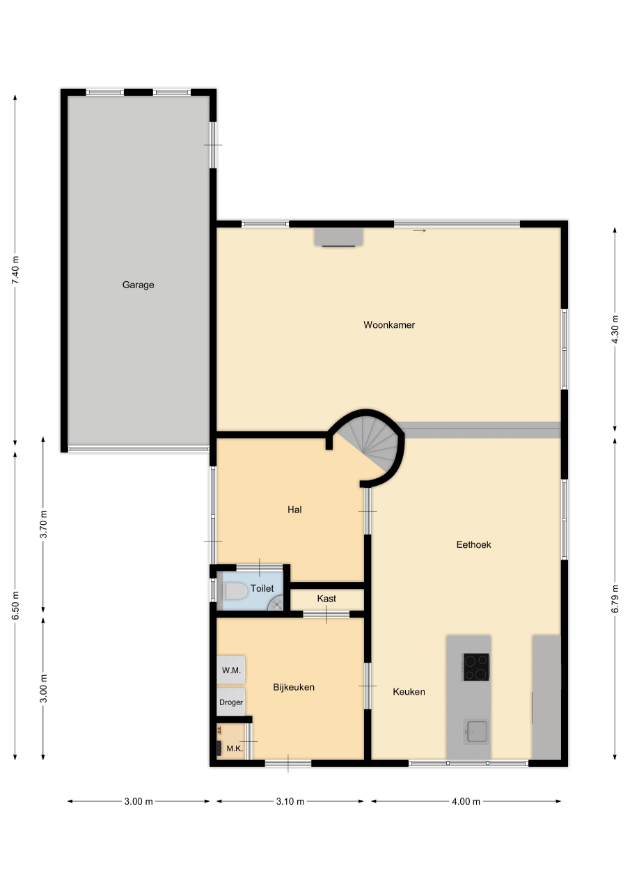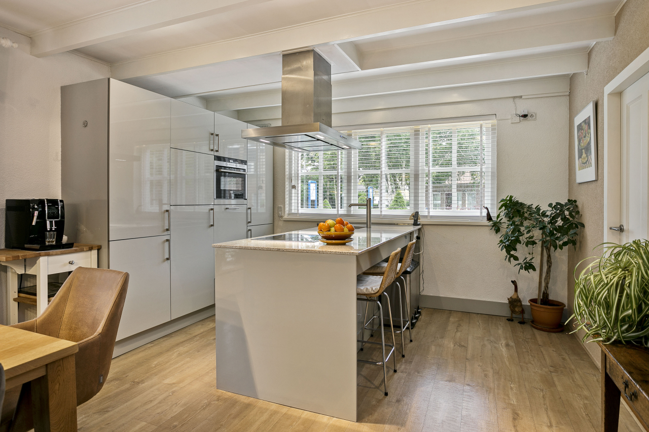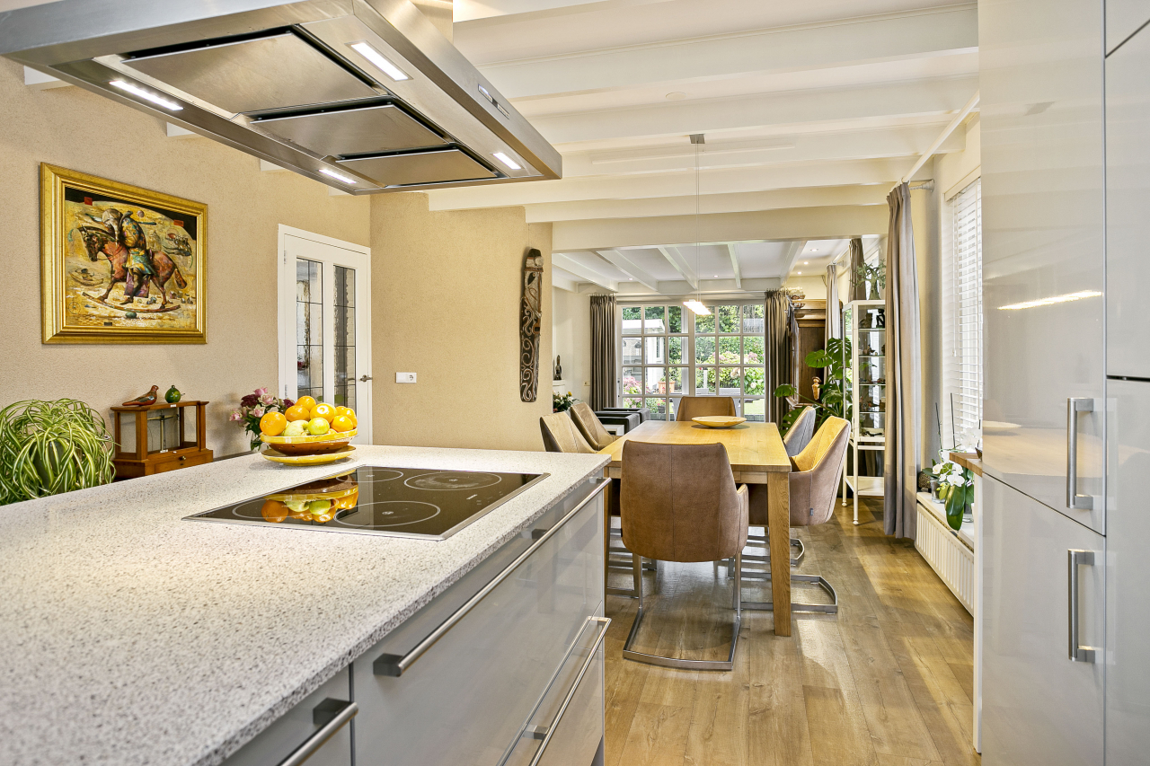 Aan de voorzijde ligt de eethoek bij de open keuken. Deze moderne keuken is voorzien van een kookeiland met ontbijtbar, spoelbak en diverse Siemens inbouwapparatuur zoals een 4-pits inductie kookplaat met afzuigschouw, combi oven-magnetron, vaatwasser en koelvriescombinatie. Aansluitend ligt de bijkeuken met de witgoedaansluitingen, inbouwkast en meterkast.