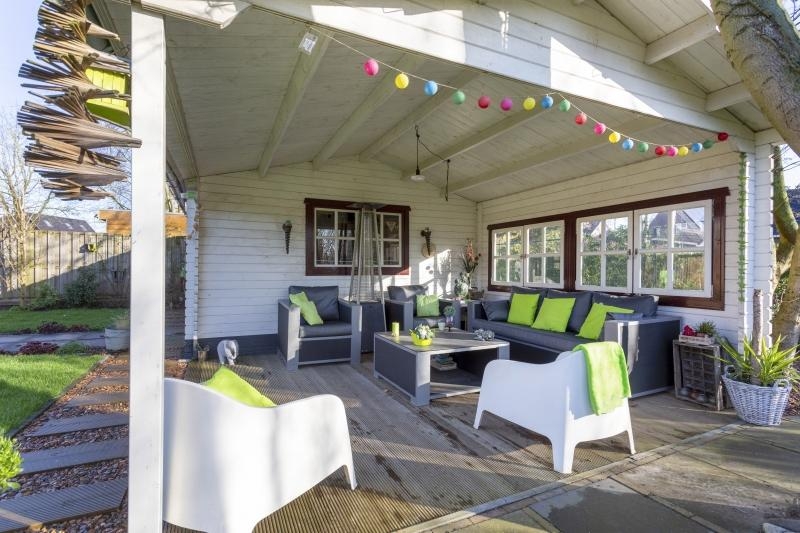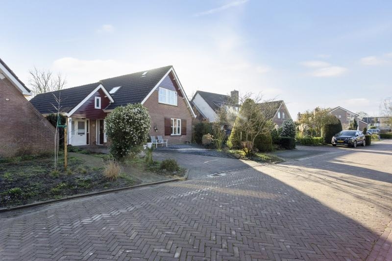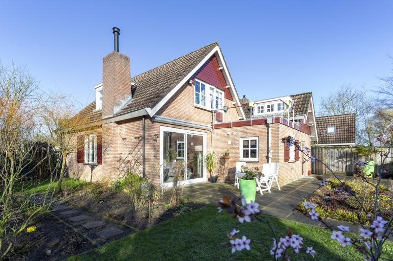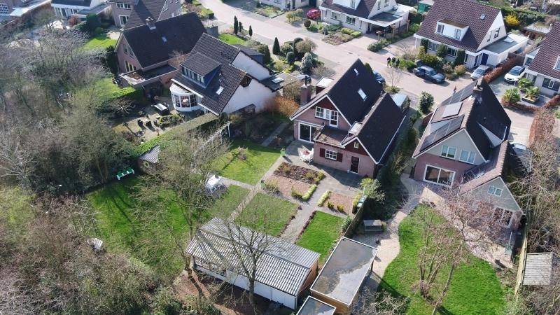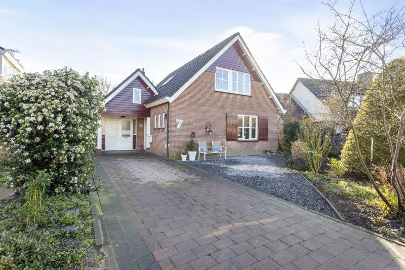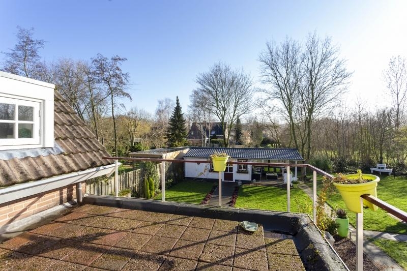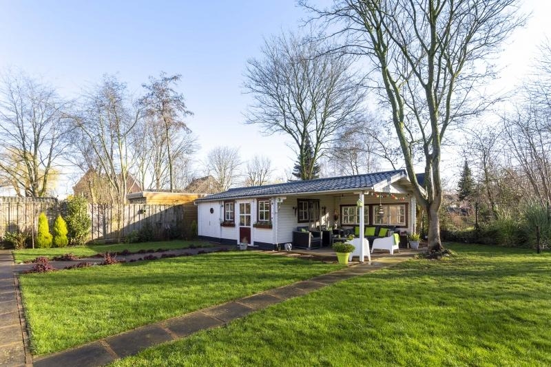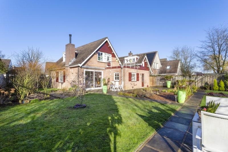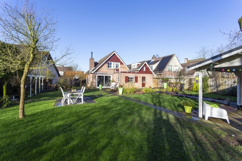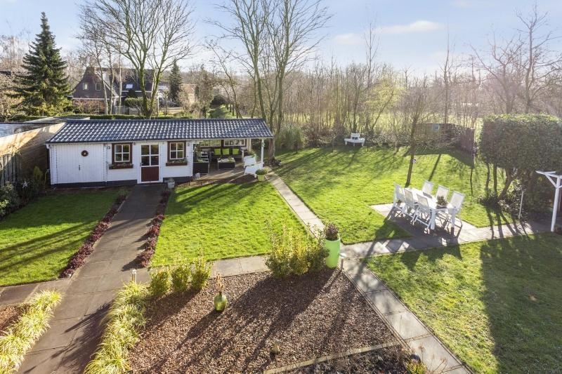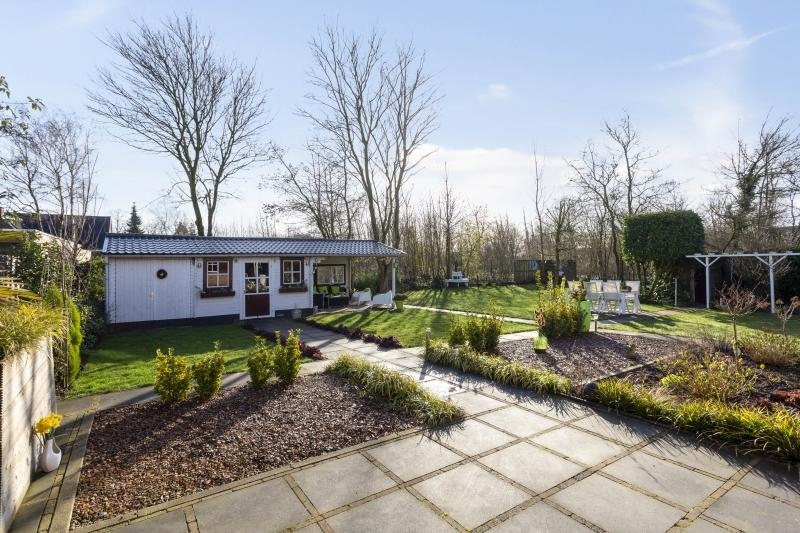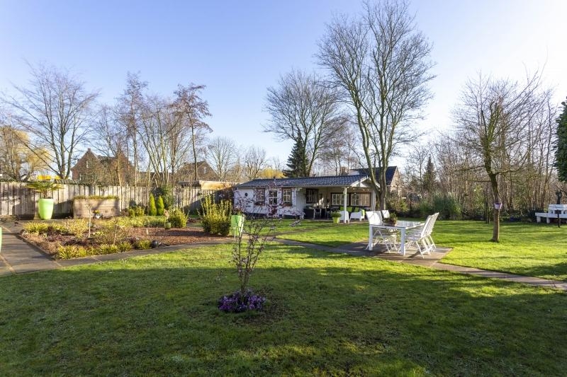 Rondom de woning ligt een fraaie tuin met achterom. Met een gazon, diverse terrassen o.a. direct achter de woning. Verder borders, struiken, sierbestrating en achterin de tuin een houten berging in 2 delen met een heerlijke veranda. Daarnaast nog een extra berging voor tuingereedschap. De tuin loopt door tot aan het park achter de woning