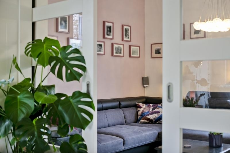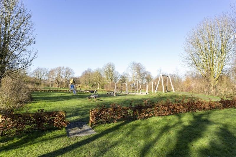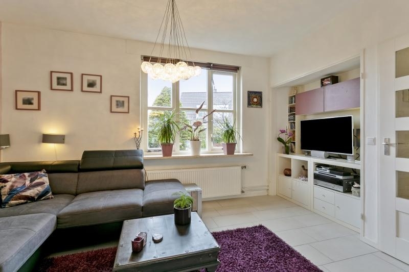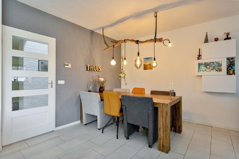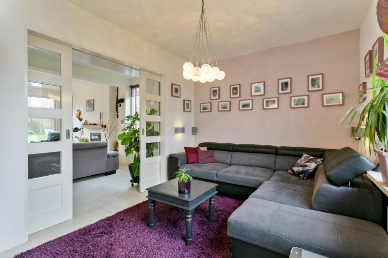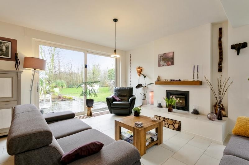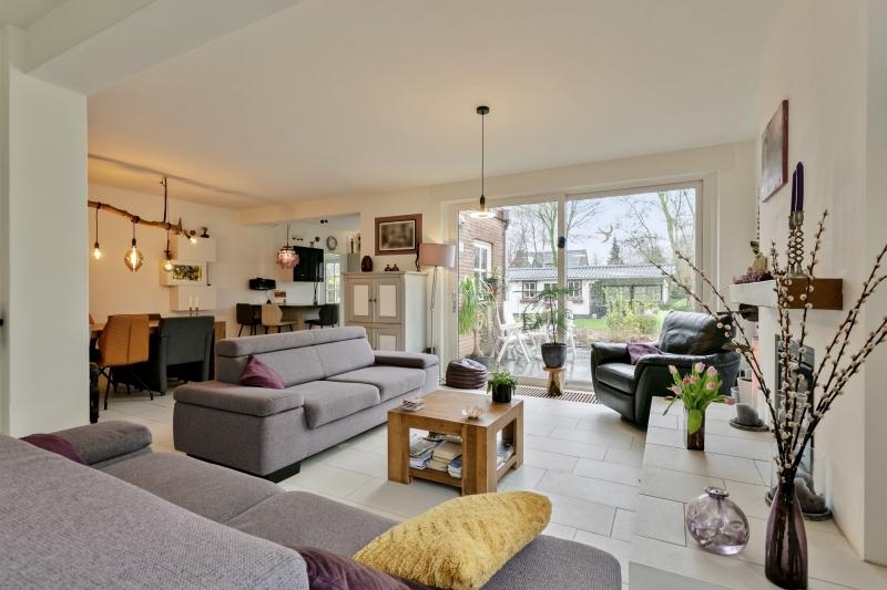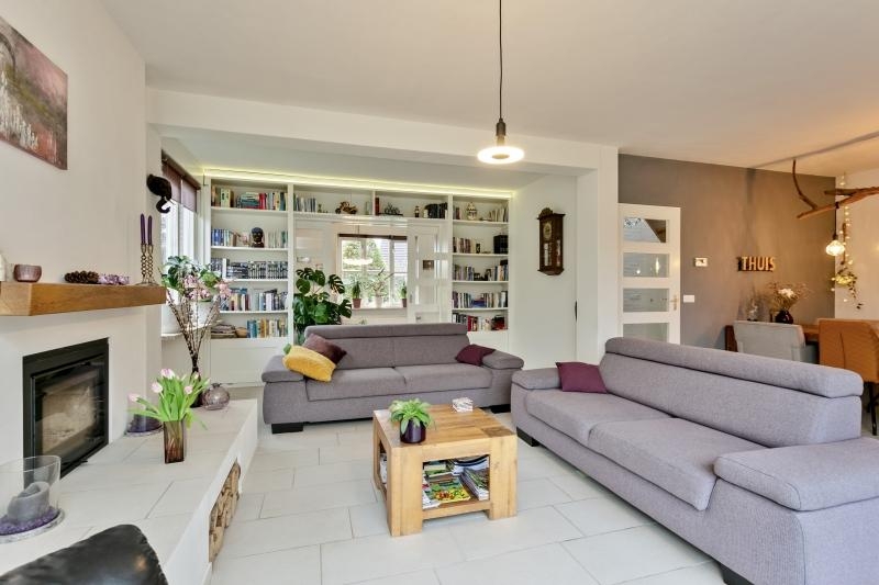 De ruime woonkamer met sfeervolle openhaard heeft aan de achterzijde een schuifpui die zorgt voor veel lichtinval. De grote ramen vormen een mooie overgang naar de tuin. De gehele beneden verdieping is voorzien van een lichte tegelvloer met comfortabele vloerverwarming.