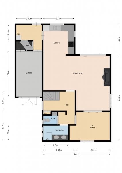 Vanuit de ruime hal met garderobe, trapopgang, meterkast en toilet met fonteintje is de woonkamer met aansluitend TV kamer bereikbaar maar ook de 1e badkamer op de begane grond.