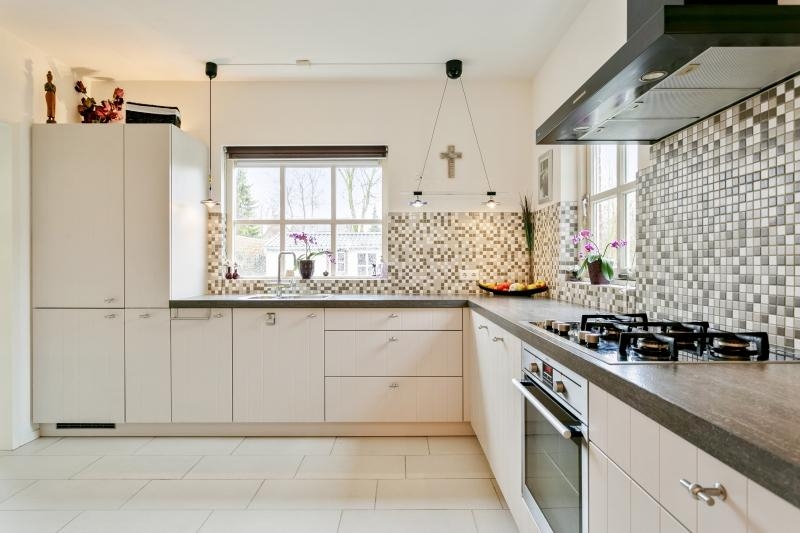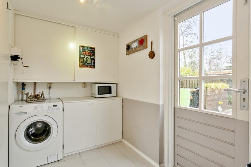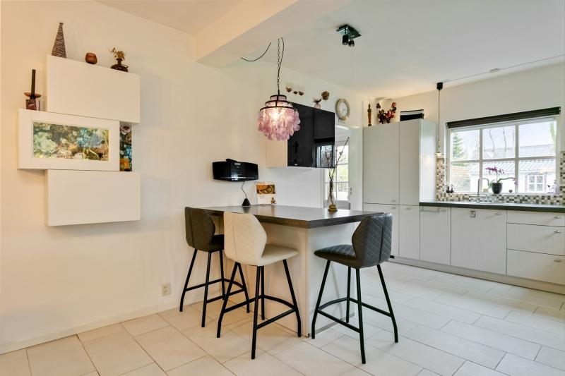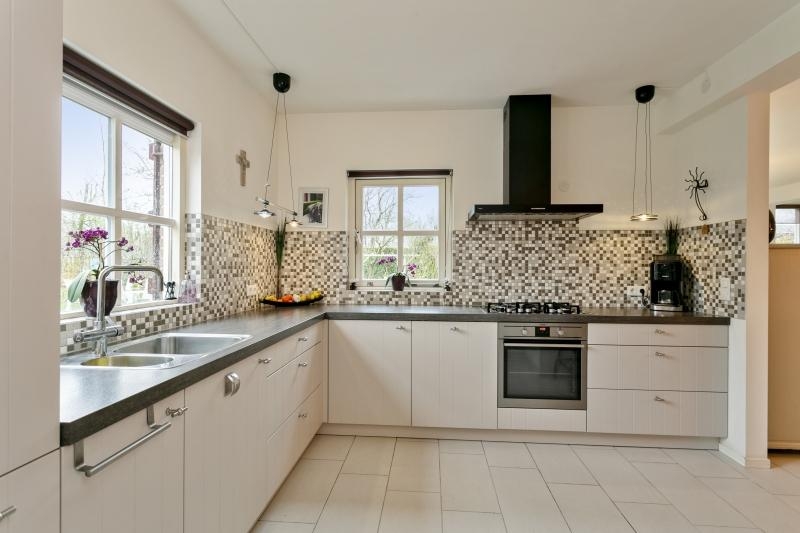 Aan de achterzijde ligt de eethoek bij de open keuken met ontbijtbar. De moderne keuken in L-vorm is voorzien van een 1,5e spoelbak, Quooker en diverse AEG inbouwapparatuur. Vanuit de keuken bereikt u de bijkeuken met de witgoedaansluitingen en een deur naar de tuin, garage, inbouwkast en via een vaste trap de praktijkruimte.