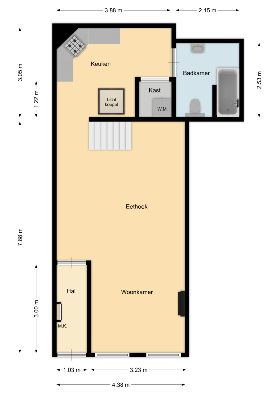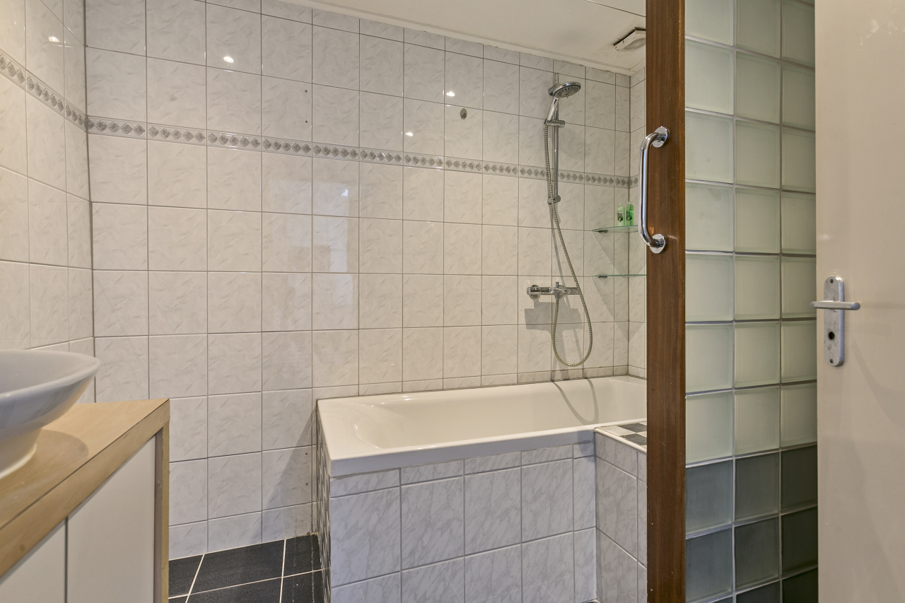 Aansluitend aan de keuken ligt de volledig betegelde badkamer met ligbad inclusief douche, een wastafelmeubel, hangend toilet en een designradiator.
