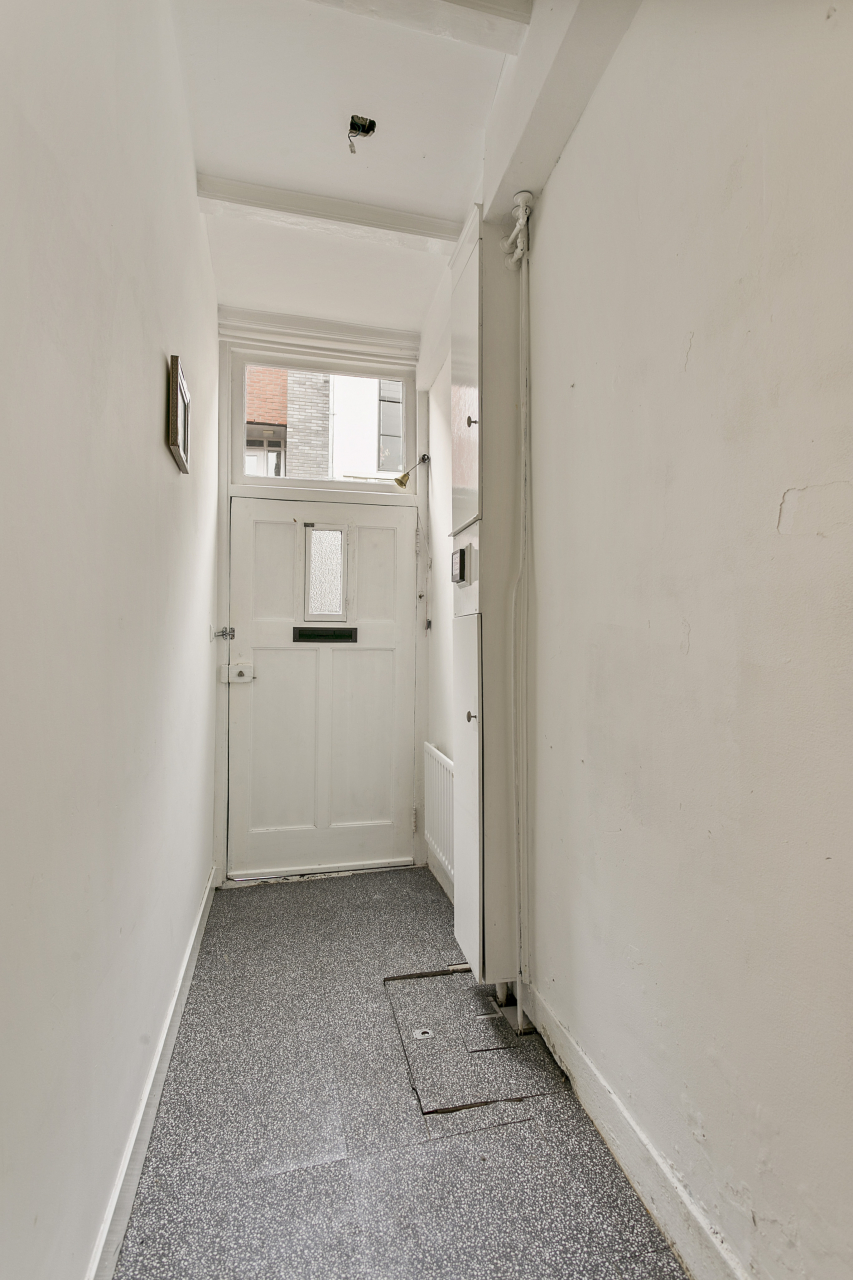 Vanuit de lange, lichte hal met garderobe en meterkast komt u via een binnendeur met roedeverdeling in het glas, in de woonkamer.