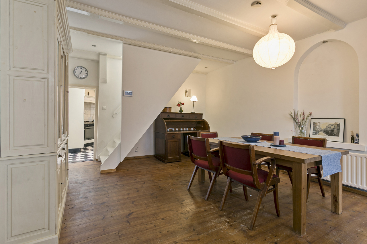 Aan de voorzijde is de zithoek en aan de achterzijde de eethoek bij de keuken en trapopgang. Onder de trap naar de 1e verdieping is extra ruimte voor een kast of eventueel een piano. Aansluitend aan de woonkamer ligt de keuken en badkamer.