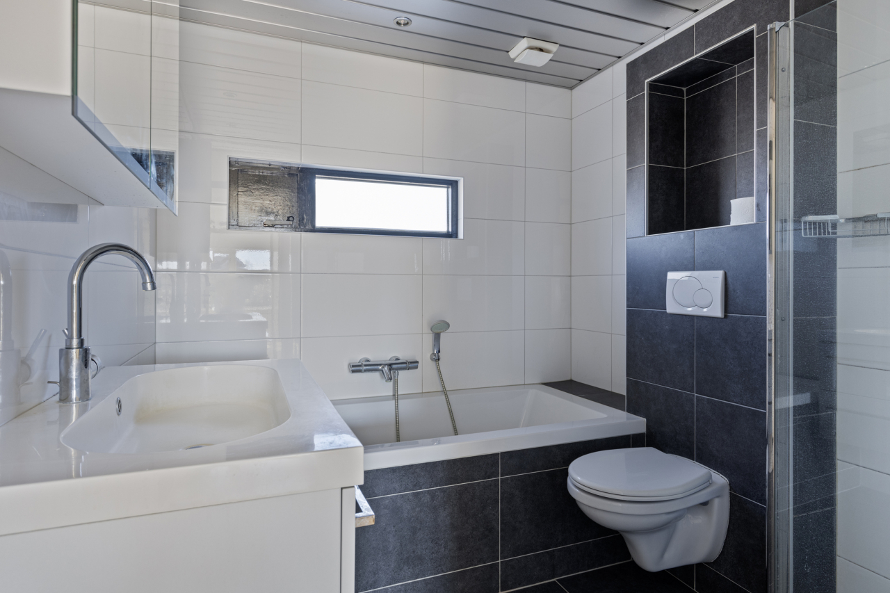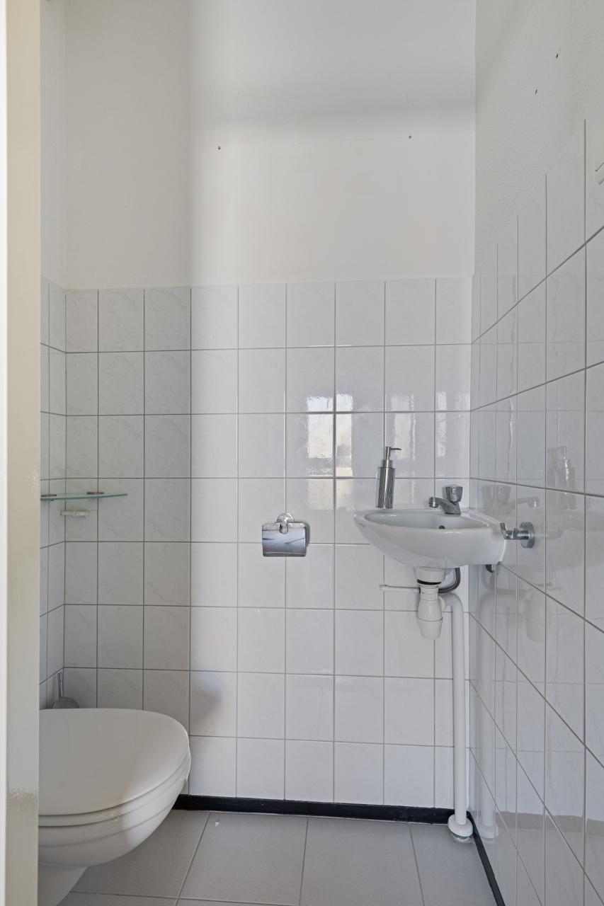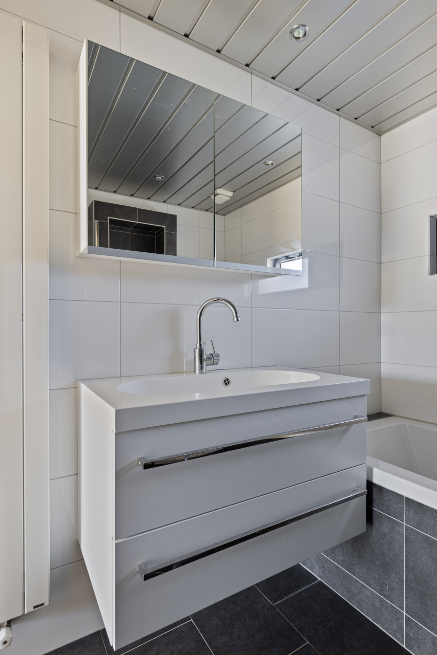 Via de trap in de hal is de 1e verdieping bereikbaar. Hier liggen aan de overloop 3 royale slaapkamers, een inbouwkast met de witgoedaansluiting (voor wasmachine en droger) en de complete de badkamer. De slaapkamer aan de voorzijde heeft een laminaatvloer, een groot raam met rolluik en een speelse nis in de muur waar voorheen een doorgang was naar de achterste slaapkamer. Aan de achterzijde zijn ook 2 slaapkamers met laminaatvloer en grote ramen met rolluiken. De volledig betegelde badkamer aan de voorzijde is ingericht met een inloopdouche, ligbad, wastafelmeubel, designradiator en 2e hangend toilet.