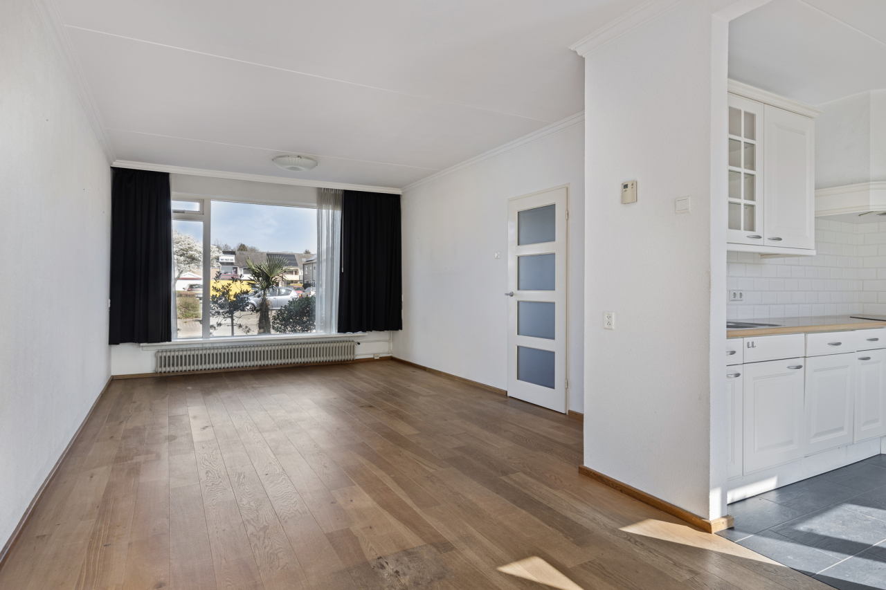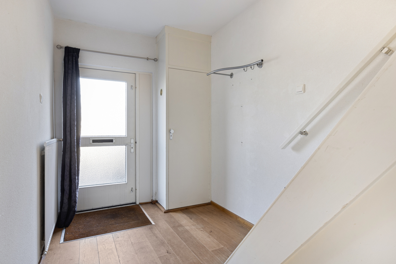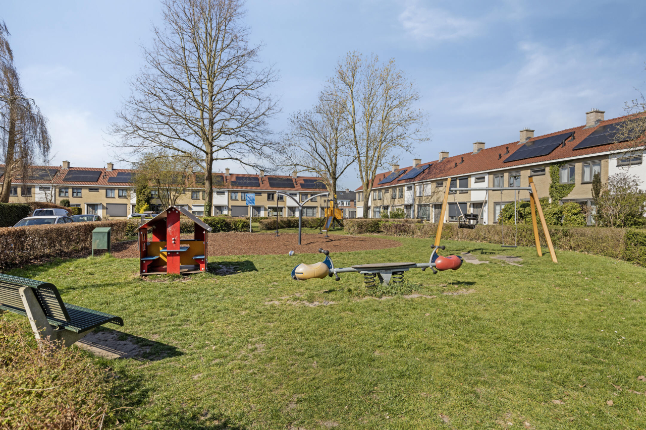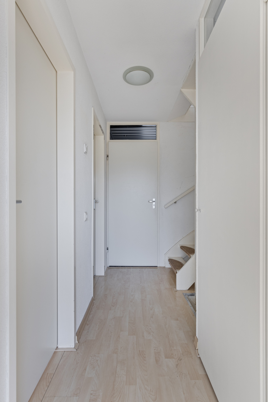 De entree van de woning is aan de voorzijde. Vanuit de hal met garderobe, trapopgang, meterkast, trapkast en modern toilet met fonteintje is de woonkamer bereikbaar. De lichte woonkamer met voor en achter grote ramen is voorzien van een eiken houten vloer en deur naar de gang met roede verdeling. Aan de voorzijde is de zithoek met zicht op het groene pleintje. Aan de achterzijde is de eethoek en praktische ontbijtbar bij de open keuken. Deze lichte keuken in L-opstelling is voorzien van diverse keukenkasten en inbouwapparatuur en een grijze tegelvloer. Er is groot raam en een deur naar de tuin.