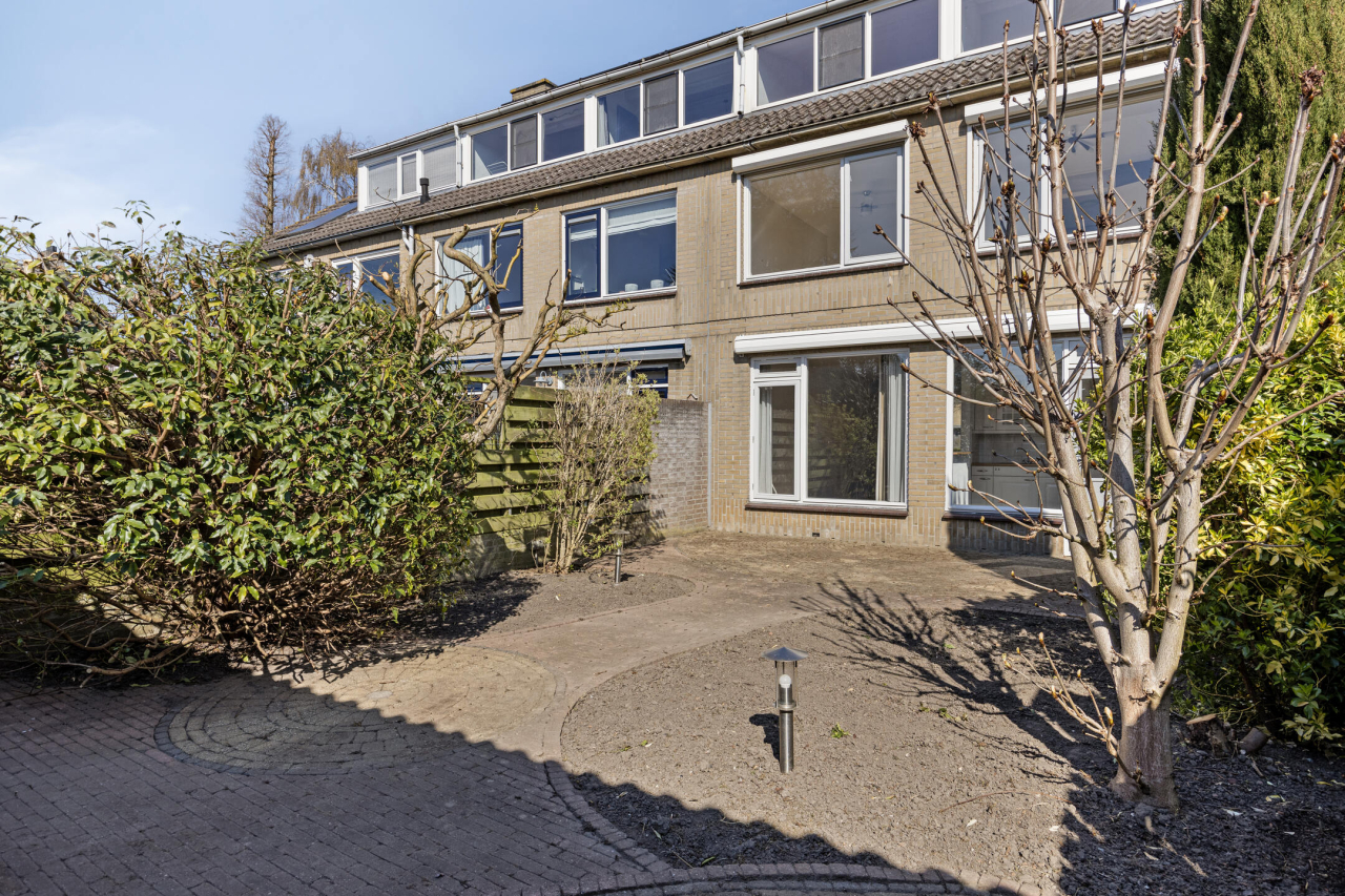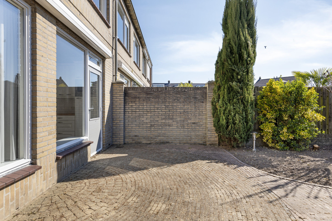 Achter de woning ligt een zonnige onderhoudsvriendelijke tuin op het Zuiden met een groot terras van sierbestrating en zonneluifel direct achter de woning. Verder borders met beplanting en struiken. Achterin de tuin is een 2e terras en een stenen berging met overdekte achterom.