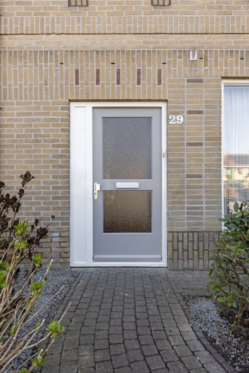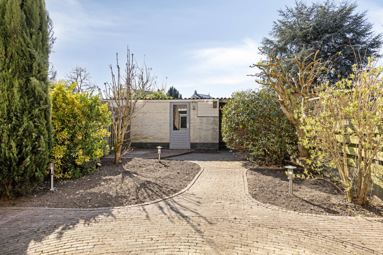 Voor en achter een onderhoudsvriendelijke tuin met achter een stenen berging en achterom. Er is voldoende parkeergelegenheid voor de woning.