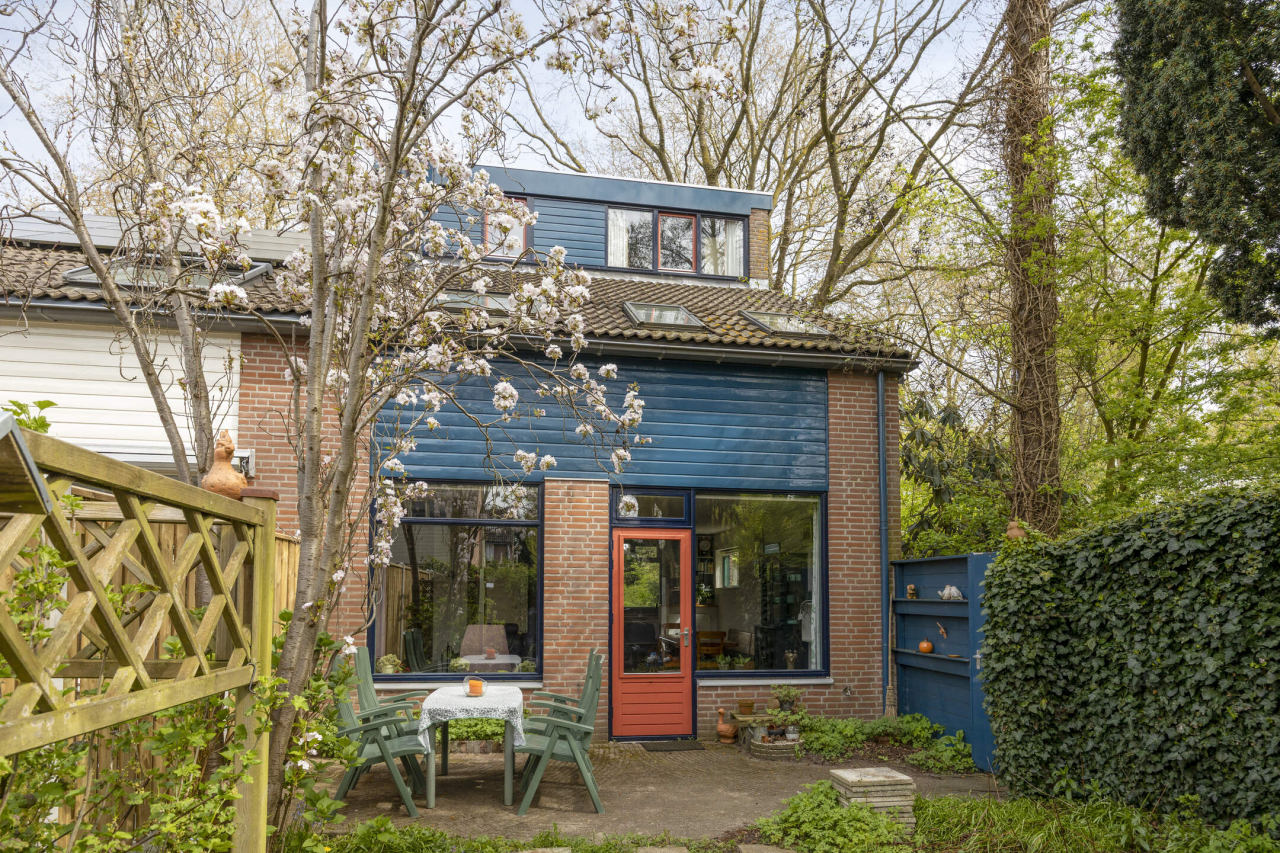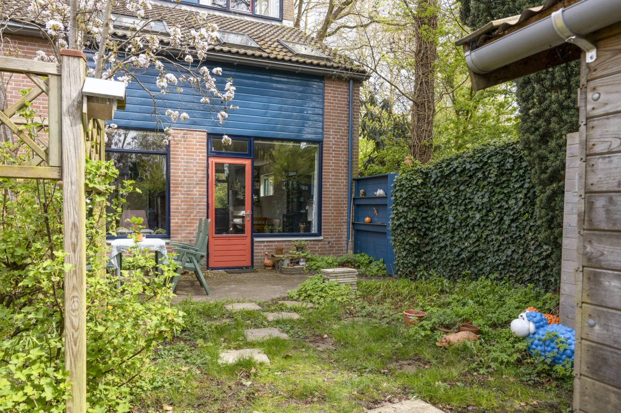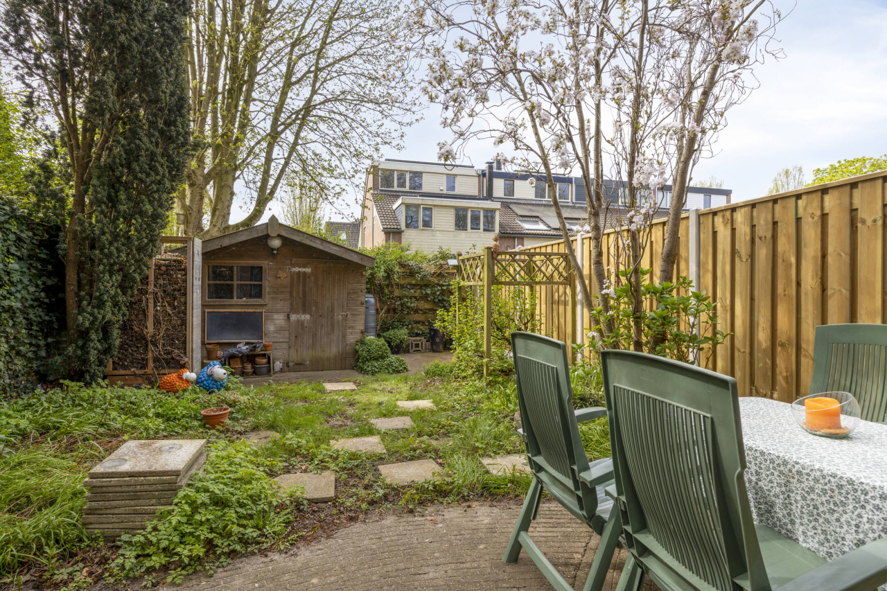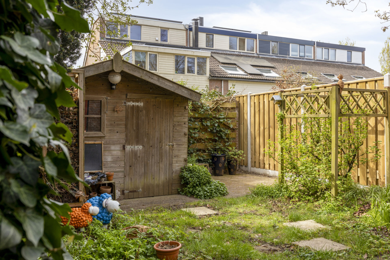 Achter de woning ligt een zonnige, groene tuin op het Zuidwesten. Deze is voorzien van een terras direct achter de woning en achterin de tuin. Verder is er sierbestrating, een gazon, diverse borders met beplanting en struiken. Er is een houten berging voor extra opbergruimte en een achterom via een poort die uitkomt in het park met speeltuin, kinderboerderij en naast gelegen scholen.