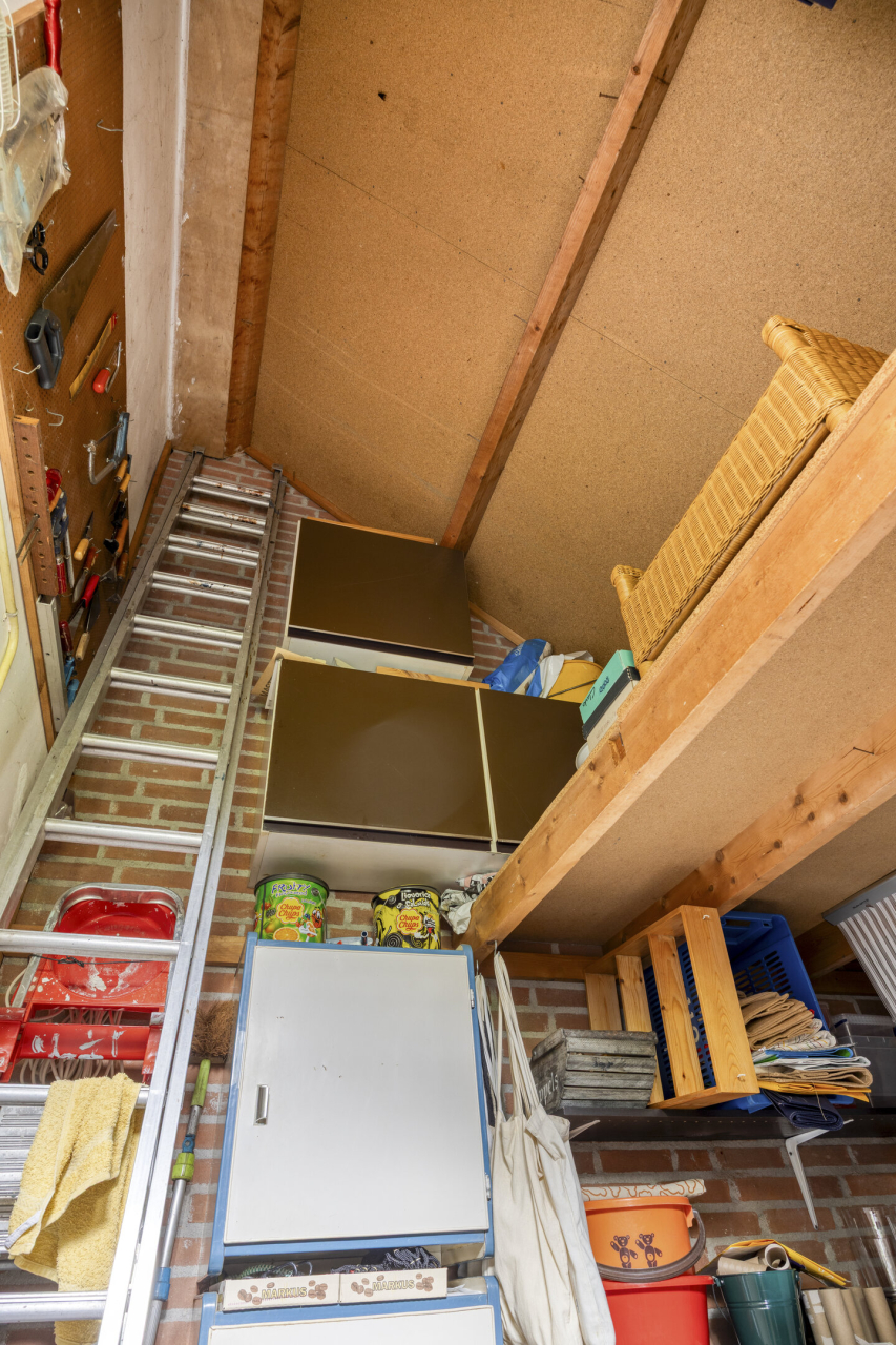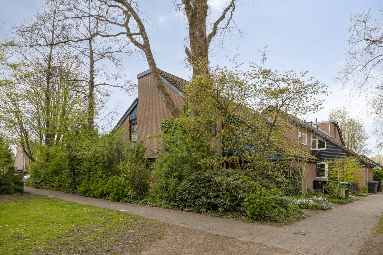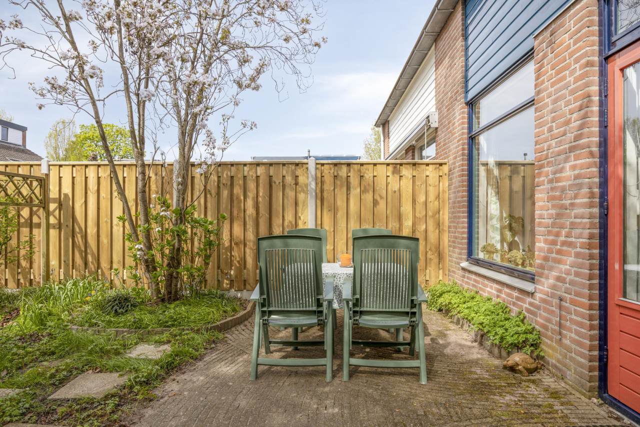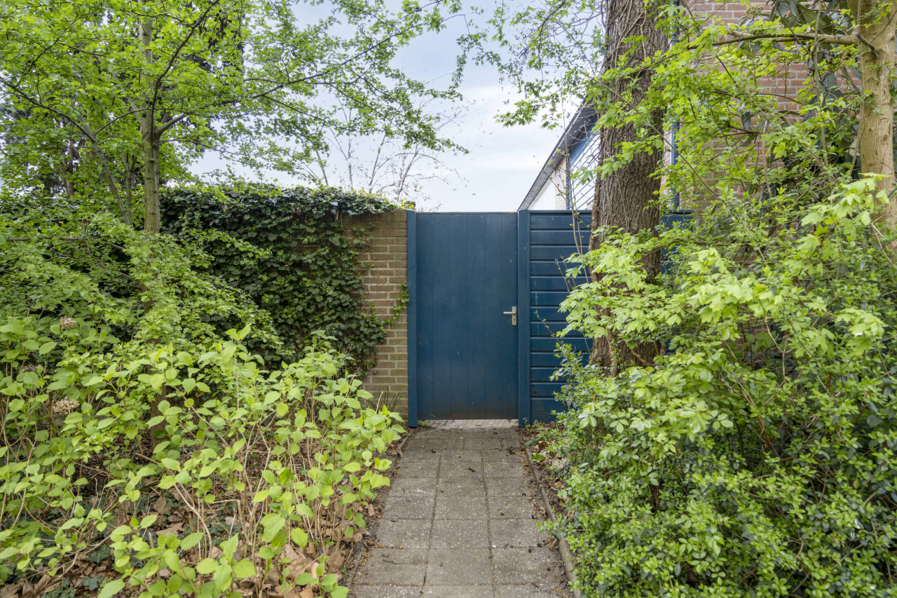 Achter de woning ligt een zonnige, groene tuin op het Zuidwesten. Deze is voorzien van een terras direct achter de woning en achterin de tuin. Verder is er sierbestrating, een gazon, diverse borders met beplanting en struiken. Er is een houten berging voor extra opbergruimte en een achterom via een poort die uitkomt in het park met speeltuin, kinderboerderij en naast gelegen scholen.