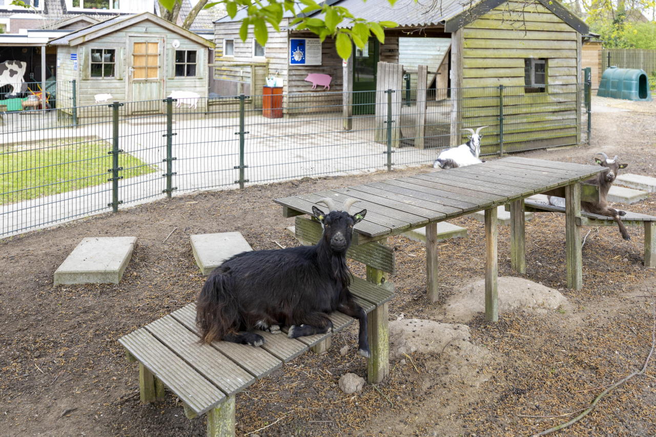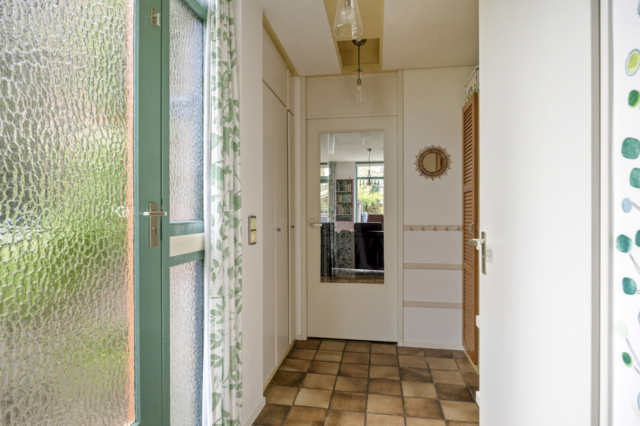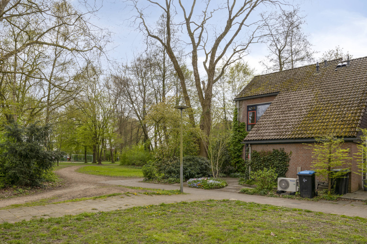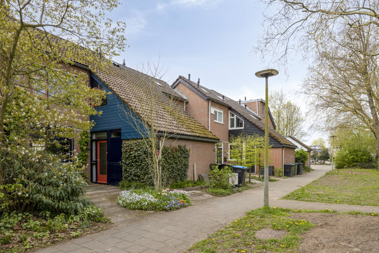 Achter de woning ligt een zonnige, groene tuin op het Zuidwesten. Deze is voorzien van een terras direct achter de woning en achterin de tuin. Verder is er sierbestrating, een gazon, diverse borders met beplanting en struiken. Er is een houten berging voor extra opbergruimte en een achterom via een poort die uitkomt in het park met speeltuin, kinderboerderij en naast gelegen scholen.