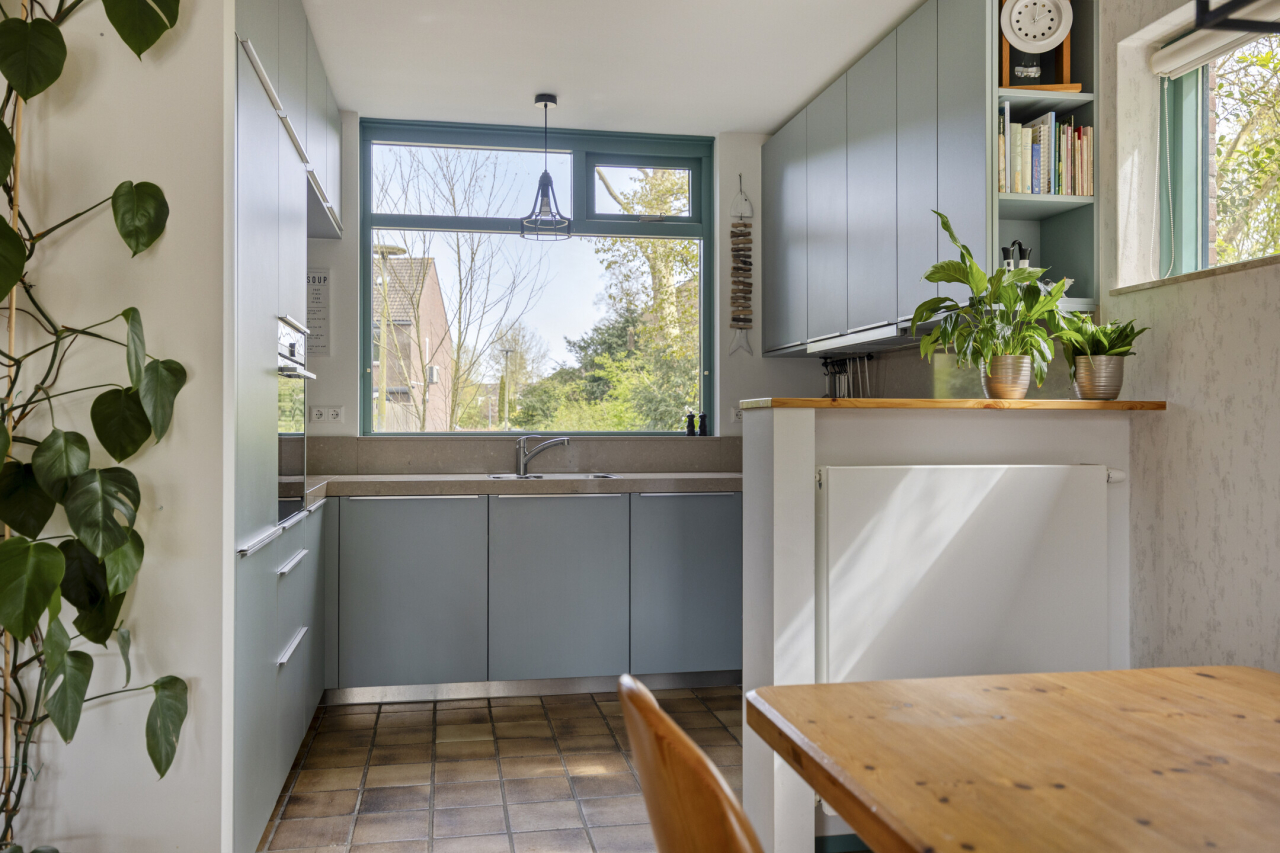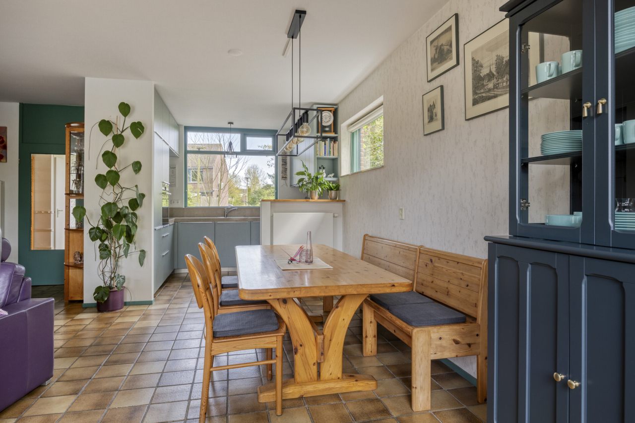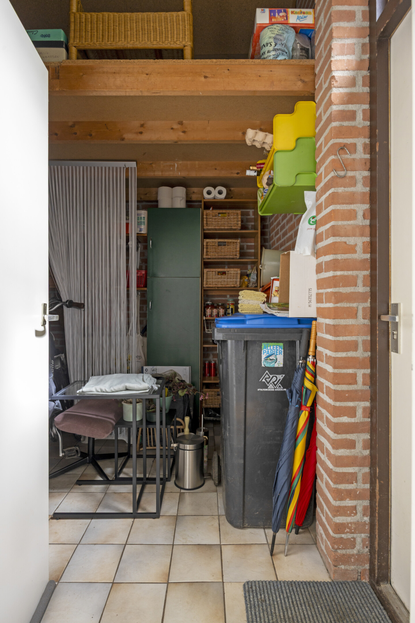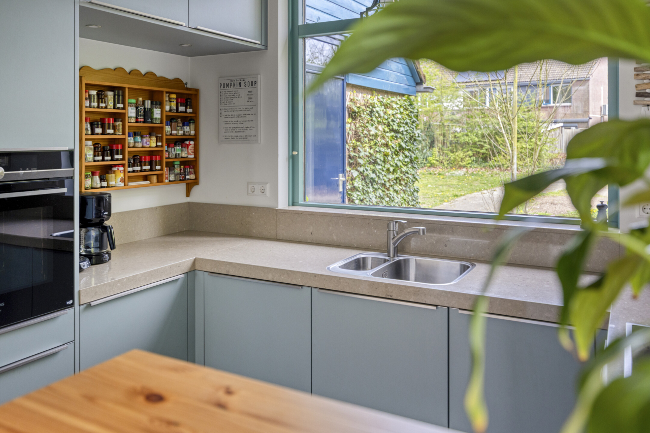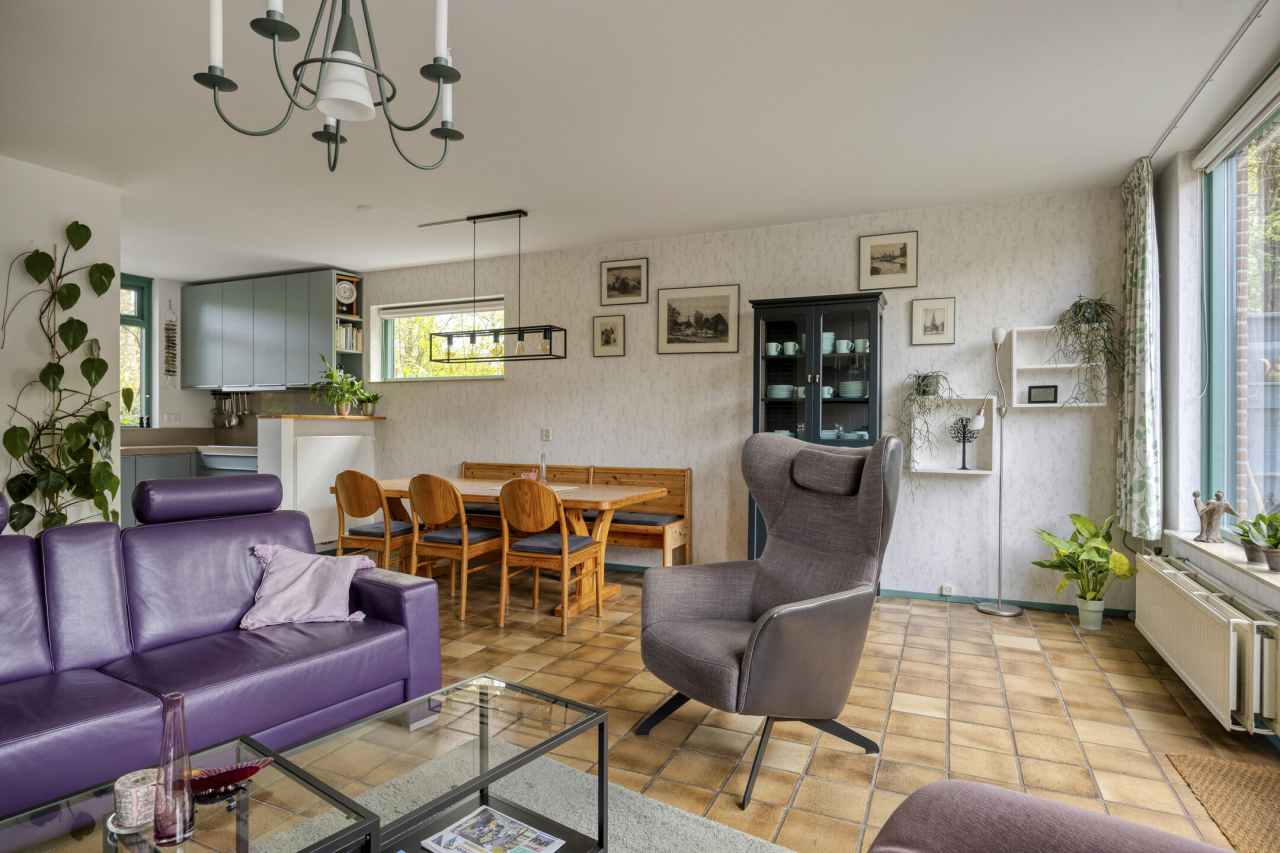 De entree van de woning is aan de voorzijde naast de ingang naar de berging met bergvliering. Deze is ook inpandig bereikbaar. Vanuit de hal met garderobe, meterkast en (hangend) toilet met fonteintje zijn de woonkamer, keuken en berging bereikbaar. De woonkamer is voorzien van een tegelvloer en grote ramen met tuindeur aan de achterzijde die zorgen voor veel lichtinval. Aan de achterzijde is de zithoek met sfeervolle houthaard. De eethoek met zijraam is bij de moderne open keuken. Aan de voorzijde is de moderne open keuken. Deze is voorzien van een composiet aanrechtblad met 1,5 spoelbak en diverse inbouwapparatuur zoals een Siemens 4 pits inductie kookplaat met warmhoudplaat en met Siemens afzuigkap, Siemens stoomoven, Siemens vaatwasser en Liebherr koelvriescombinatie.
