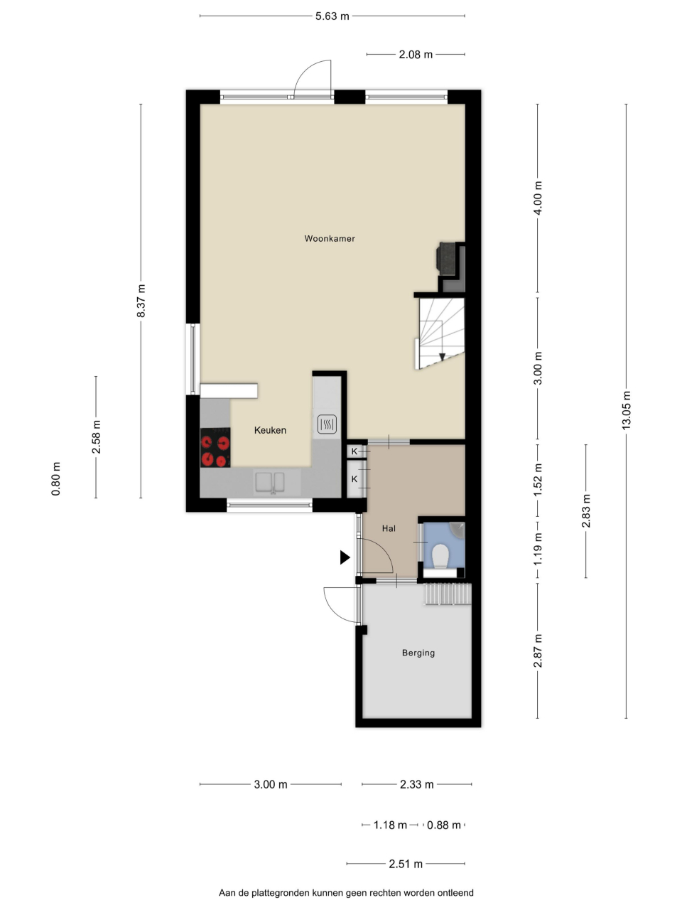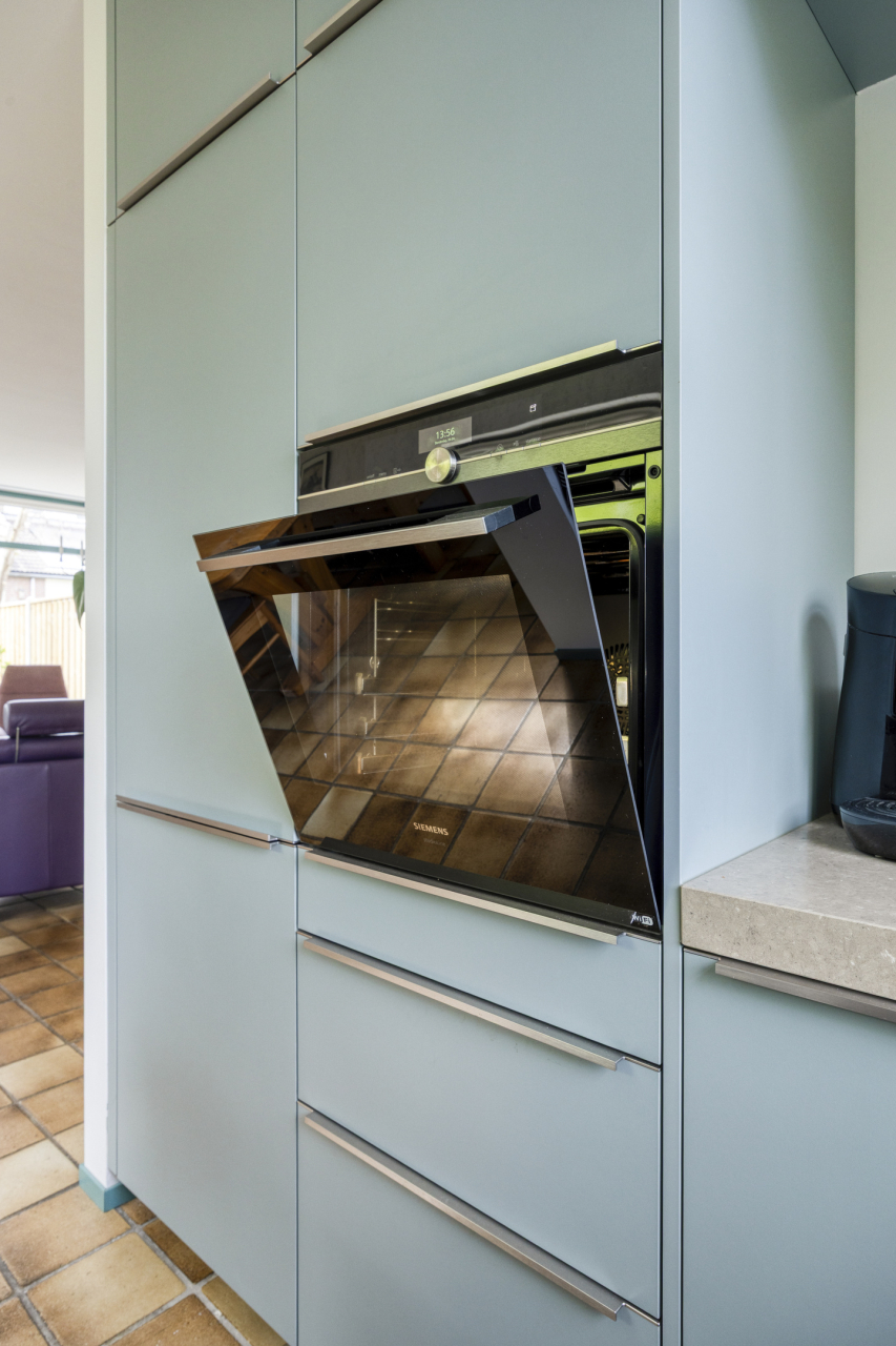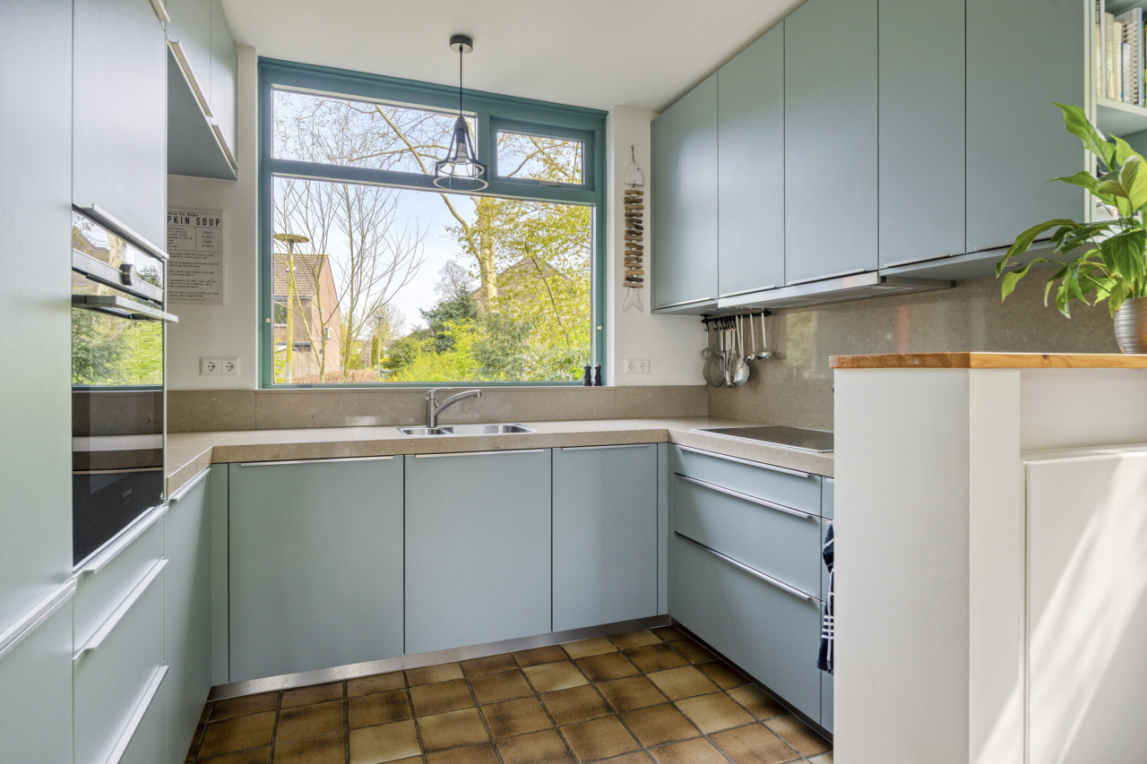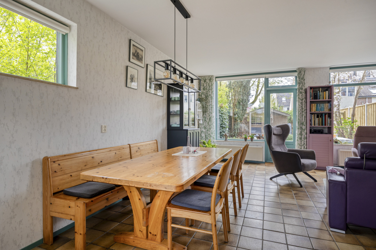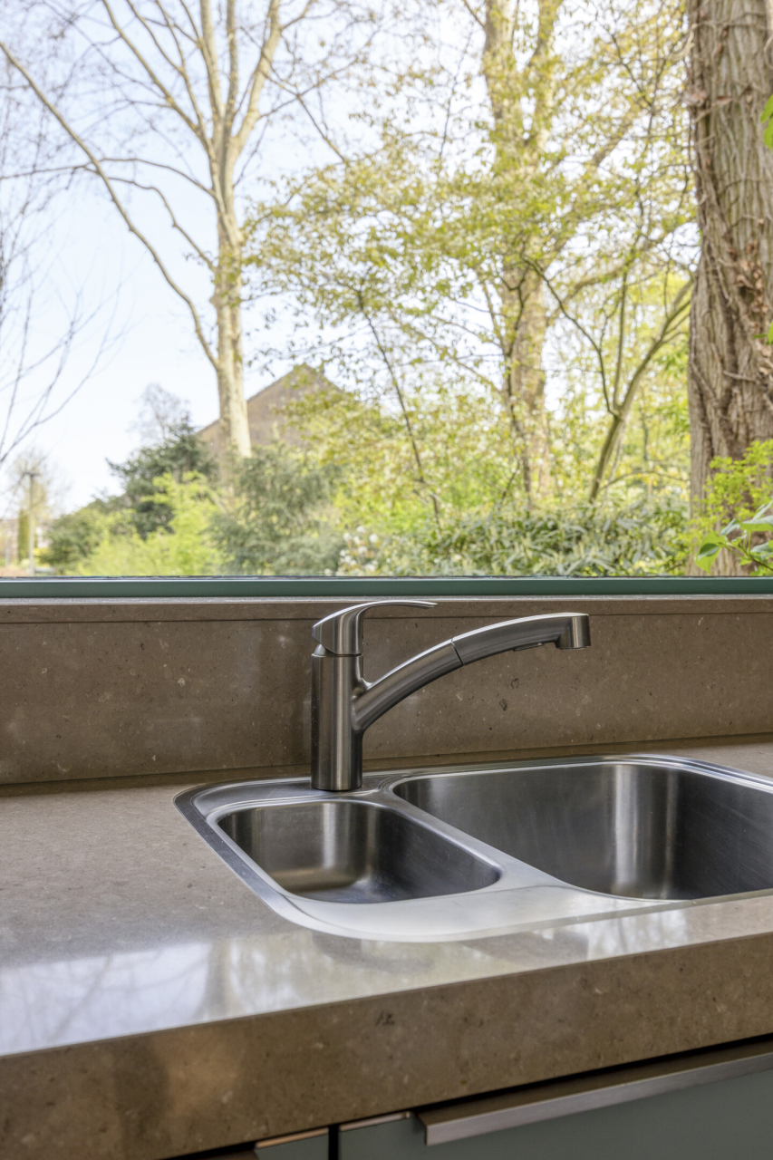 De entree van de woning is aan de voorzijde naast de ingang naar de berging met bergvliering. Deze is ook inpandig bereikbaar. Vanuit de hal met garderobe, meterkast en (hangend) toilet met fonteintje zijn de woonkamer, keuken en berging bereikbaar. De woonkamer is voorzien van een tegelvloer en grote ramen met tuindeur aan de achterzijde die zorgen voor veel lichtinval. Aan de achterzijde is de zithoek met sfeervolle houthaard. De eethoek met zijraam is bij de moderne open keuken. Aan de voorzijde is de moderne open keuken. Deze is voorzien van een composiet aanrechtblad met 1,5 spoelbak en diverse inbouwapparatuur zoals een Siemens 4 pits inductie kookplaat met warmhoudplaat en met Siemens afzuigkap, Siemens stoomoven, Siemens vaatwasser en Liebherr koelvriescombinatie.