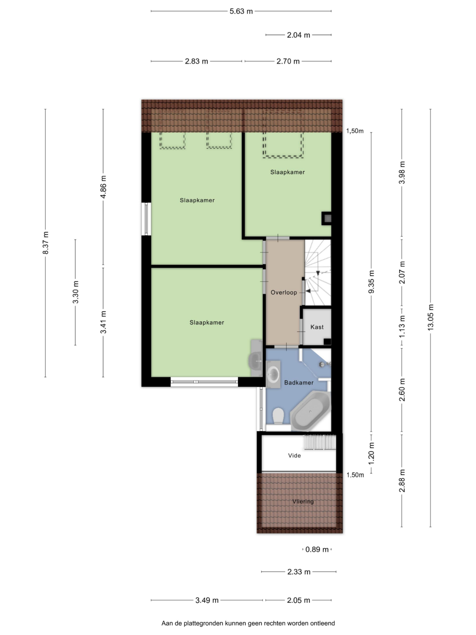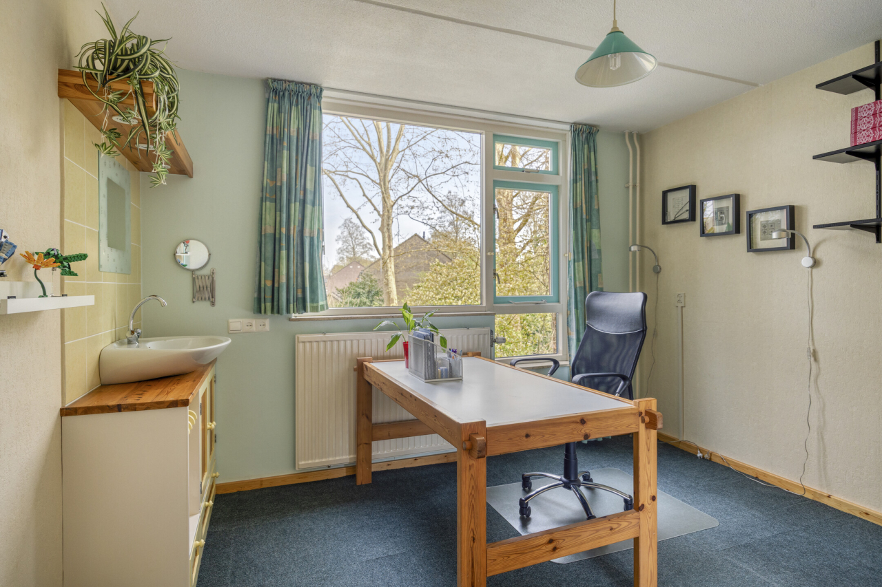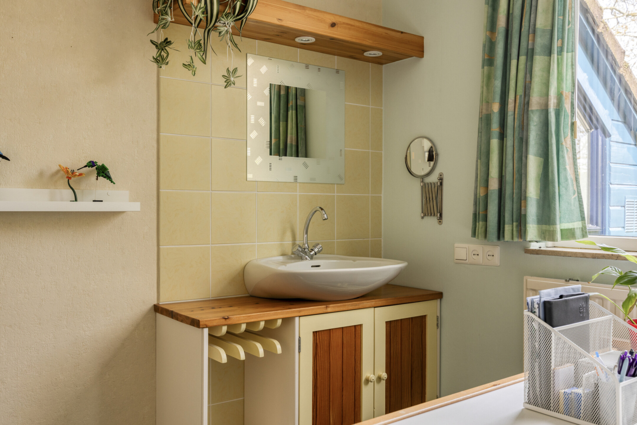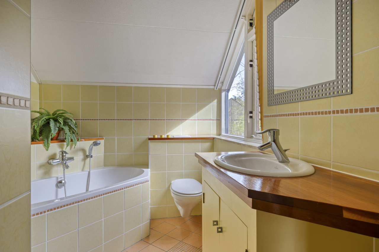 Via de trap in de woonkamer is de 1e verdieping bereikbaar. Hier liggen aan de overloop 3 ruime slaapkamers met vloerbedekking. Aan de achterzijde de ouderslaapkamer met 2 grote dakramen en een zijraam. En de 2e slaapkamer tevens met een groot dakraam. De 2e en 3e slaapkamer zijn op dit moment ingericht als studeerkamer of werkkamer. De slaapkamer aan de voorzijde is voorzien van een eigen wastafel. De volledig betegelde lichte badkamer met vloerverwarming en zijramen is ingericht met een ligbad, wastafelmeubel, 2e toilet en aparte douche met thermostaatkraan.