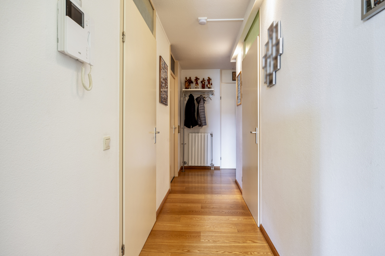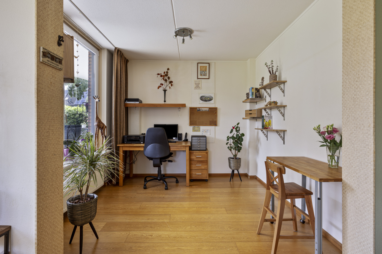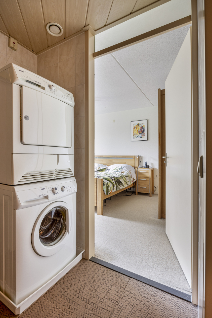 De 2e slaapkamer is op dit moment in gebruik als deel van de woonkamer en als werkkamer maar kan ook eenvoudig verandert worden in de oorspronkelijke 2e slaapkamer. De volledig betegelde badkamer met tapijtegels op de vloer is ingericht met een douchecabine met thermostaatkraan, wastafelmeubel en de witgoedaansluitingen. Er is een deur naar de ouderslaapkamer en de gang.