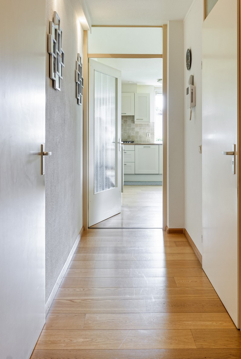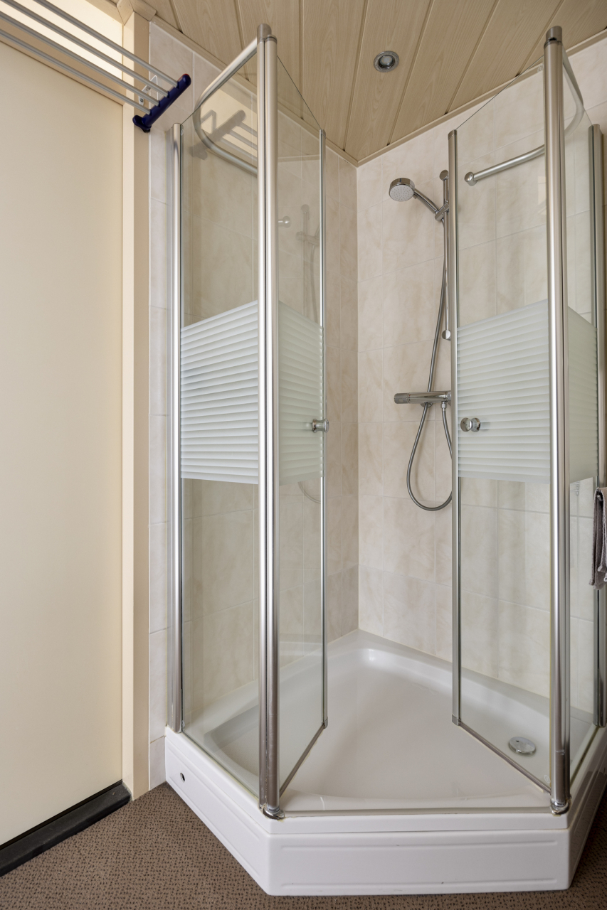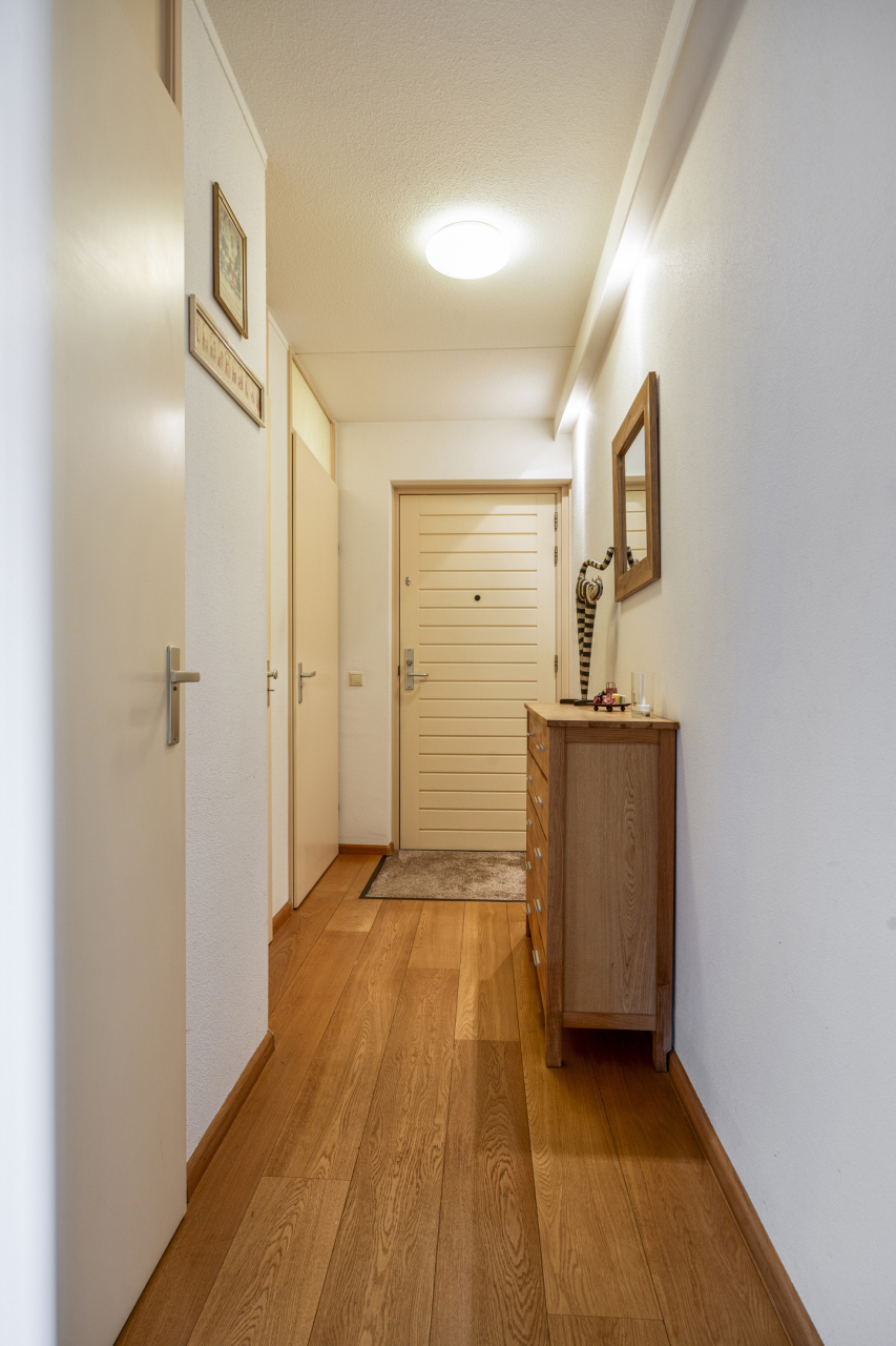 De 2e slaapkamer is op dit moment in gebruik als deel van de woonkamer en als werkkamer maar kan ook eenvoudig verandert worden in de oorspronkelijke 2e slaapkamer. De volledig betegelde badkamer met tapijtegels op de vloer is ingericht met een douchecabine met thermostaatkraan, wastafelmeubel en de witgoedaansluitingen. Er is een deur naar de ouderslaapkamer en de gang.