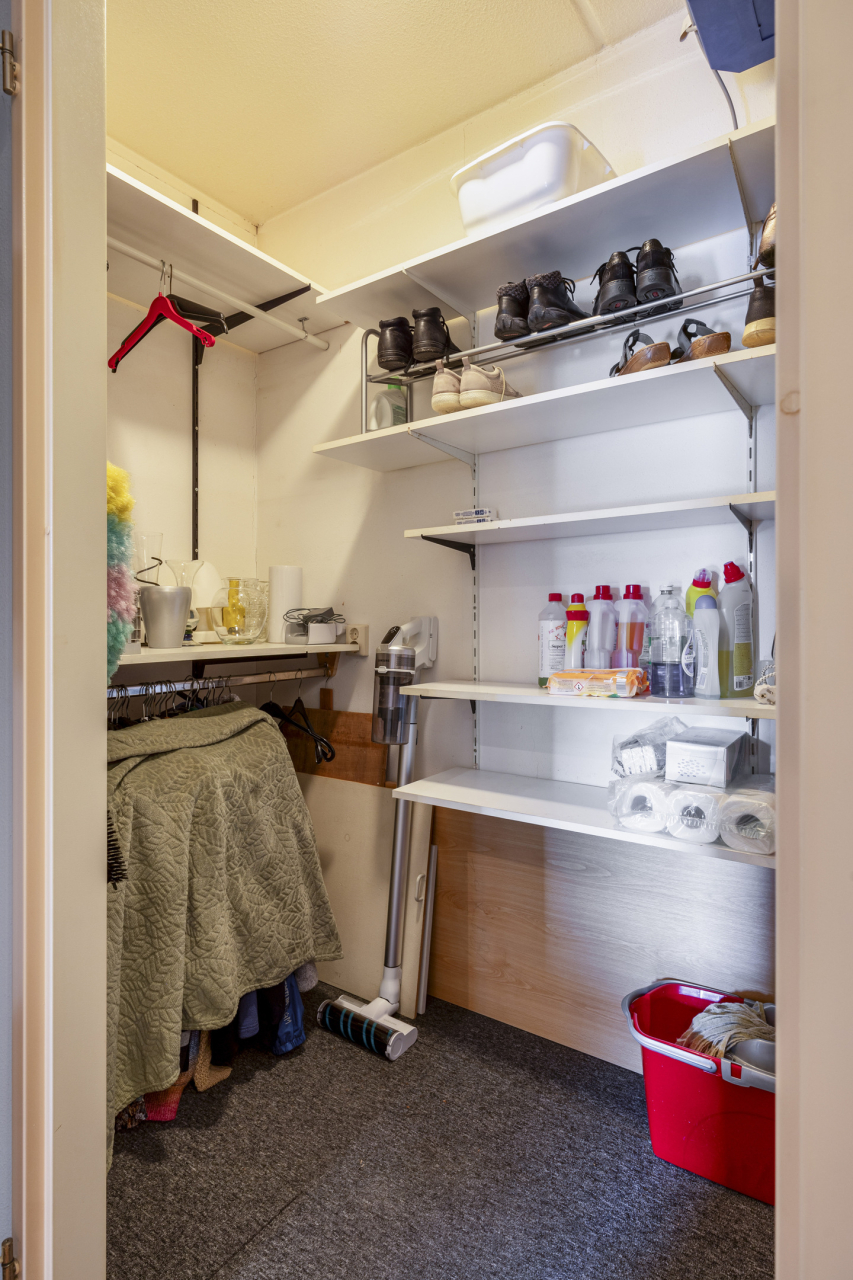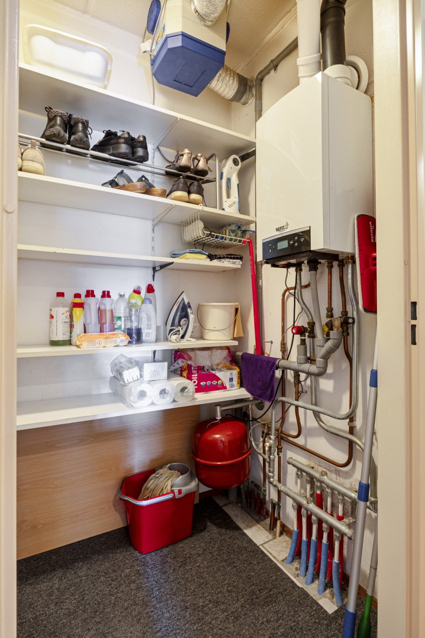 De 1e berging in de gang is voorzien van de Nefit CV HR combi ketel en de mechanische ventilatie box. Verder veel opbergruimte.