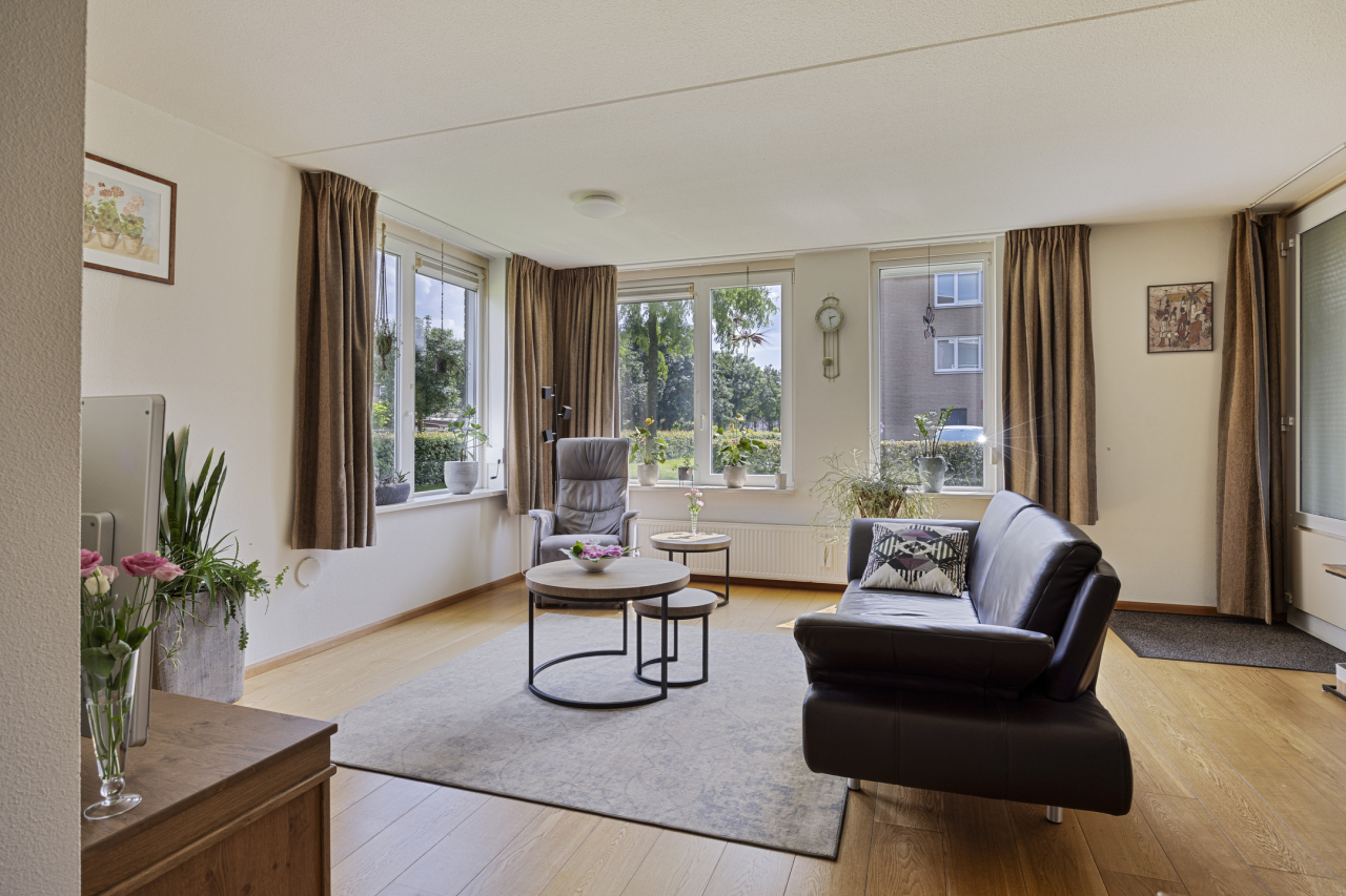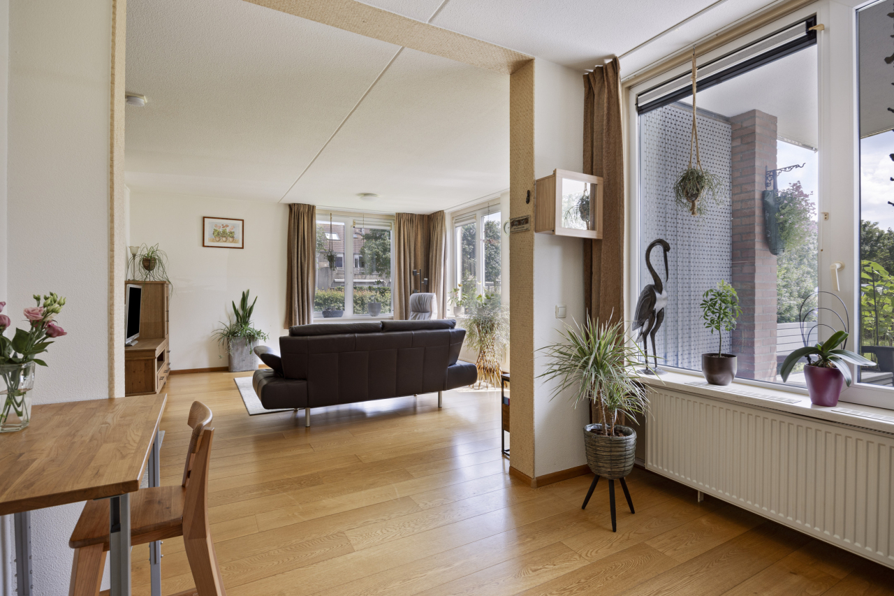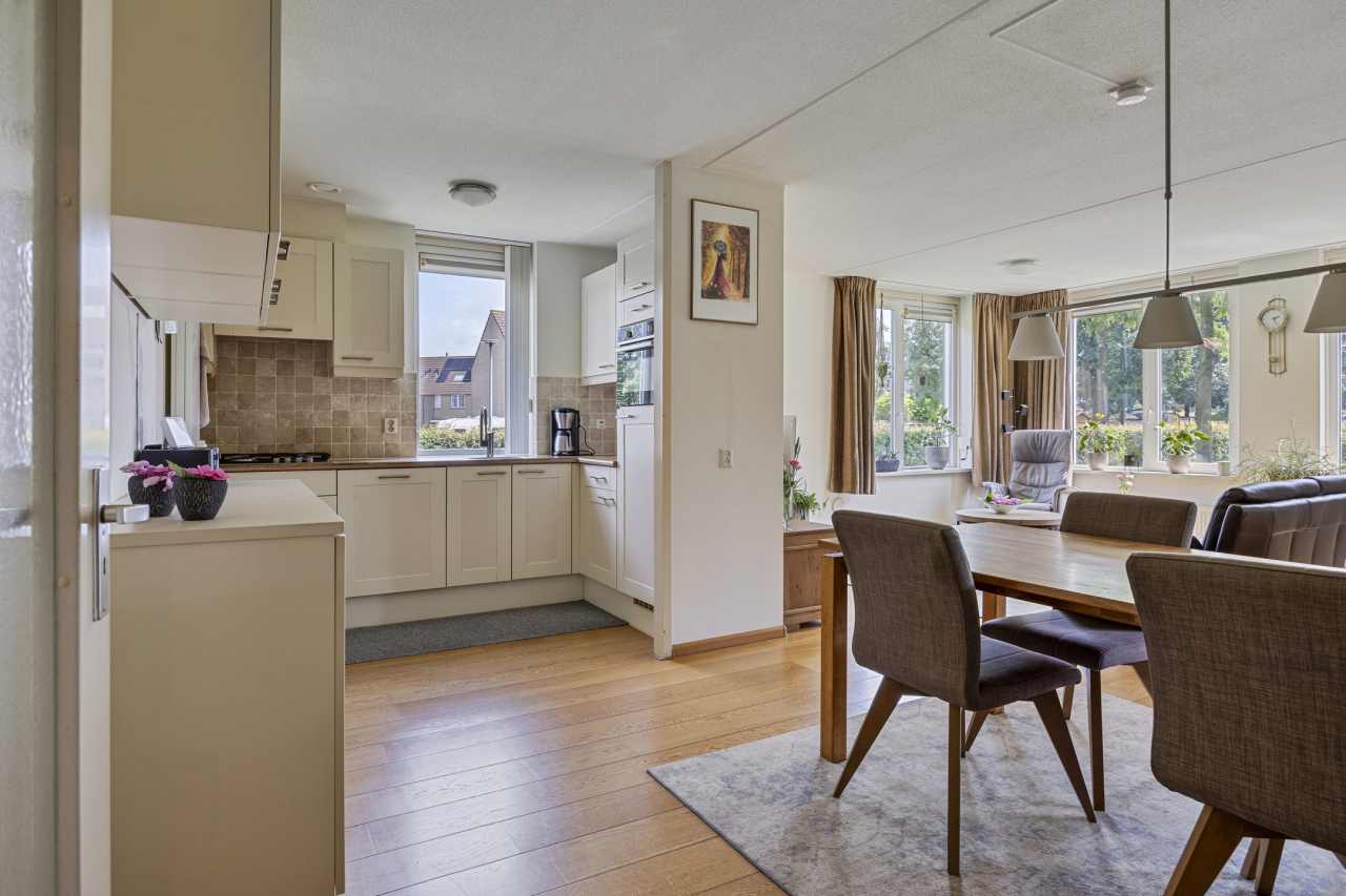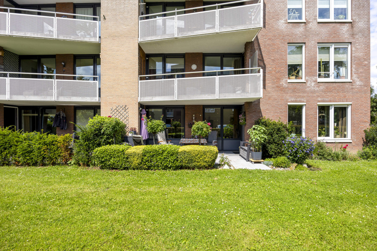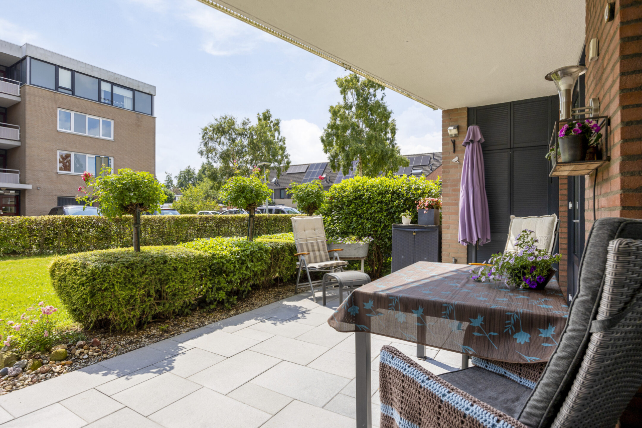 Achter of voor het appartement ligt een zonnig, overdekt terras met inbouwkast. En wat dit appartement uniek maakt is het van de gemeente gehuurde extra stukje tuin welke vloeiend overloopt in de grote, omringende tuin. Verder ligt het appartement naast een brede groenstrook met wandelpad naar de grote speeltuin, kinderboerderij en scholen. De winkels voor de dagelijkse boodschappen en de Tijningenplas liggen vlakbij. Kortom een fijn, licht hoek-appartement, komt u kijken?