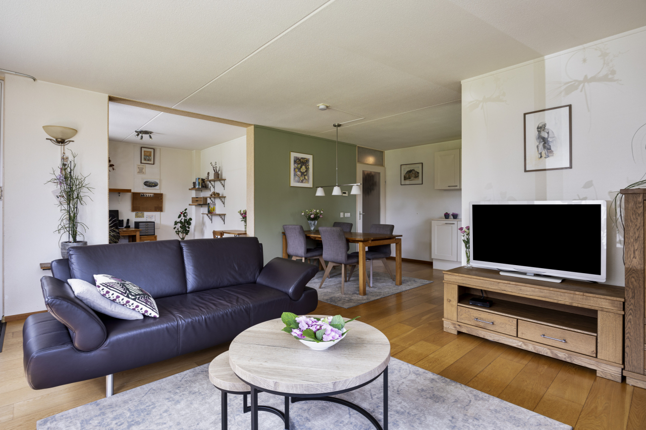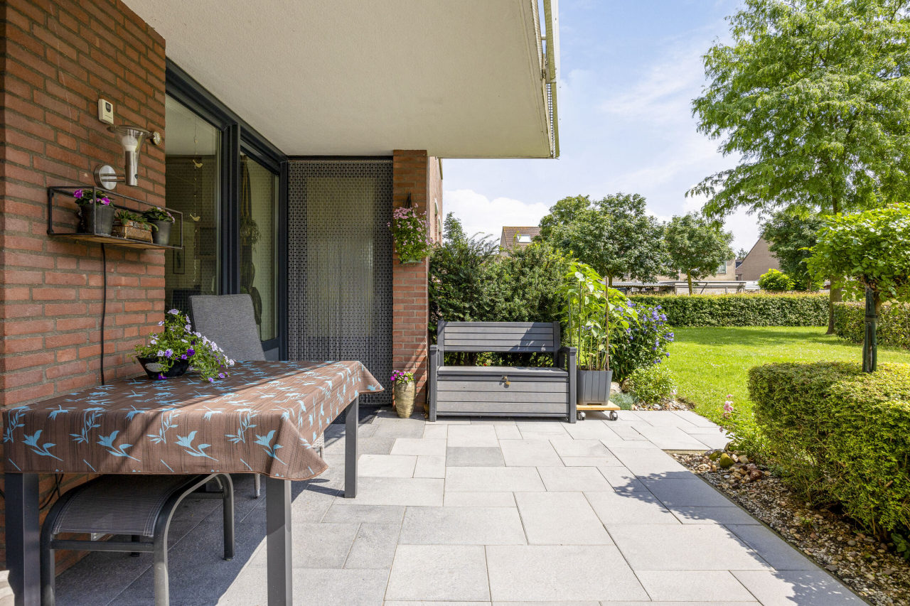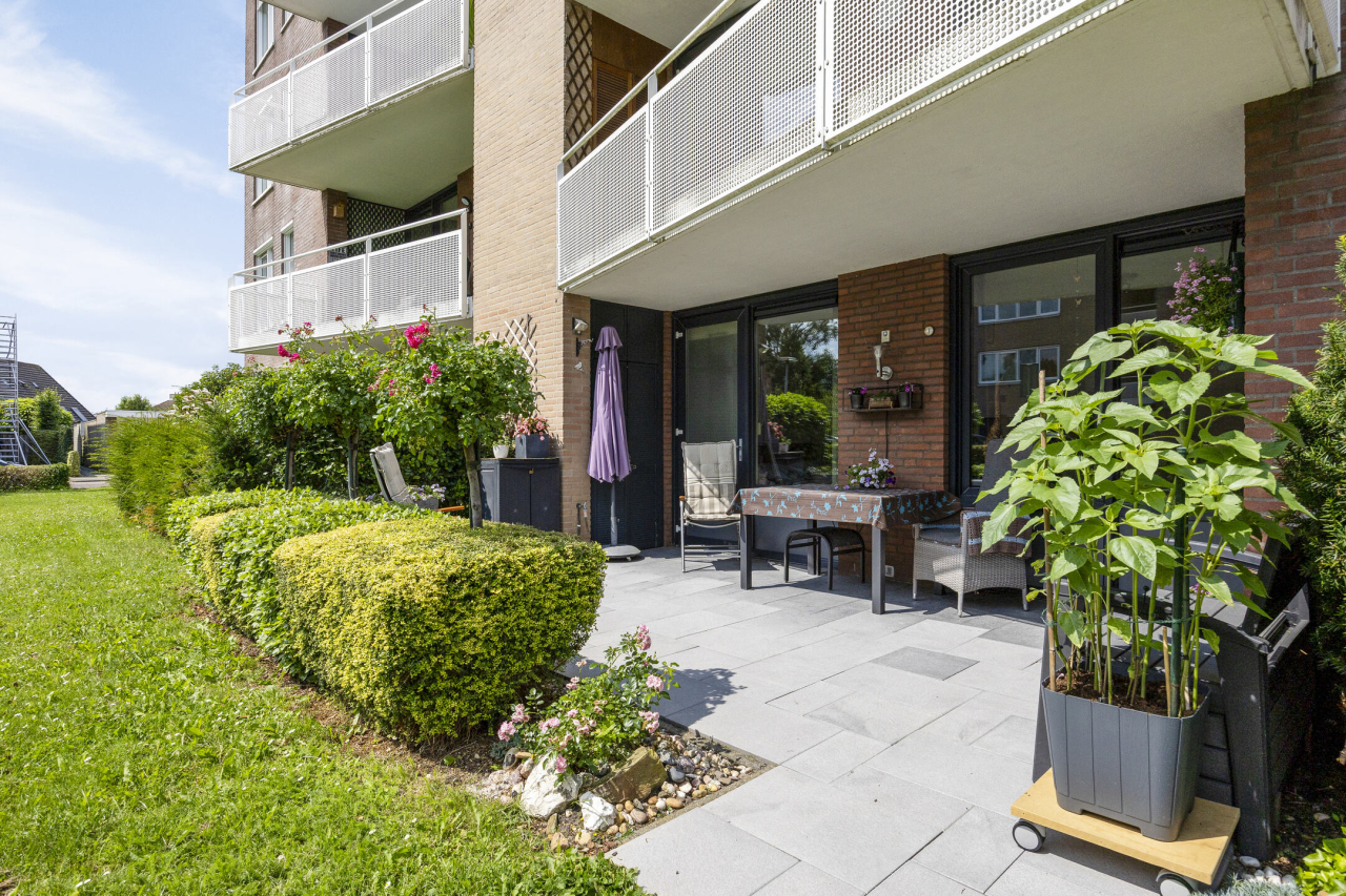 Het 3 -kamer appartement is voorzien van een ruime woonkamer met aansluitend een werkkamer of evt 2e slaapkamer en open keuken. Verder een ruime ouderslaapkamer, badkamer, kleine en grote berging en een zonnig terras met extra stukje tuin.