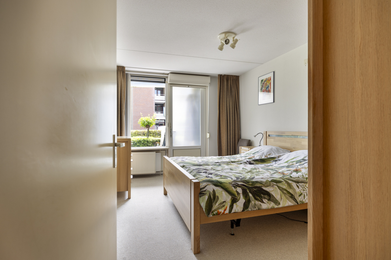 De ouderslaapkamer met vloerbedekking heeft een eigen deur naar de badkamer. Er is tevens een groot raam aan de tuinzijde en een tuindeur naar het overdekte terras. De tuindeur is voorzien van een rolluik.
