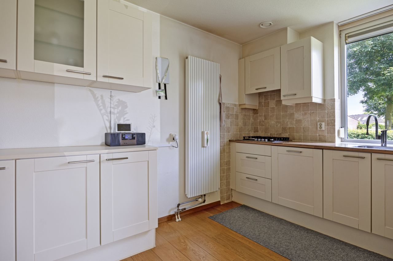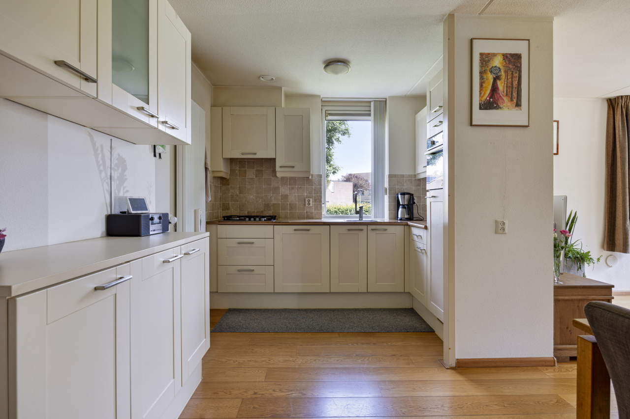 Deze keuken (in 2 delen) met aanrechtblad met spoelbak heeft diverse keukenkasten en inbouwapparatuur zoals een Bauknecht 4 pits gaskookplaat, Bauknecht afzuigkap, Bosch vaatwasser, Etna combimagnetron en Siemens koelkast. Er is tevens een close-in boiler voor snel warm water. Het keukenraam is voorzien van een screen.