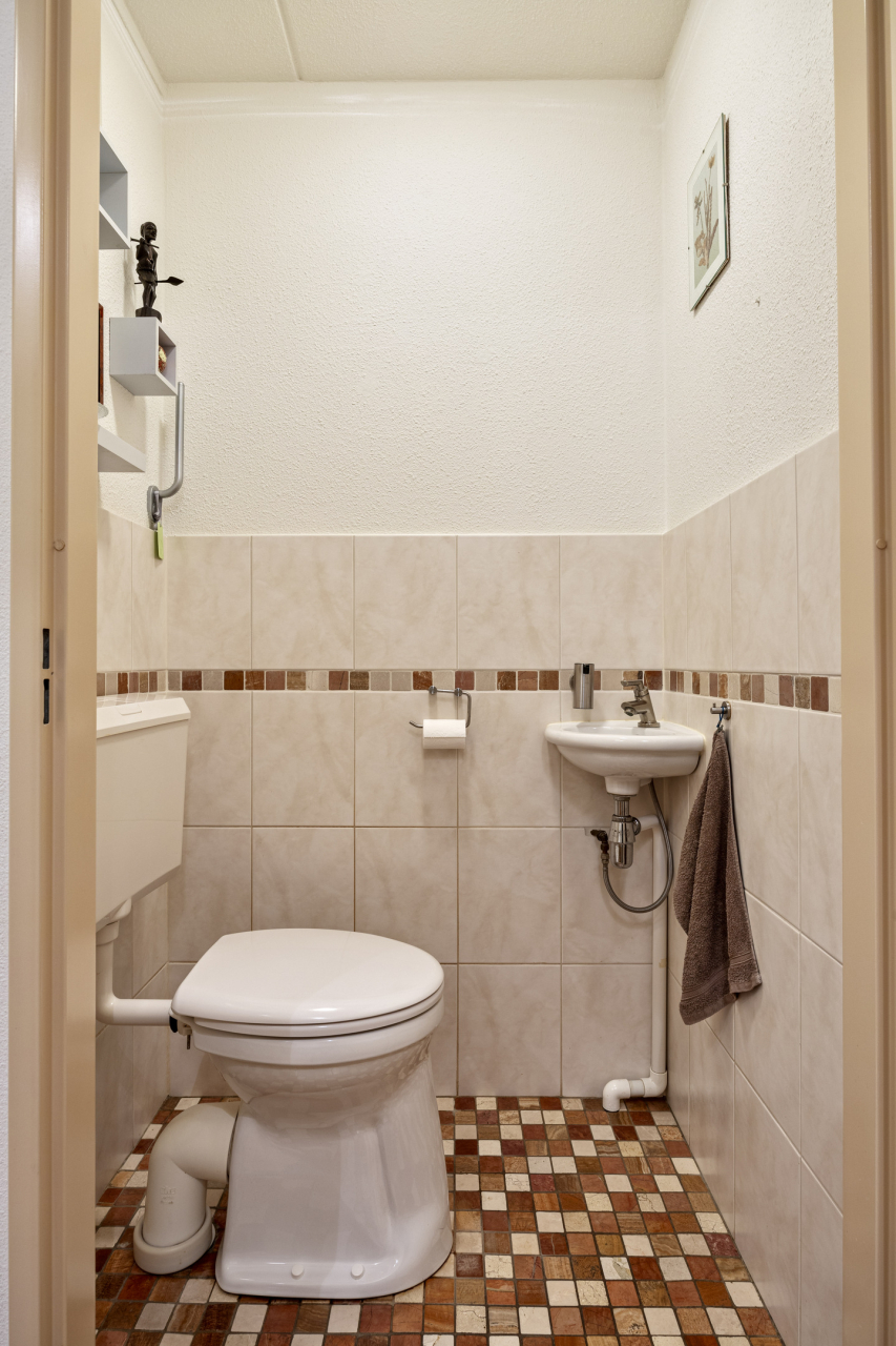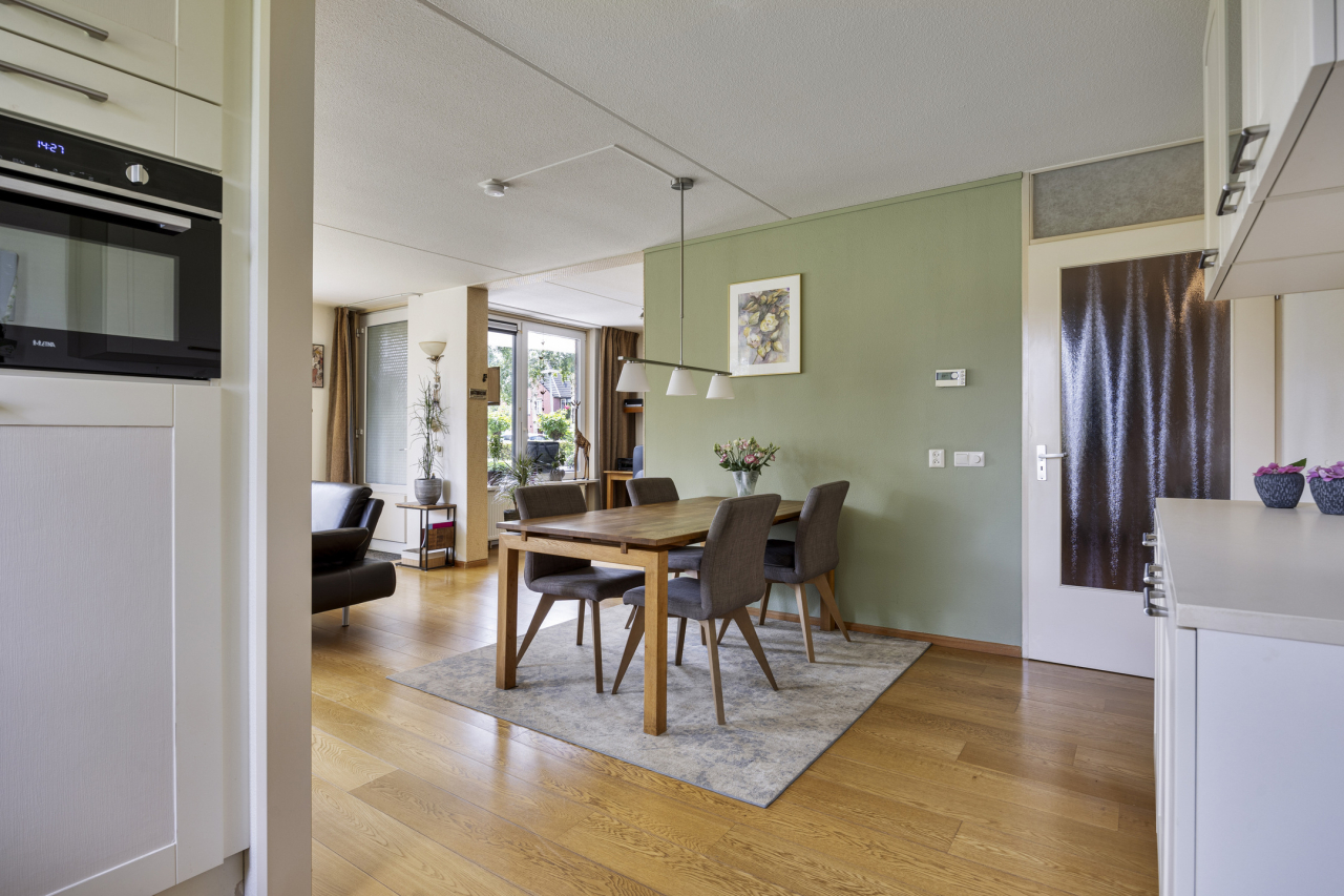 Via de voordeur komt u in de gang met garderobe, meterkast en apart toilet met fonteintje. Aan het einde van de gang bevindt zich de royale en lichte woonkamer met moderne open keuken en deze zijn voorzien van een eiken parketvloer. Aan de tuinzijde is de zithoek met diverse ramen voorzien van een screen. Via een tuindeur is het zonnige terras en extra tuin op het Zuiden bereikbaar. De eethoek ligt bij de open keuken.