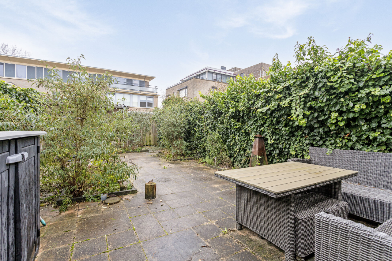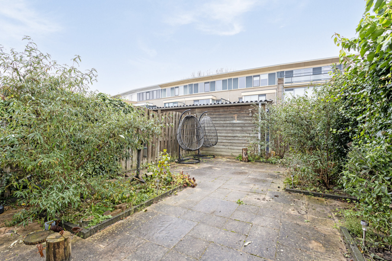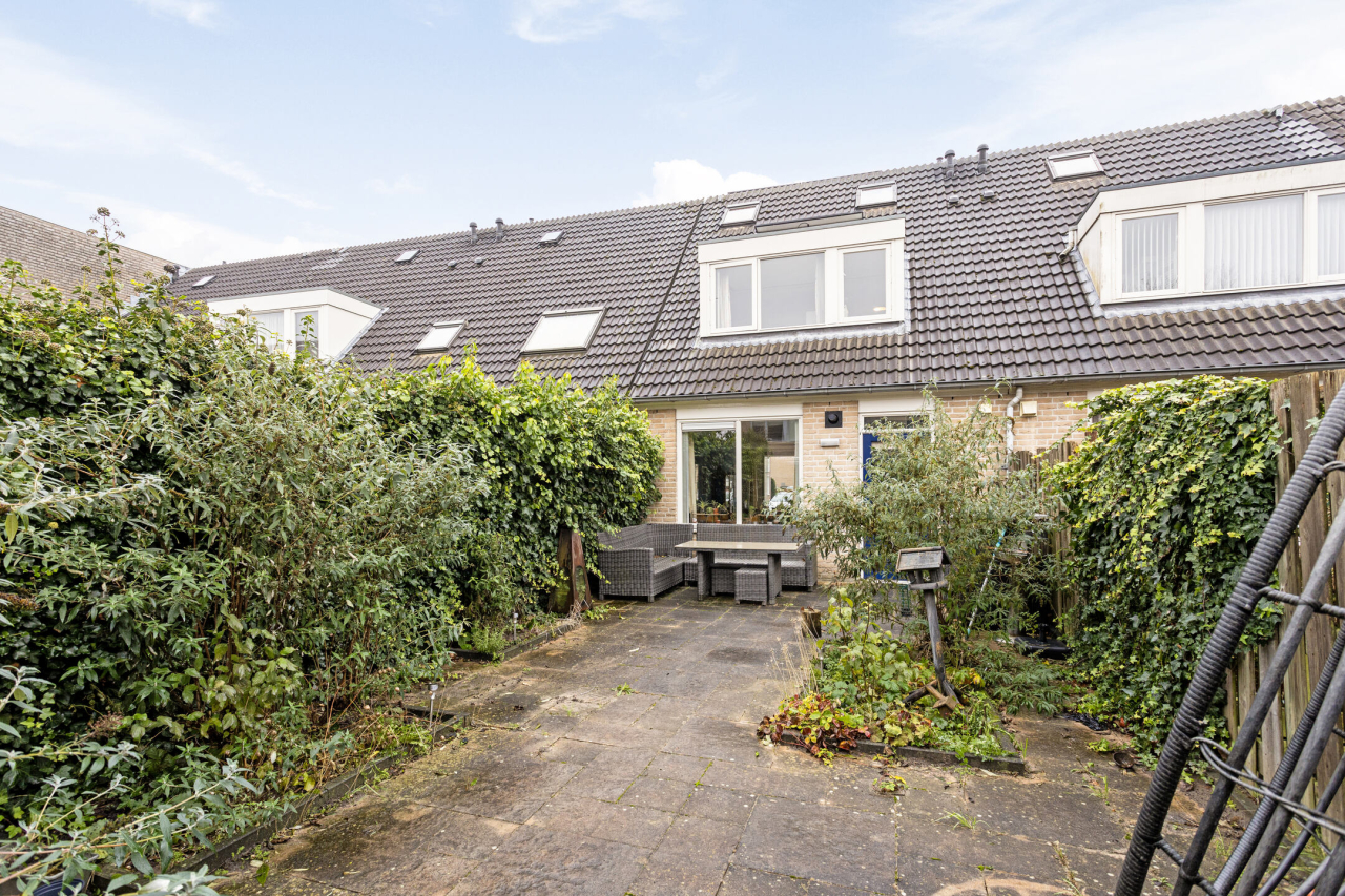 Achter de woning ligt een groene tuin met sierbestrating, borders met beplanting, struiken en een achterom. Er is een groot terras direct achter de woning en achterin de tuin bij de houten berging. Praktisch voor bijvoorbeeld de fietsen en tuingereedschap. De tuin is 13 meter diep, er is dus altijd wel een zonnig plekje te vinden.