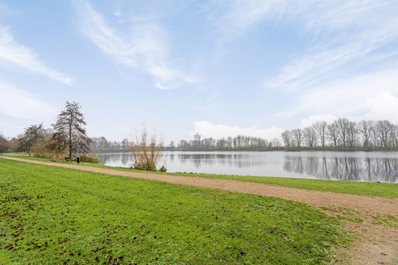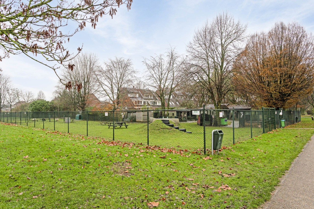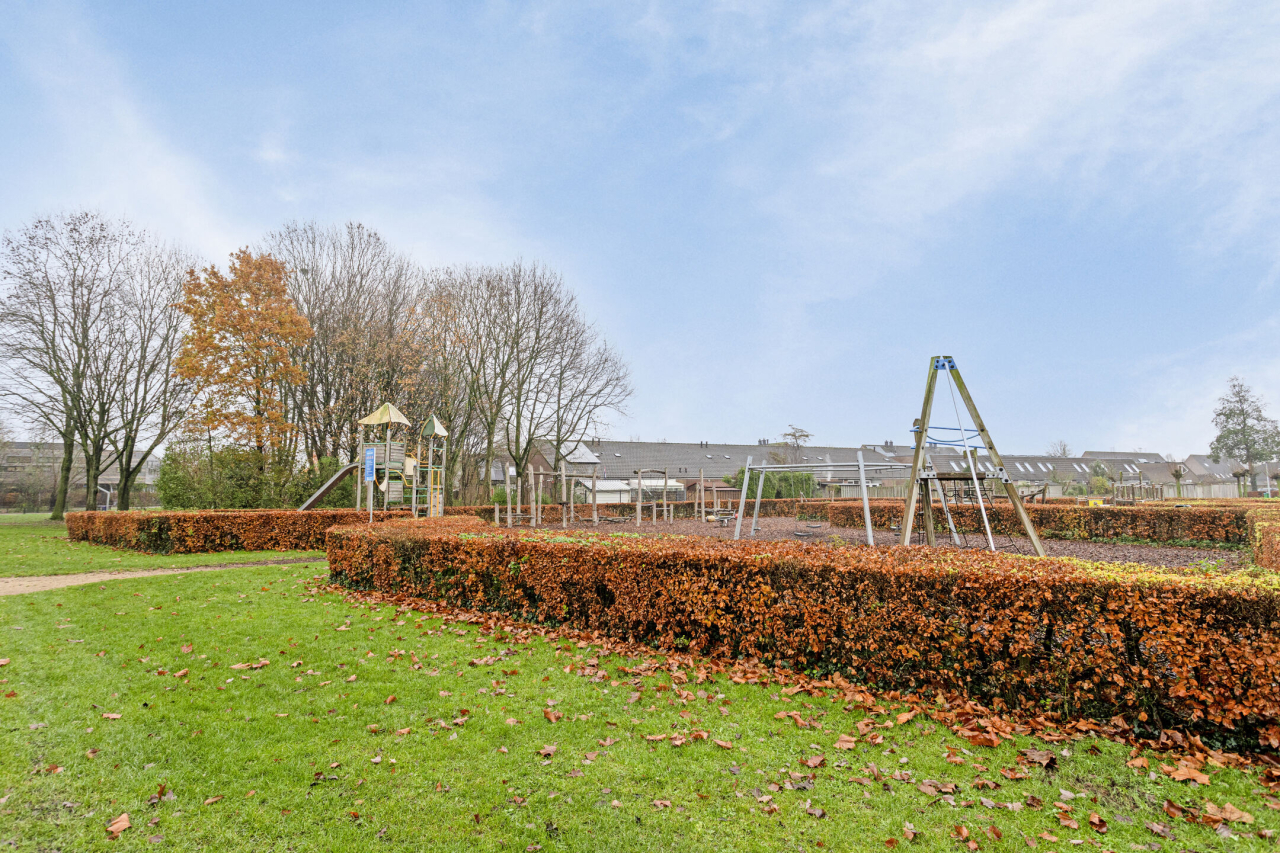 Achter de woning ligt een groene tuin met sierbestrating, borders met beplanting, struiken en een achterom. Er is een groot terras direct achter de woning en achterin de tuin bij de houten berging. Praktisch voor bijvoorbeeld de fietsen en tuingereedschap. De tuin is 13 meter diep, er is dus altijd wel een zonnig plekje te vinden.