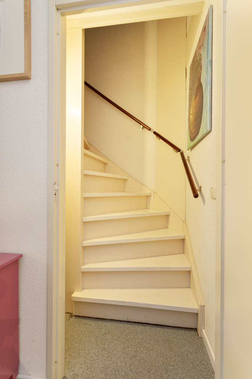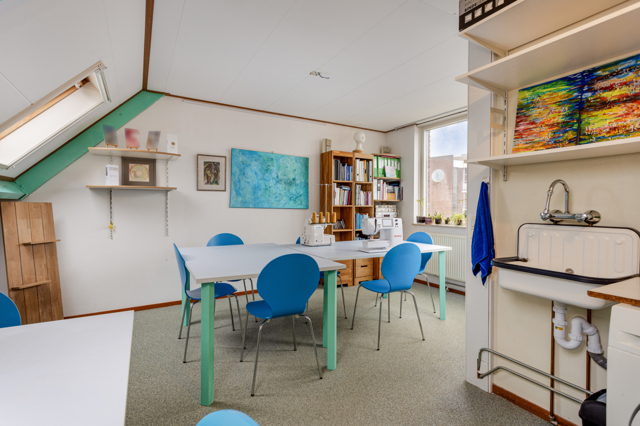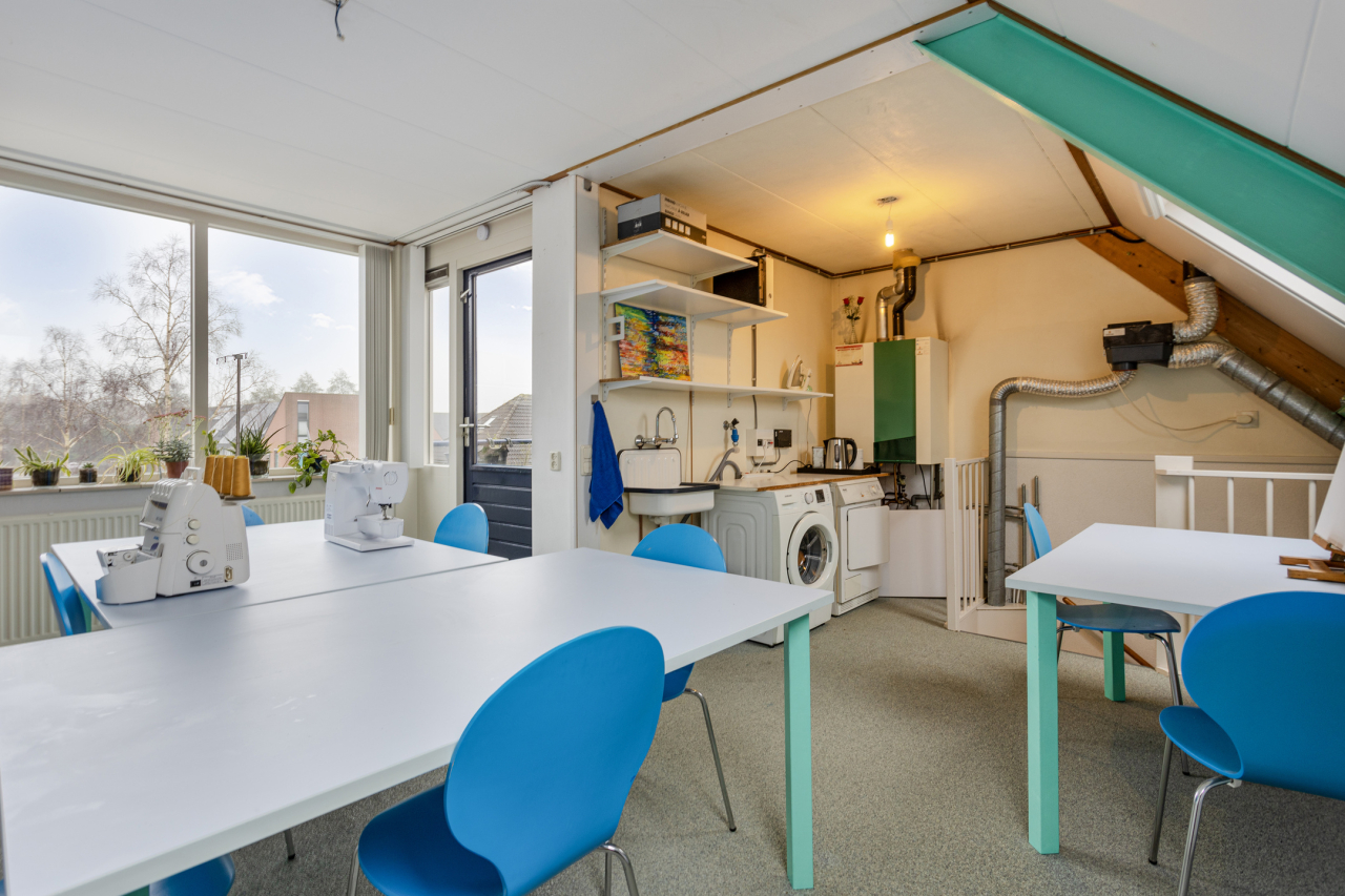 Via een vaste trap is de 2e verdieping bereikbaar met de witgoed-aansluitingen, de mechanische ventilatie unit, de omvormer van de zonnepanelen en de AWB CV HR combiketel. Verder is er een extra wasbakje. Deze verdieping is ingericht als atelier met 2 Velux ramen en aan de voorzijde grote ramen en de deur naar het zonnige dakterras.