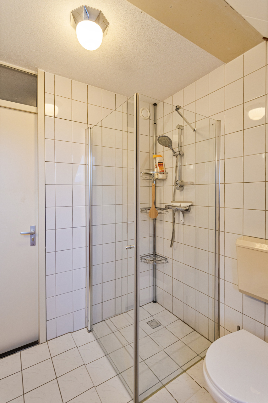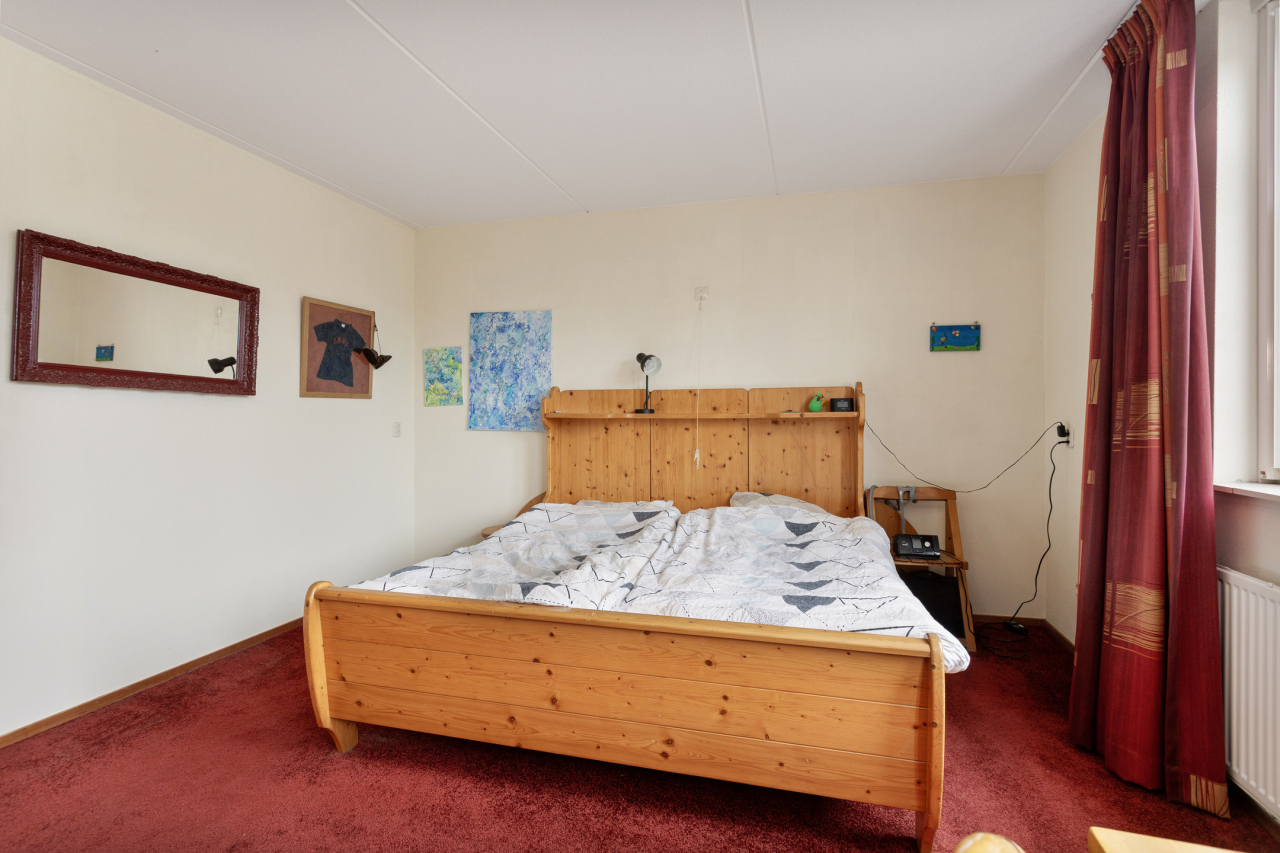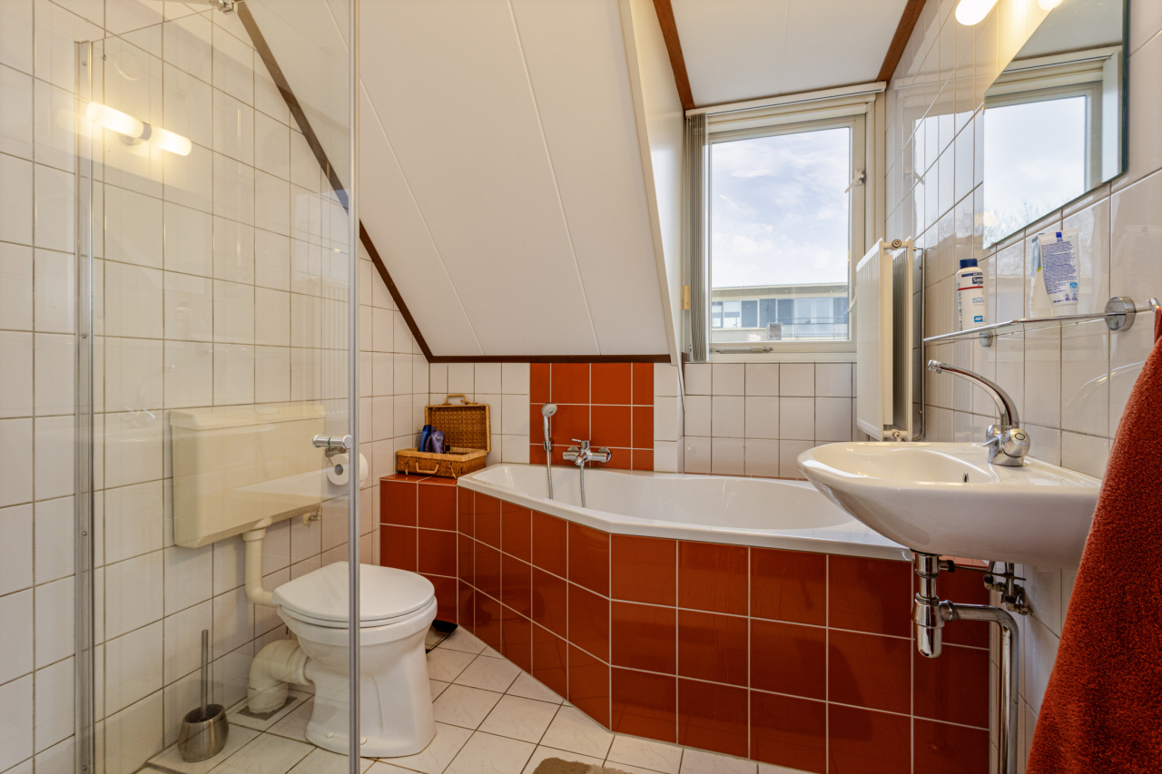Via de trap achter de deur in de woonkamer is de 1e verdieping bereikbaar. Hier liggen aan de overloop 2 ruime slaapkamers (evt 3) en de complete badkamer. De ouderslaapkamer is nu bijzonder groot (oorspronkelijk 2 slaapkamers) voorzien van vloerbedekking en kledingbergruimte. De 2e slaapkamer aan de achterzijde is voorzien van een dakkapel waardoor extra leefruimte is gecreëerd. De complete, volledig betegelde badkamer is ingericht met een douchecabine, ligbad, wastafel en een 2e toilet. Ook hier extra ruimte door de dakkapel.