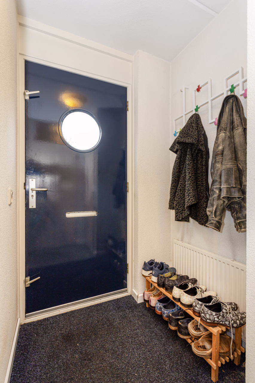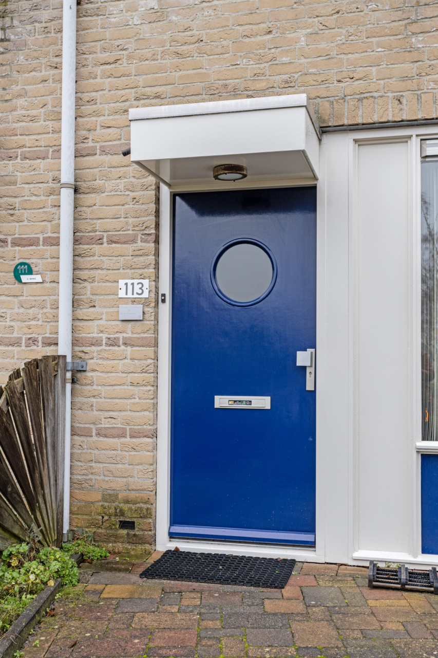 De overdekte entree van de woning is aan de voorzijde met een voordeur met speels rond raam en goed onderhouden buitenschilderwerk van 2022.