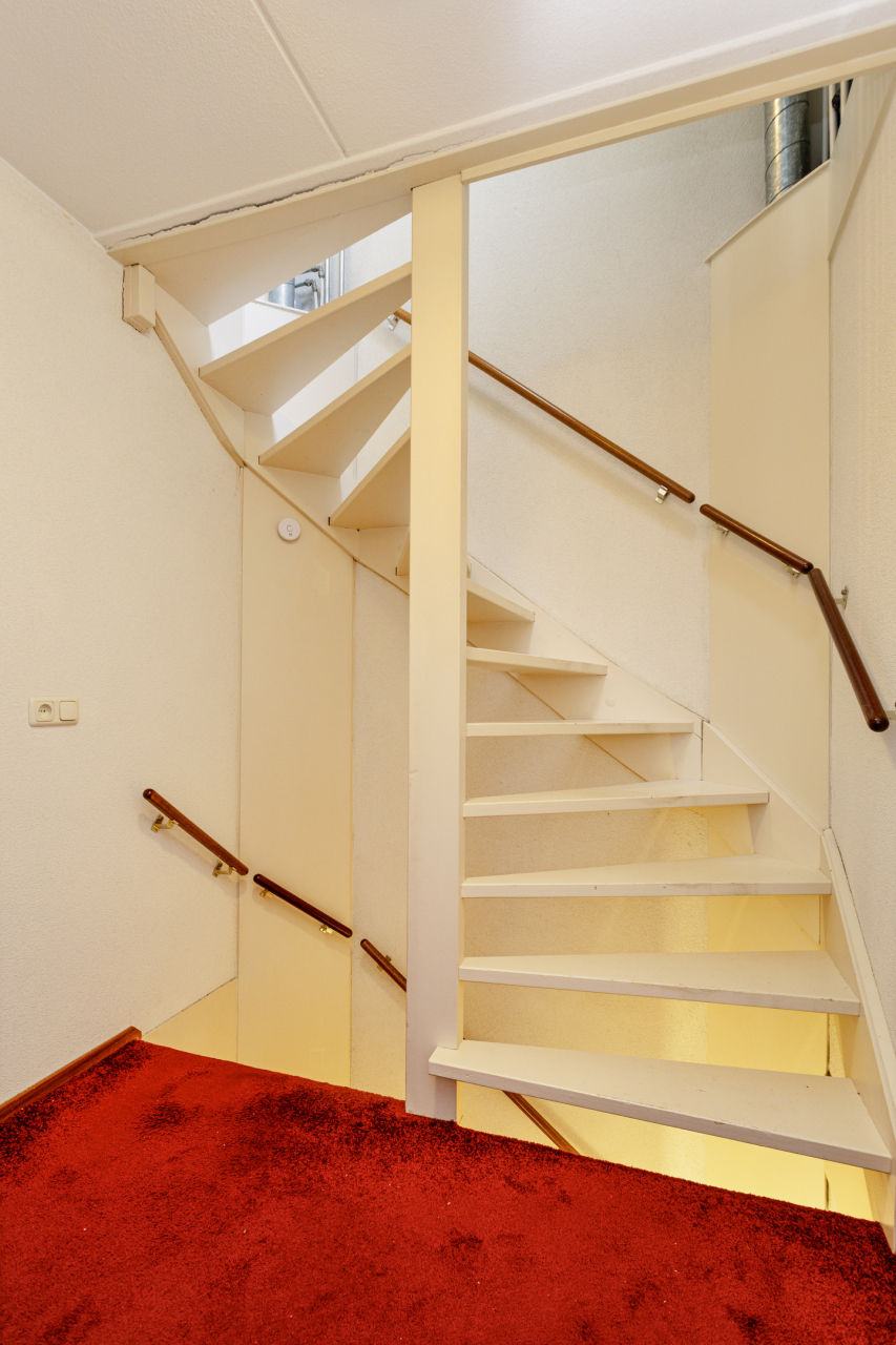 Vanuit de hal met garderobe, meterkast en toilet met fonteintje is de woonkamer bereikbaar. De woonkamer met siergrindvloer is voorzien van een deur met daarachter de trapopgang en trapkast.