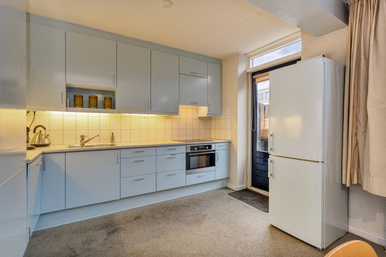 Aan de voorzijde is de zithoek met zicht op de voortuin. En met vrij uitzicht richting de Ravelijn. Aan de achterzijde ligt de eethoek met sfeervolle gashaard bij de open keuken. Deze lichte keuken in L-vorm heeft een aanrechtblad met 1,5 spoelbak en div. inbouwapparatuur. Er is tevens een deur naar de achter tuin en het terras.
