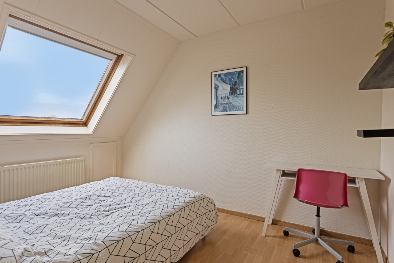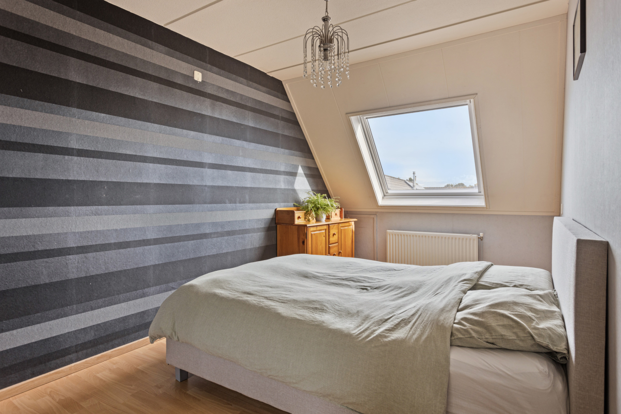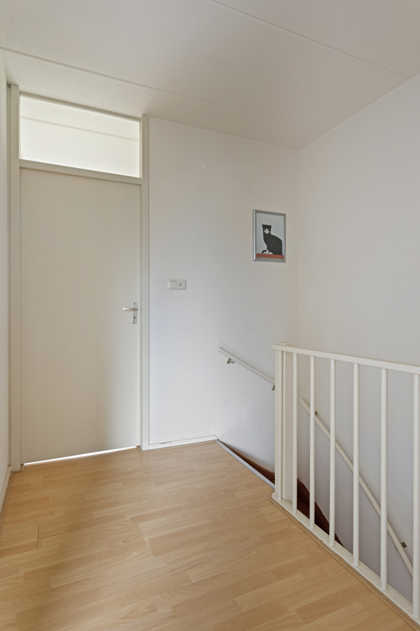 Via de trap in de hal is de 2e verdieping bereikbaar met aan de overloop 3 slaapkamers en de complete badkamer. De ouderslaapkamer aan de achterzijde met laminaatvloer zoals de gehele verdieping, heeft een groot Velux raam en een grote kast met schuifdeuren. De 2e slaapkamer ligt aan de voorzijde en heeft ook een groot Veluxraam met daaronder bergruimte achter de knieschotten. De 3e slaapkamer is aan de achterzijde met laminaatvloer en Veluxraam. De volledig betegelde badkamer in zwart /wit tinten, is ingericht met een ligbad, aparte douche , wastafel, designradiator en 2e toilet. Aan de overloop is een kast met de witgoedaansluiting, CV HR ketel en mechanische ventilatie unit.