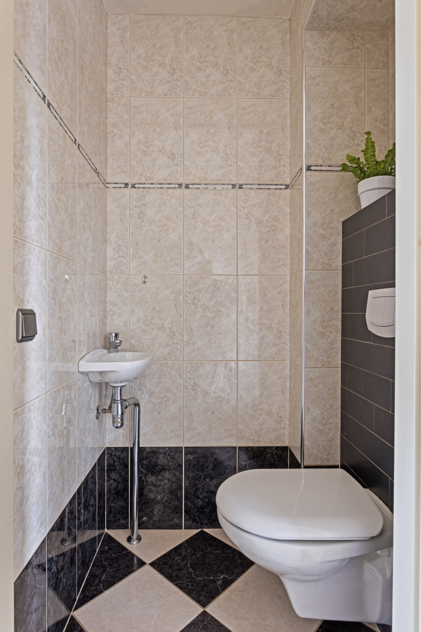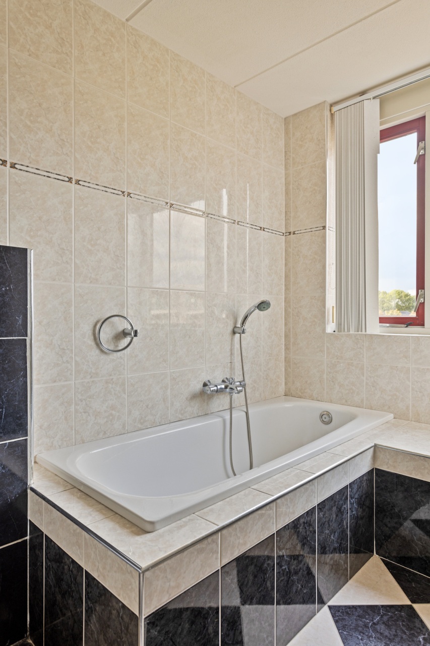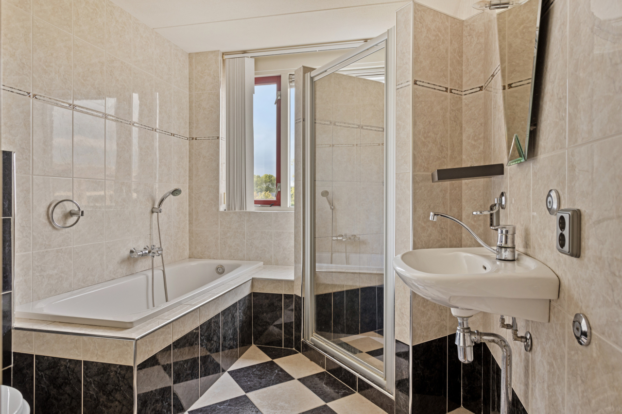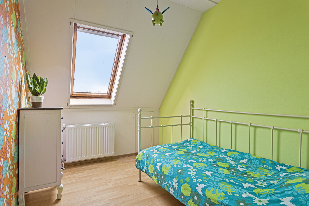 Via de trap in de hal is de 2e verdieping bereikbaar met aan de overloop 3 slaapkamers en de complete badkamer. De ouderslaapkamer aan de achterzijde met laminaatvloer zoals de gehele verdieping, heeft een groot Velux raam en een grote kast met schuifdeuren. De 2e slaapkamer ligt aan de voorzijde en heeft ook een groot Veluxraam met daaronder bergruimte achter de knieschotten. De 3e slaapkamer is aan de achterzijde met laminaatvloer en Veluxraam. De volledig betegelde badkamer in zwart /wit tinten, is ingericht met een ligbad, aparte douche , wastafel, designradiator en 2e toilet. Aan de overloop is een kast met de witgoedaansluiting, CV HR ketel en mechanische ventilatie unit.