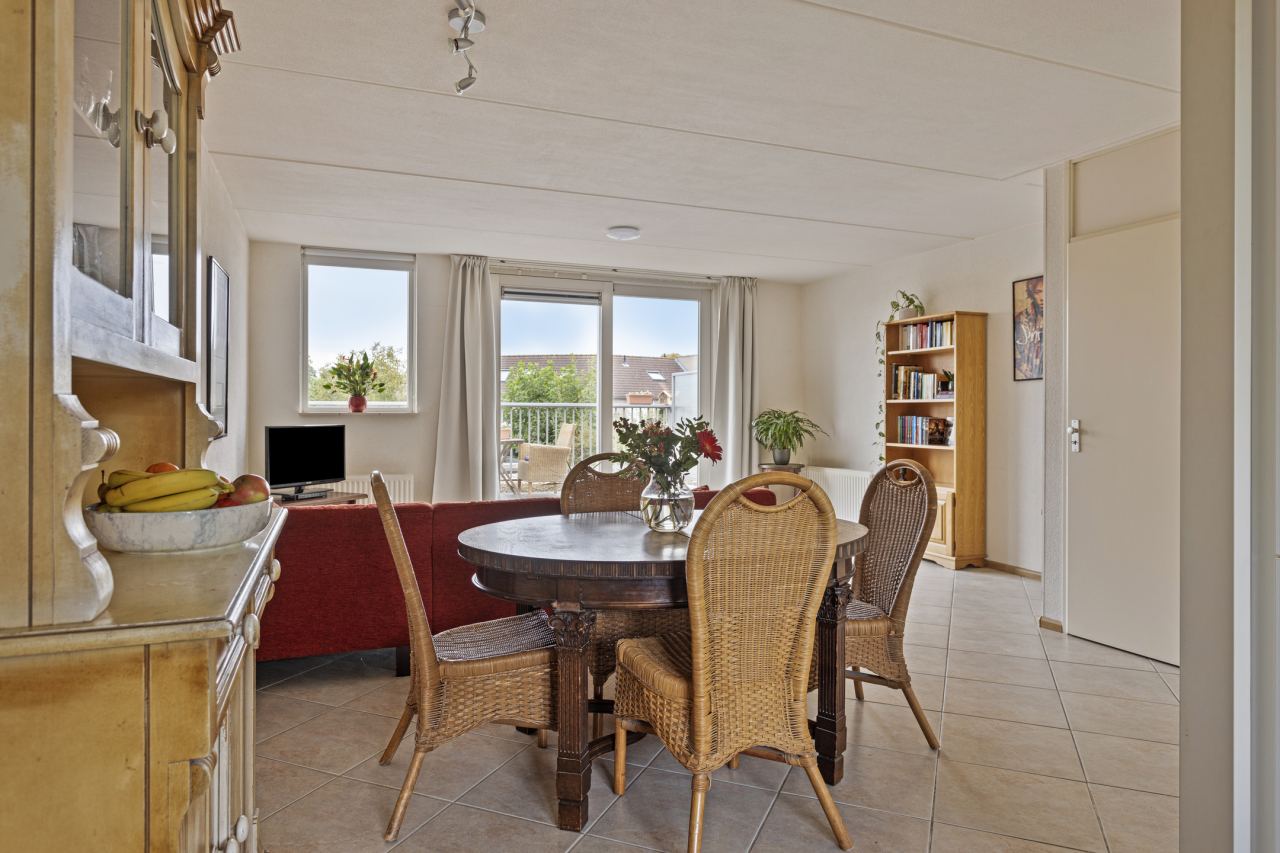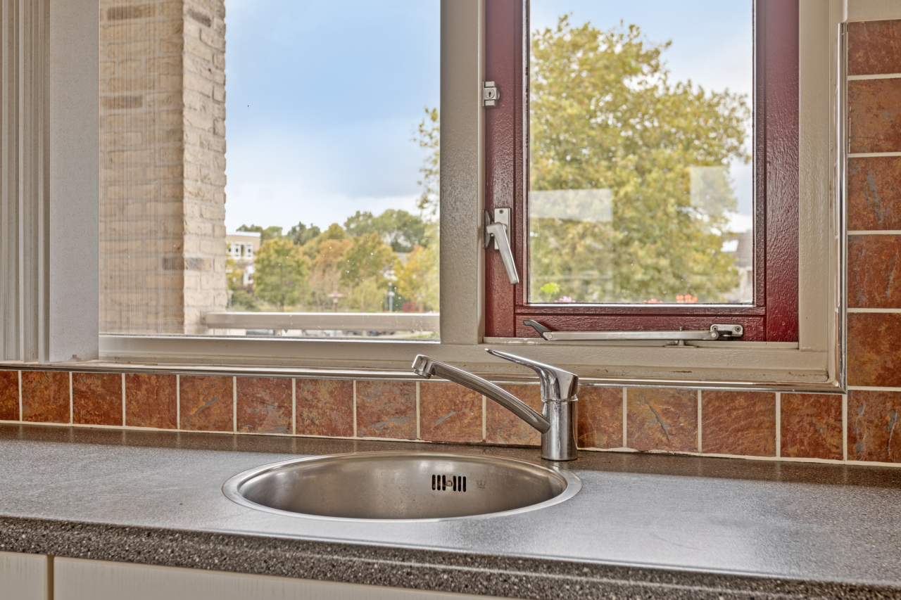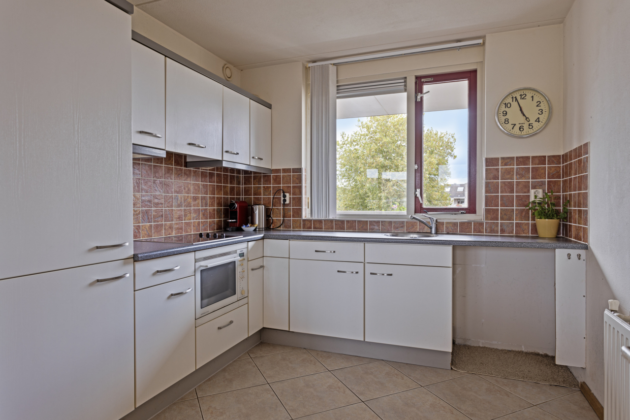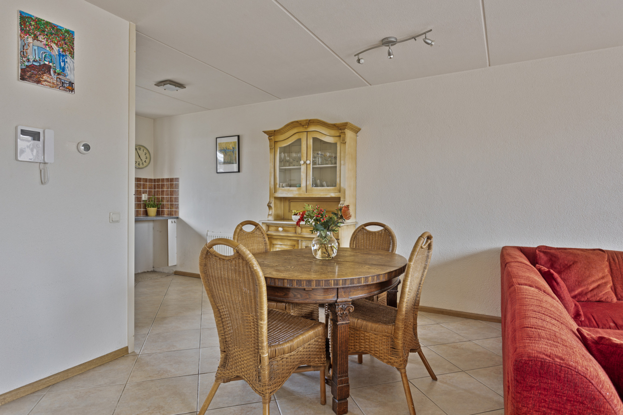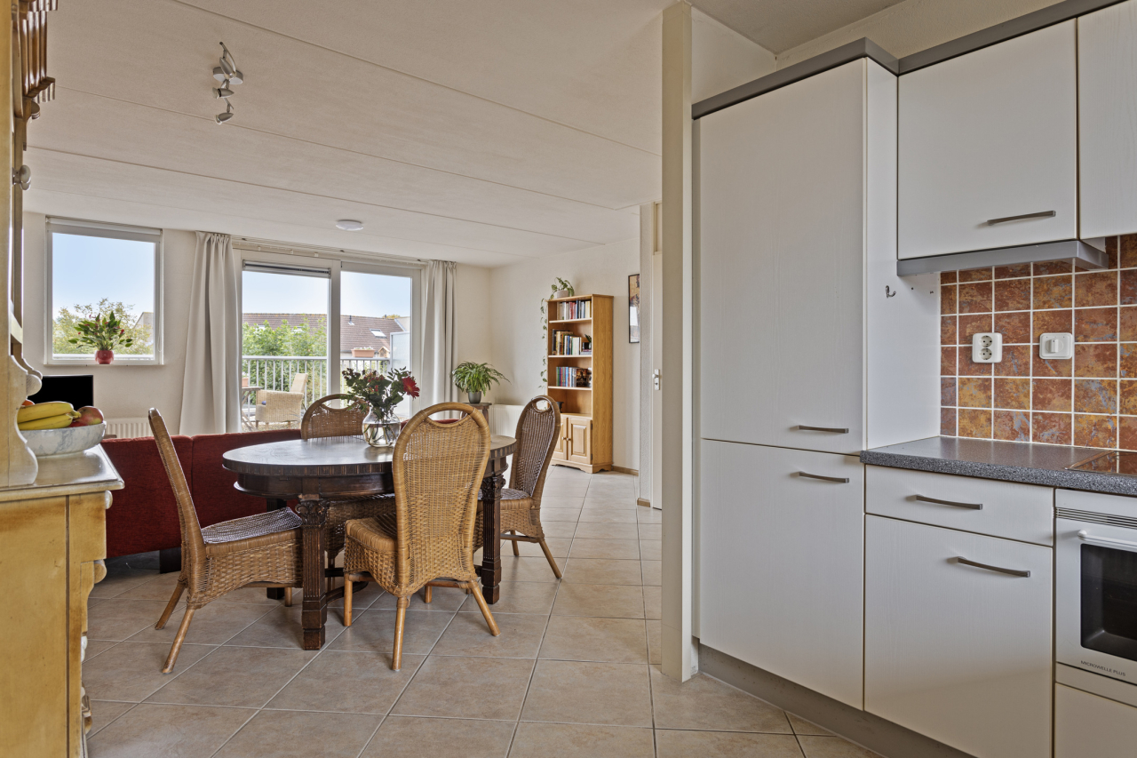 De gehele verdieping is voorzien van een lichte tegelvloer. De eethoek ligt bij de open keuken. Deze keuken (in L vorm) met aanrechtblad met ronde spoelbak heeft diverse keukenkasten en inbouwapparatuur zoals een Siemens elektrische 4 pits kookplaat, Siemens oven en een koelkast. Het keukenraam kijkt uit op het plein.