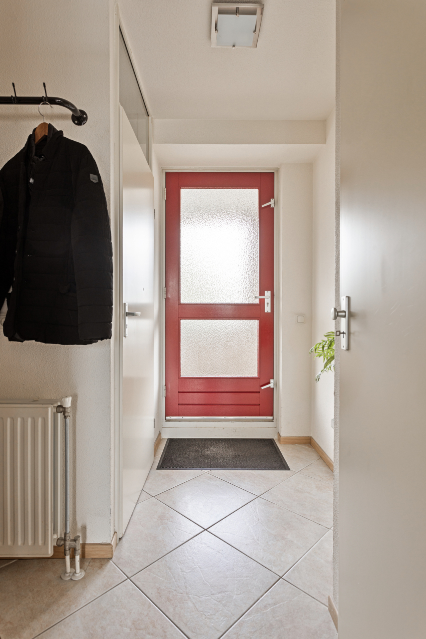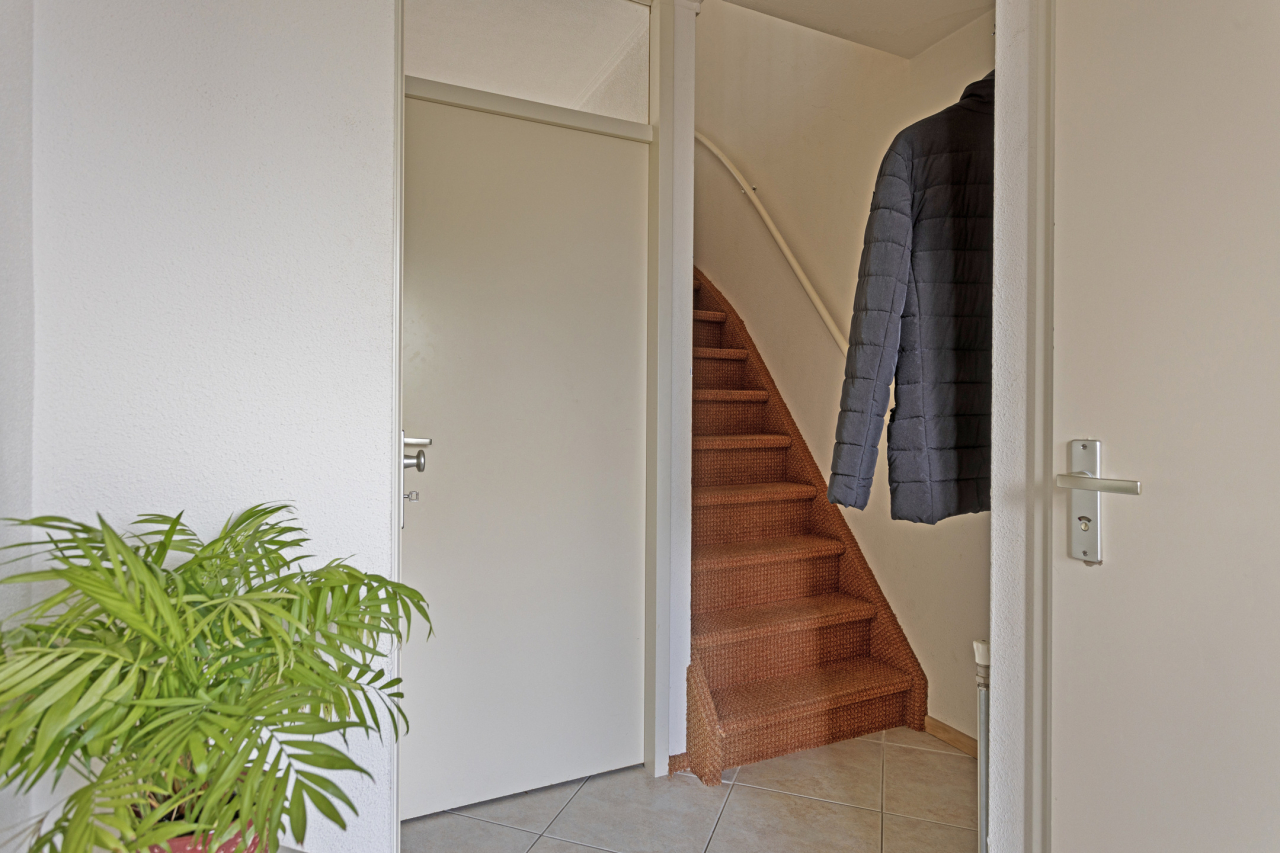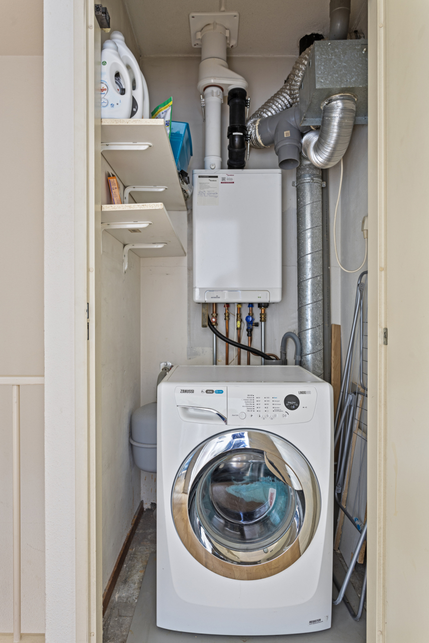 Via de hal met trapopgang, meterkast en toilet met fonteintje is de woonkamer bereikbaar. De ruime woonkamer heeft een praktisch trapkast en een schuifpui naar het dakterras op het Zuiden. Aan de achterzijde is de zithoek met zicht op het zonnige dakterras.