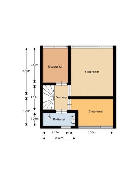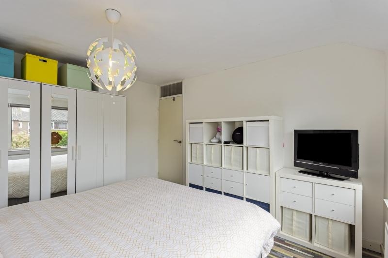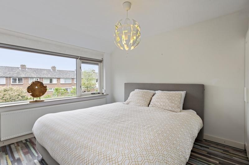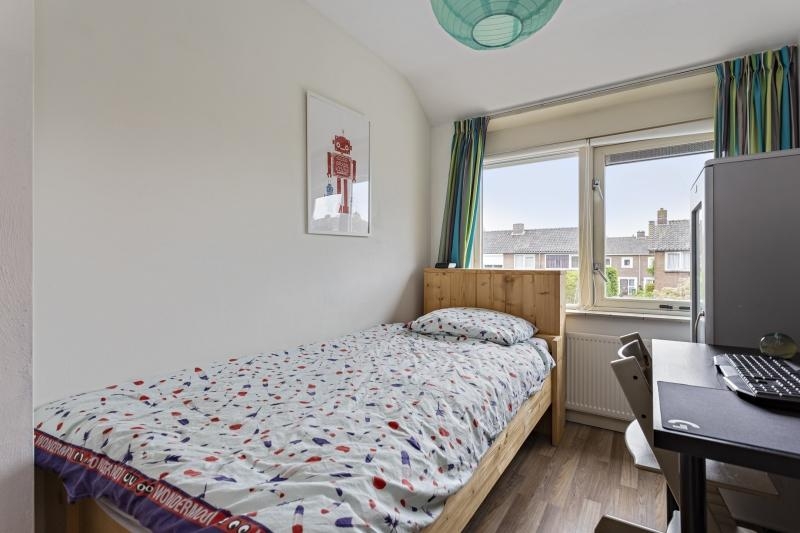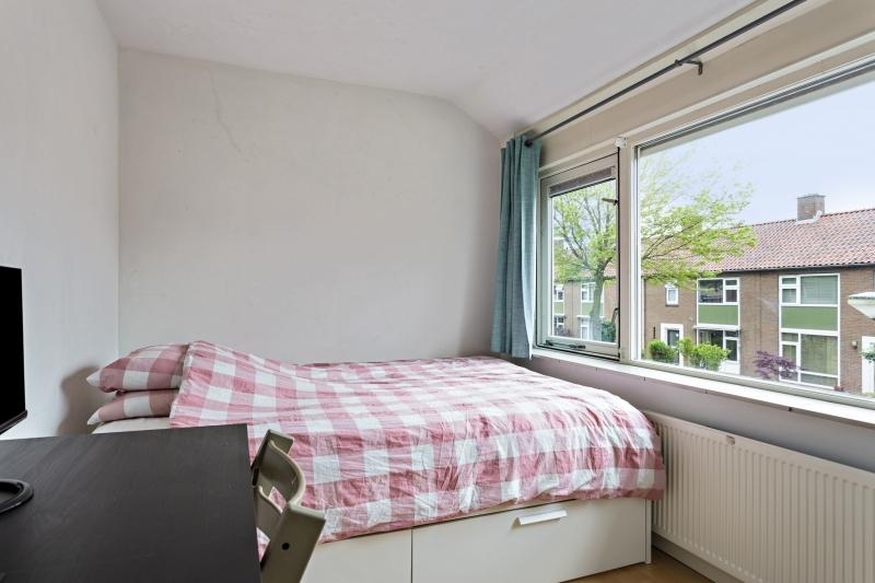 De slaapkamer aan de achterzijde is tevens voorzien van een groot raam, bijna over de volledige breedte van de kamer. De 3e slaapkamer tevens aan de achterzijde is net als de andere slaapkamers voorzien van een laminaatvloer. Op de overloop is een praktische, smalle inbouwkast.