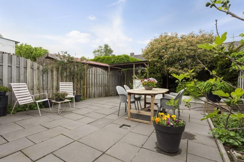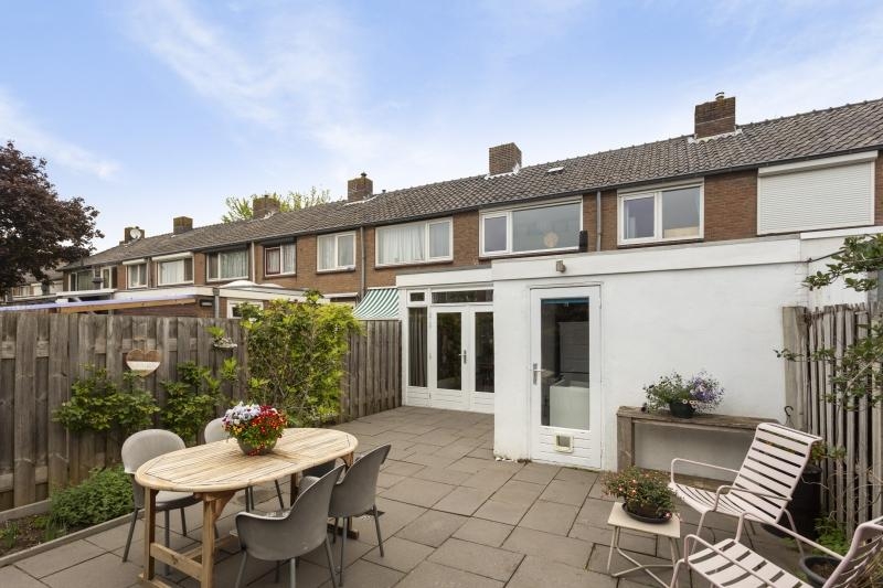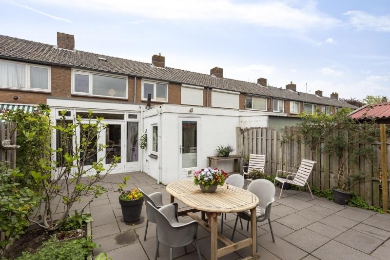 Achter de woning ligt een onderhoudsvriendelijke tuin op het Zuid ndash;Westen met achterom. De tuin is grotendeels betegeld en met achterin en aan de zijkanten borders met beplanting, boompjes en struiken. Bij de achterpoort is een overkapping gemaakt voor extra bergruimte.
