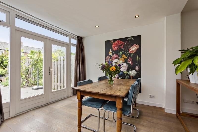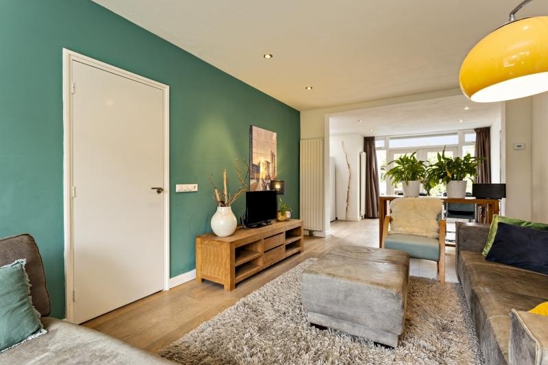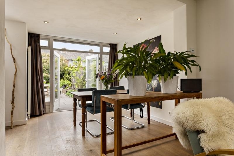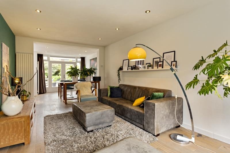 De ruime woonkamer heeft een uitbouw aan de achterzijde en is voorzien van een mooie houten parketvloer. Aan de voorzijde is de zithoek met deur naar de hal. Aan de achterzijde, bij de eethoek zijn mooie openslaande deuren naar het terras en de tuin op het Zuid- Westen.