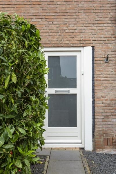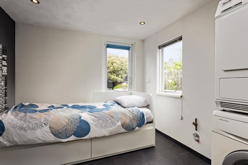 Achter de keuken is de bijkeuken nu in gebruik als slaapkamer met dezelfde tegelvloer met vloerverwarming. Deze is voorzien van de witgoedaansluitingen en de CV HR ketel (Vaillant). Er is tevens een wasbak, raam en een deur naar de tuin.
