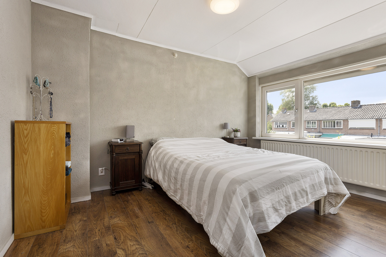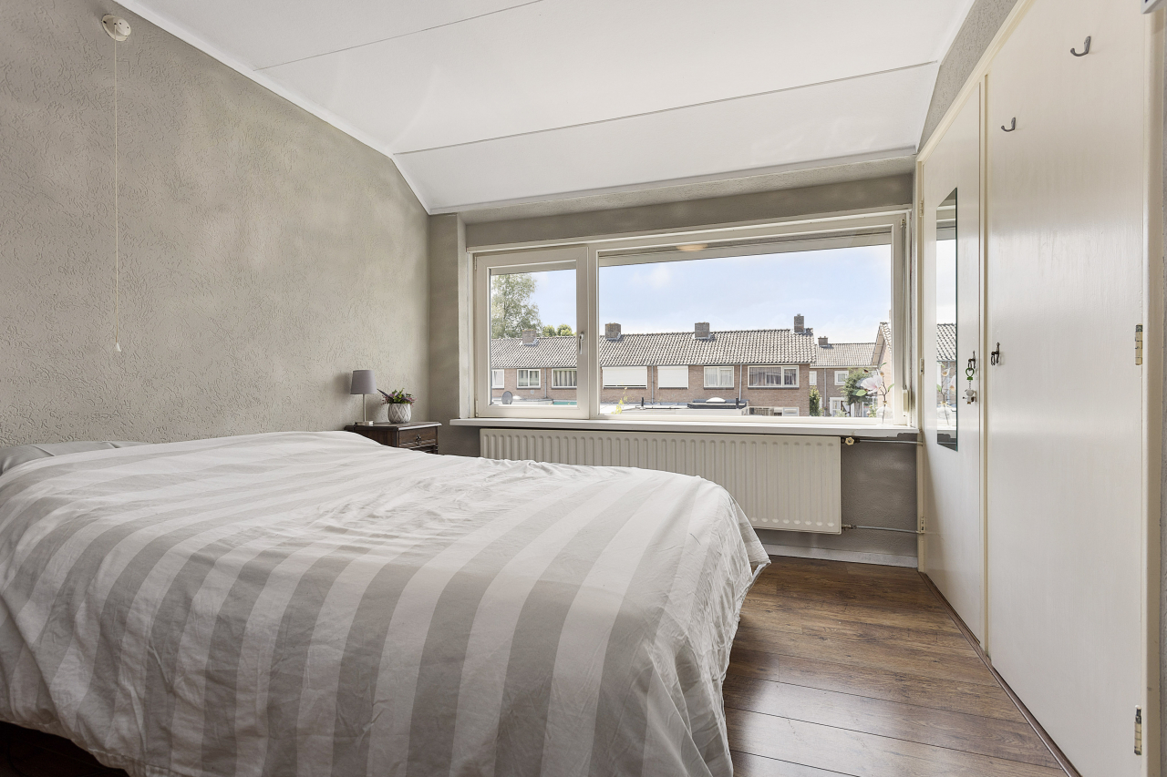 Op de 1e verdieping liggen aan de overloop 3 slaapkamers en de badkamer. Via een vlizotrap is de bergzolder bereikbaar. Aan de voorzijde ligt de slaapkamer met inbouwkast, laminaatvloer en groot raam.Aan de achterzijde ligt de ouderslaapkamer. Deze ouderslaapkamer met laminaatvloer is tevens voorzien van een kunststof kozijn en rolluik.