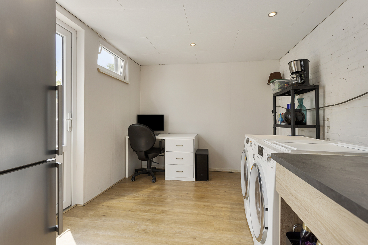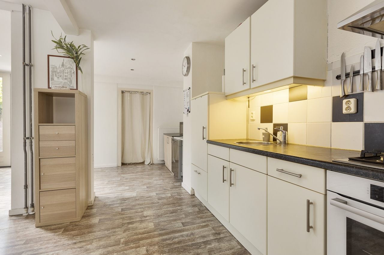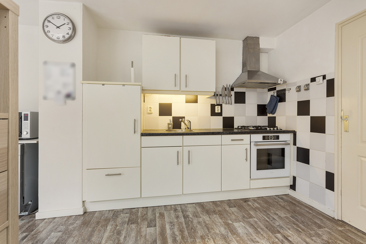 De open keuken met laminaatvloer is voorzien een aanrechtblad met spoelbak, diverse kasten en inbouwapparatuur. Vanuit de keuken en woonkamer is via een doorgang de werkkamer bereikbaar. Deze is ook voorzien van de witgoedaansluitingen en de CV HR ketel (Intergas). Er is een deur met raam naar de tuin/terras. Samen met het raam zorgen deze voor veel lichtinval.