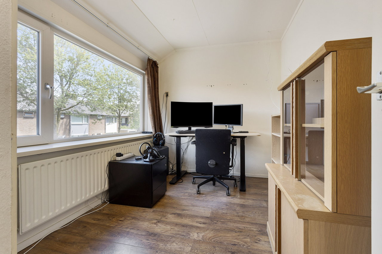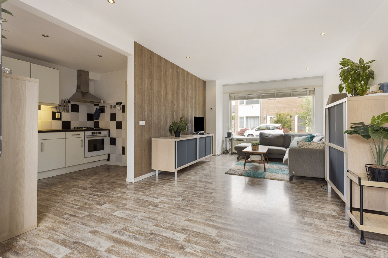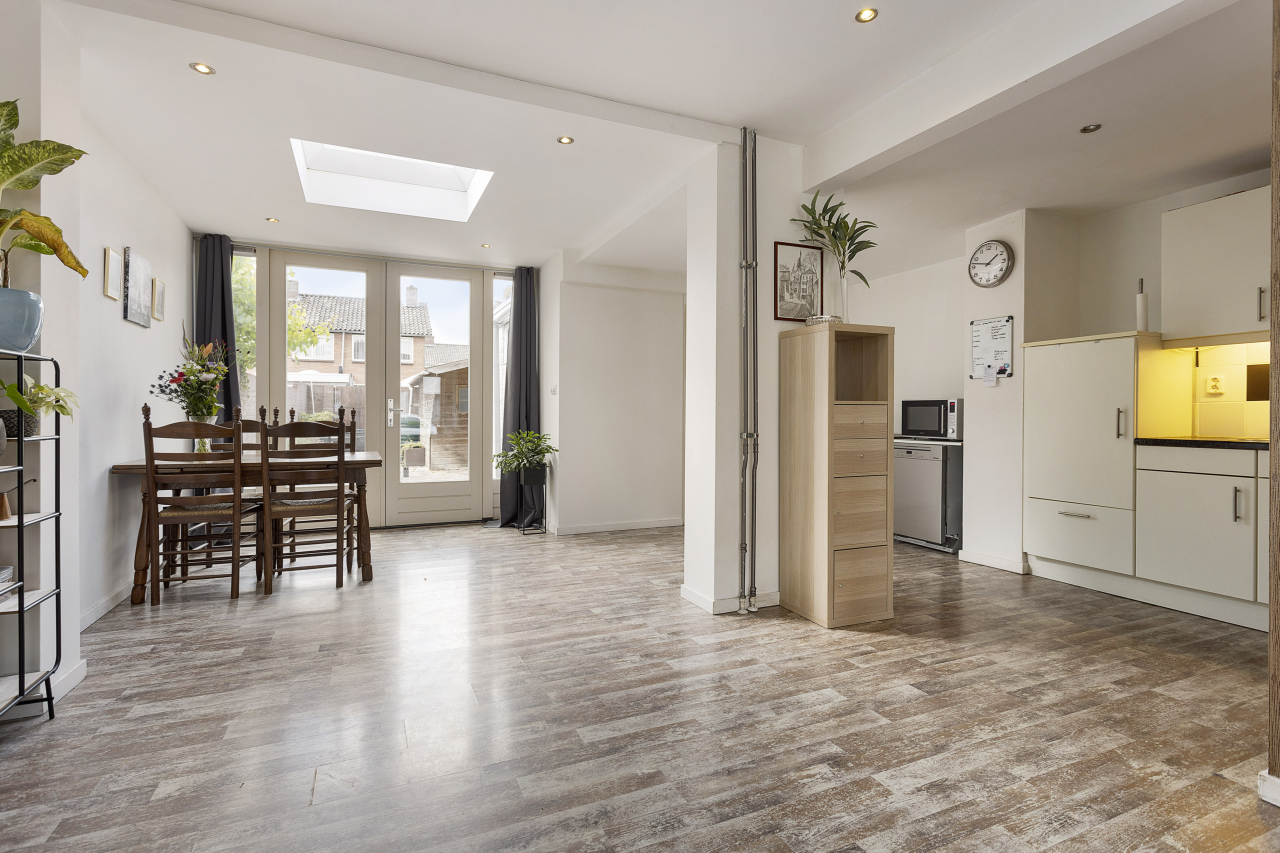 De open keuken met laminaatvloer is voorzien een aanrechtblad met spoelbak, diverse kasten en inbouwapparatuur. Vanuit de keuken en woonkamer is via een doorgang de werkkamer bereikbaar. Deze is ook voorzien van de witgoedaansluitingen en de CV HR ketel (Intergas). Er is een deur met raam naar de tuin/terras. Samen met het raam zorgen deze voor veel lichtinval.