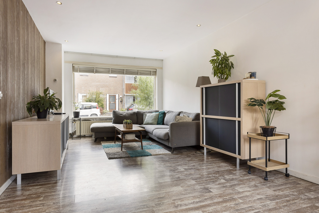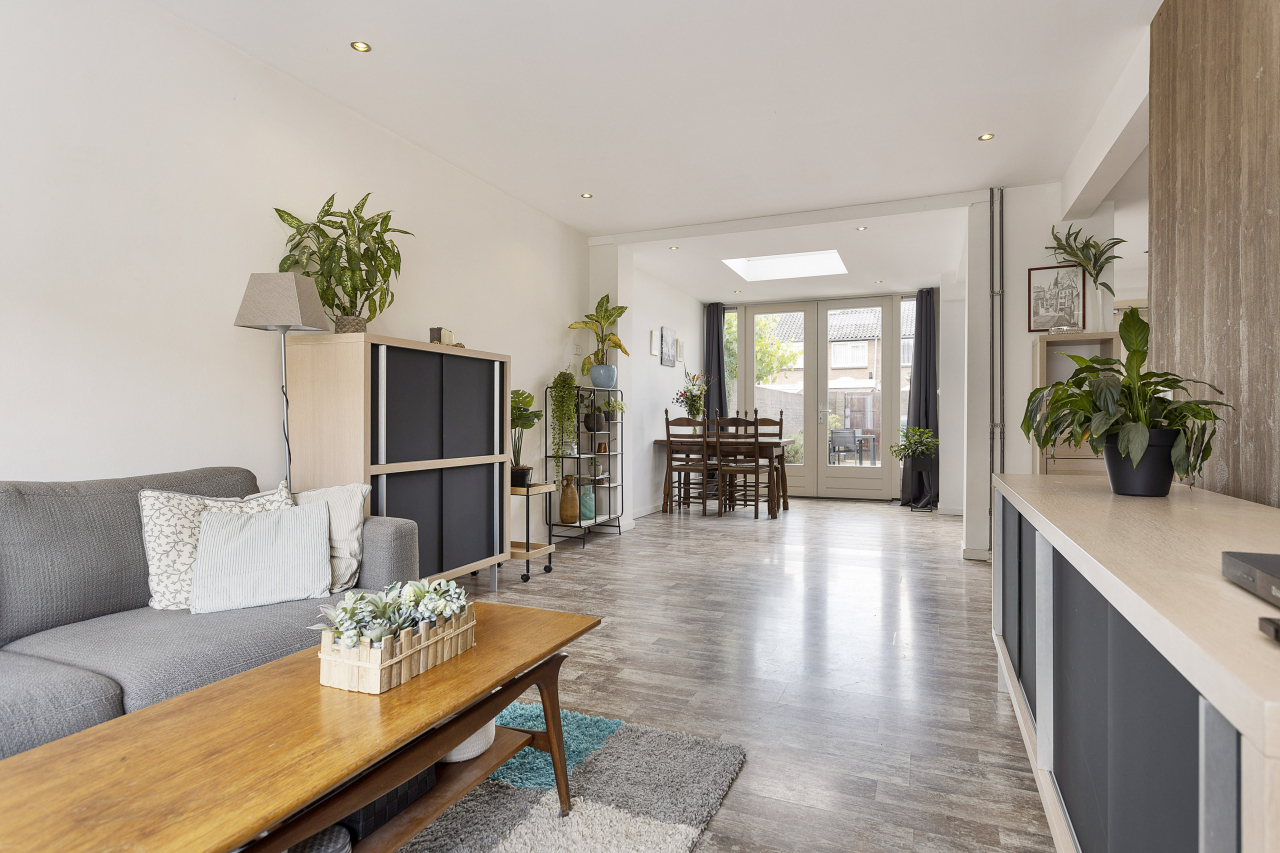Via de hal met laminaatvloer, meterkast, trapopgang, trapkast en toilet met wit /grijze tegels zijn de keuken en woonkamer bereikbaar.De ruime woonkamer heeft een uitbouw aan de achterzijde en is voorzien van een laminaatvloer. Aan de voorzijde is de zithoek met zicht op de voortuin en rustige straat.
